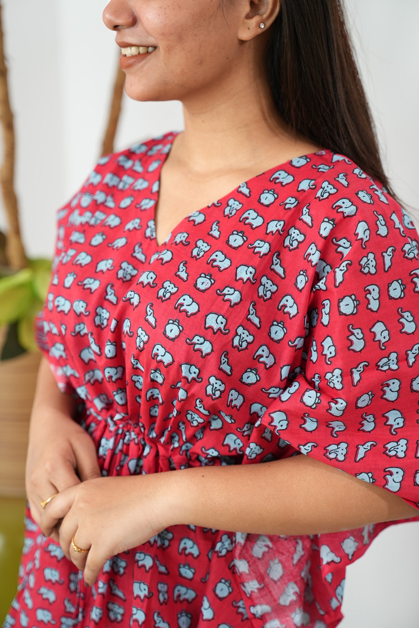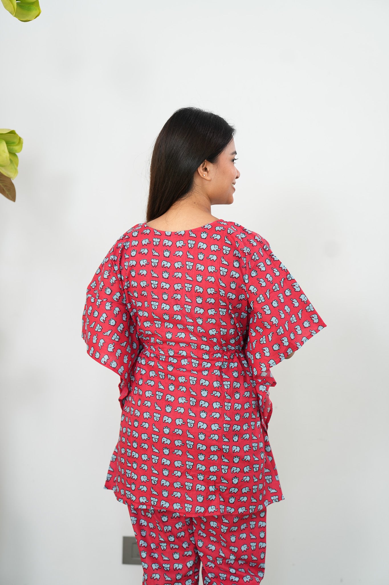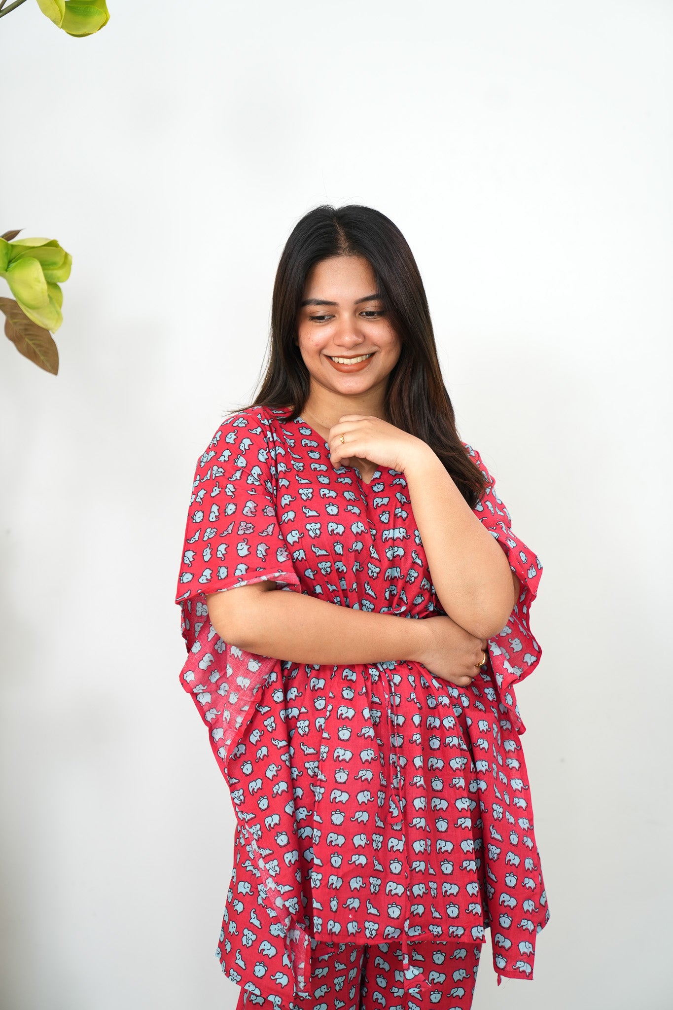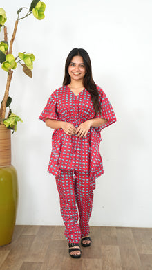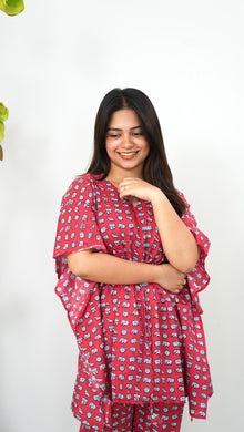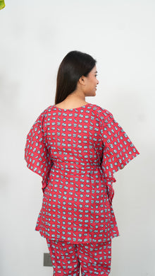 The kaftan top has a centre tie which can be tied to cinch the waist. It is paired with matching straight pants . It comes with half elastic and with front tie in the pants.