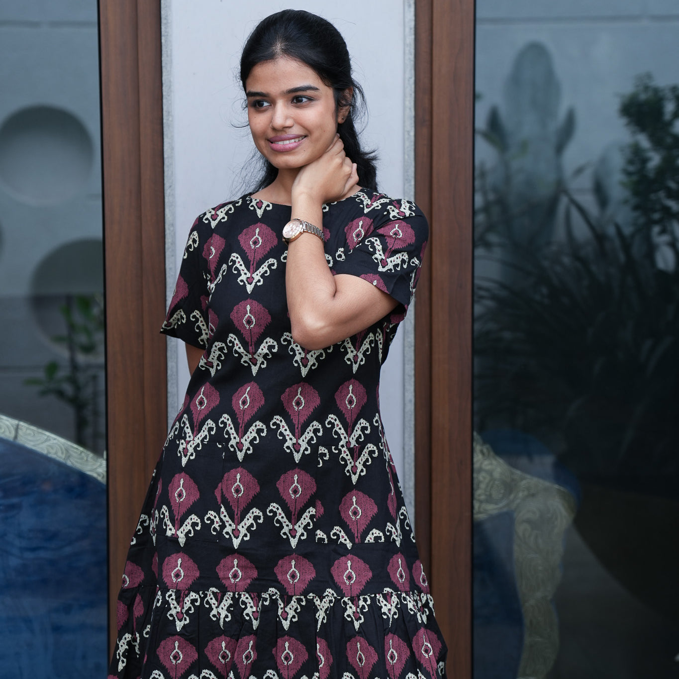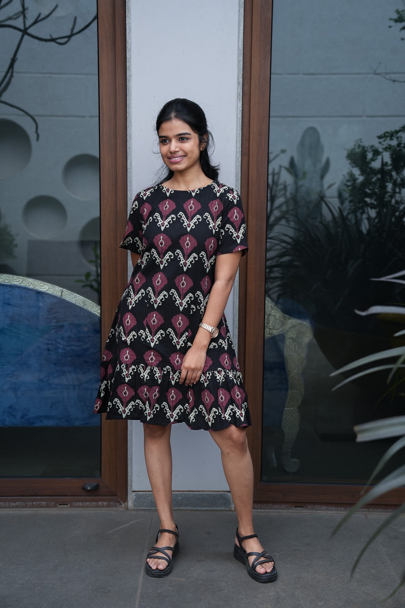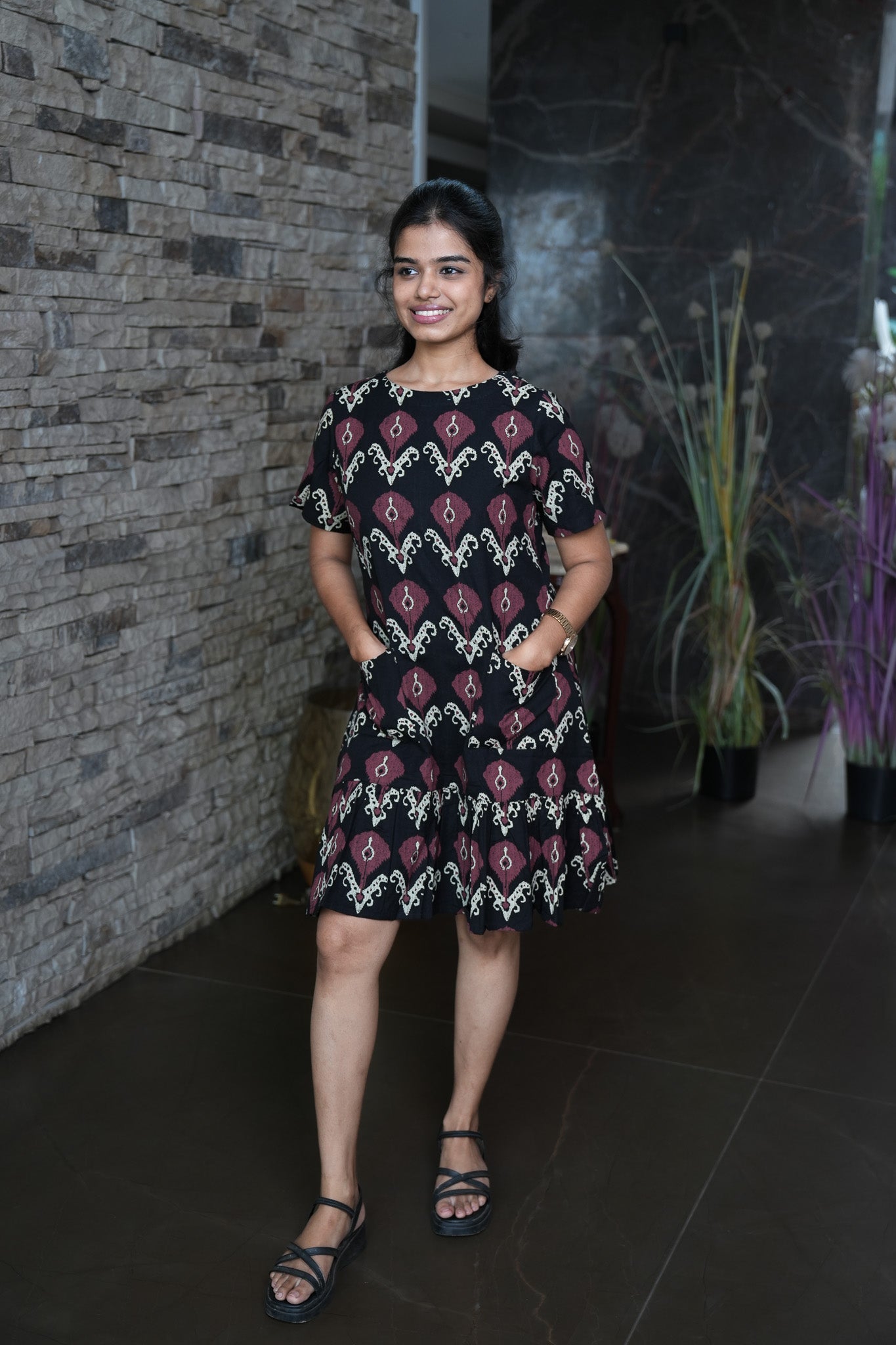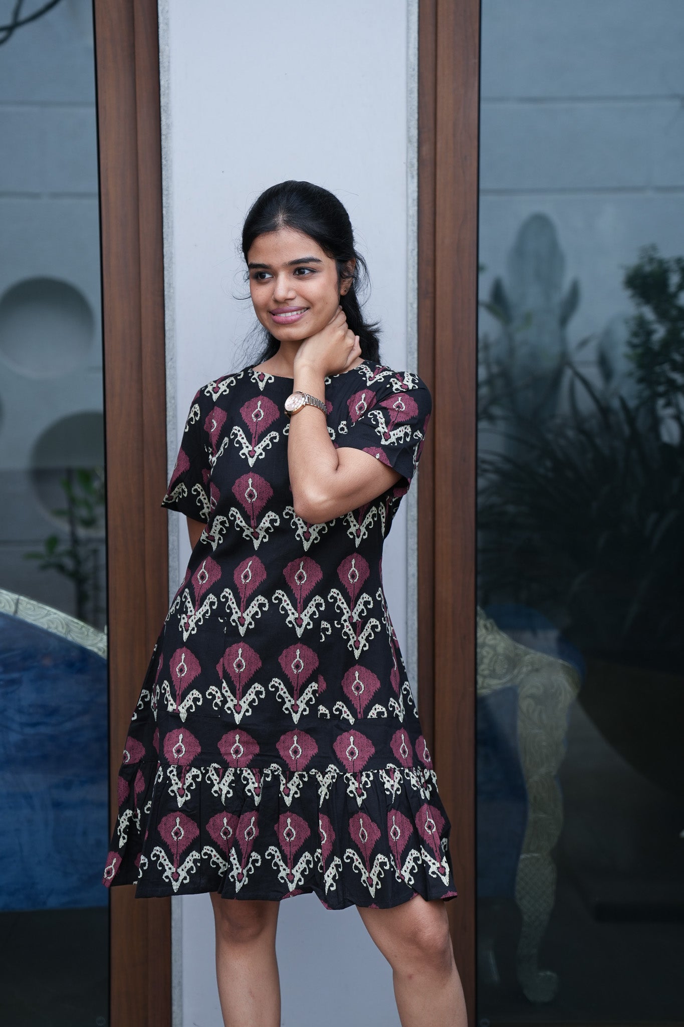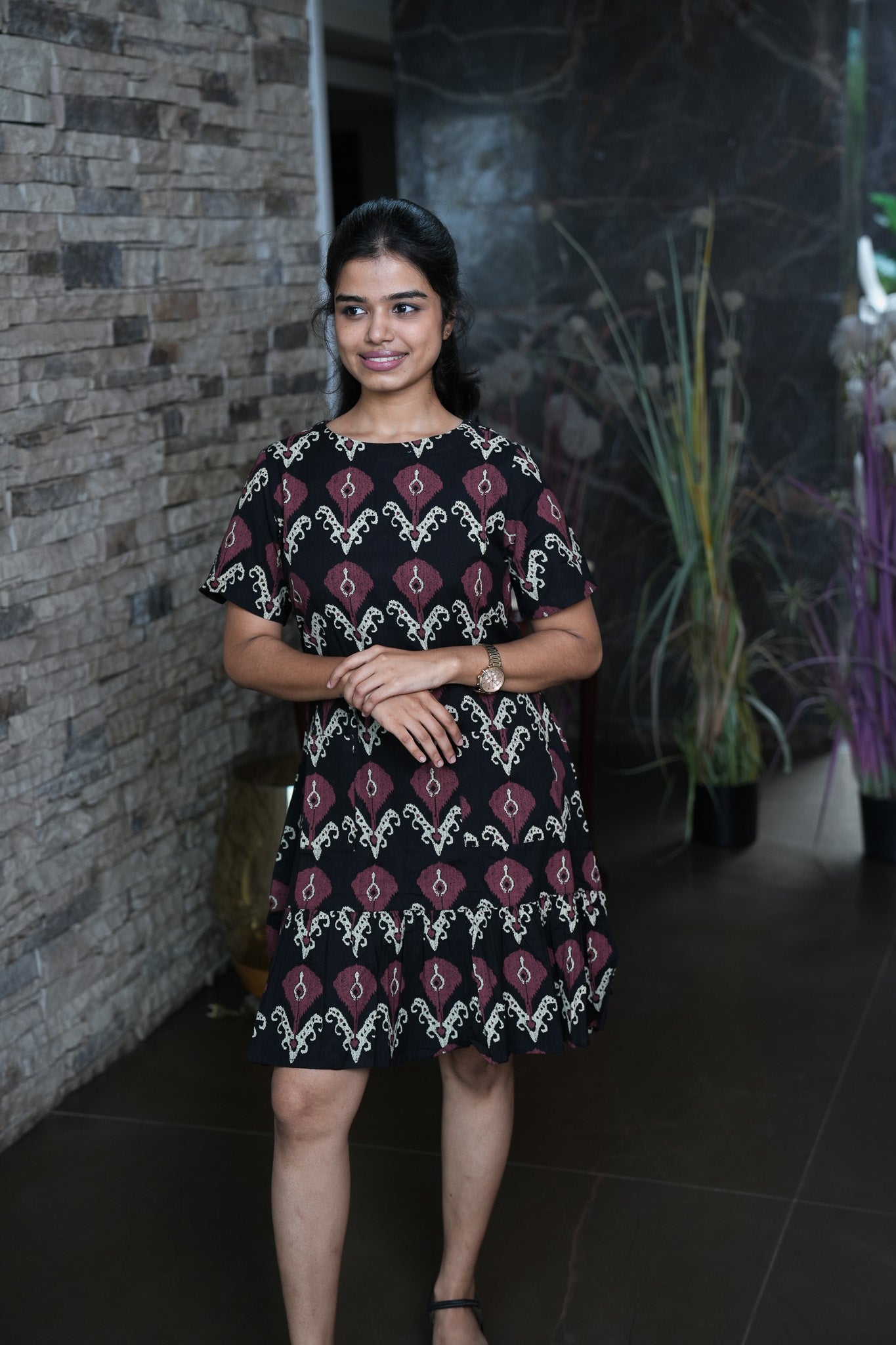 Black and maroon hand block prints cotton dress with half sleeves and round neck. The fabric and prints are top notch.. which are perfect for brunch, shopping or just a cozy day at home!! you can wear just as a dress or add jeans to add some modesty whichever you find it suitable and comfortable..