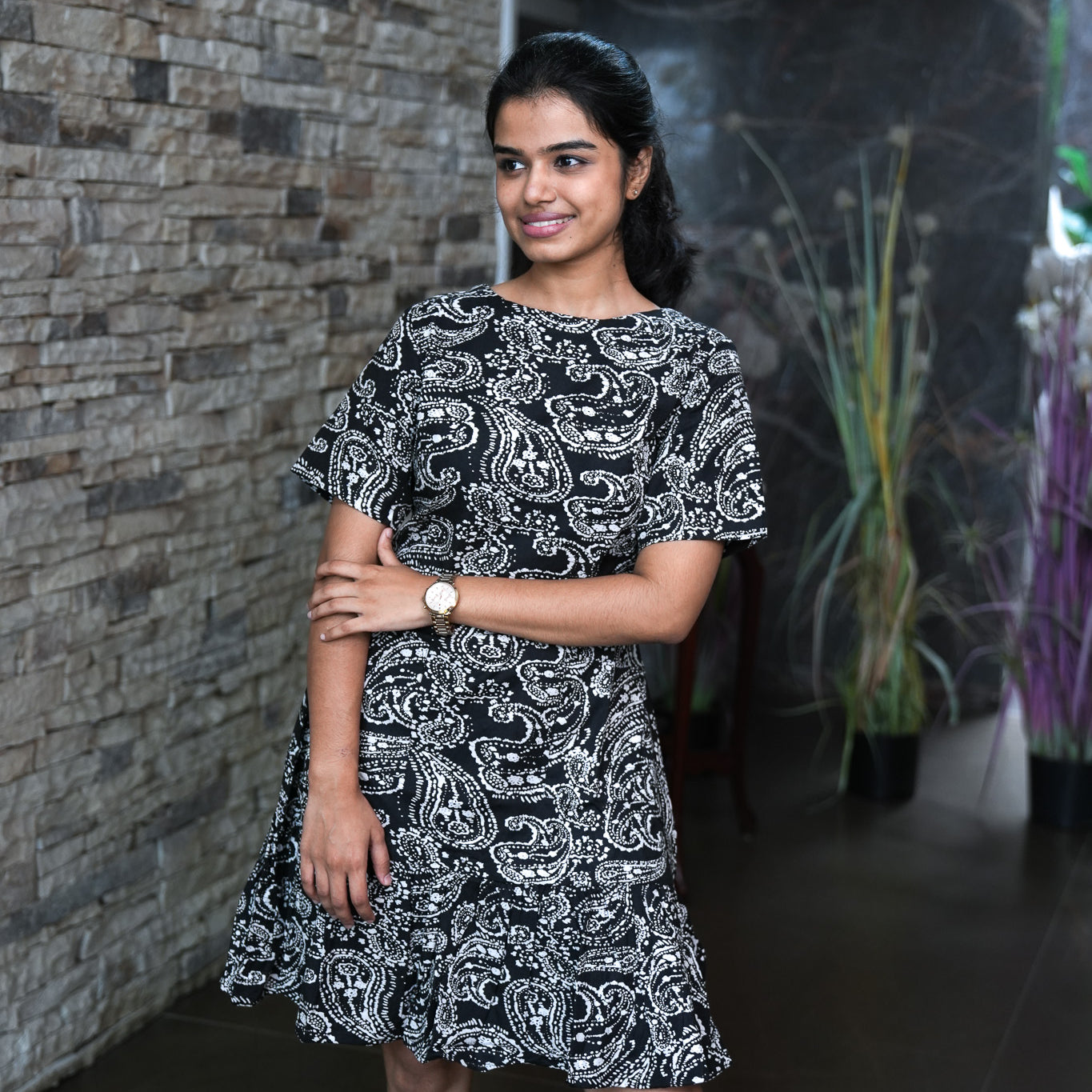 Black and white abstract prints cotton dress with half sleeves and round neck. The fabric and prints are top notch.. which are perfect for brunch, shopping or just a cozy day at home!! you can wear just as a dress or add jeans to add some modesty whichever you find it suitable and comfortable..