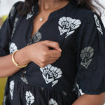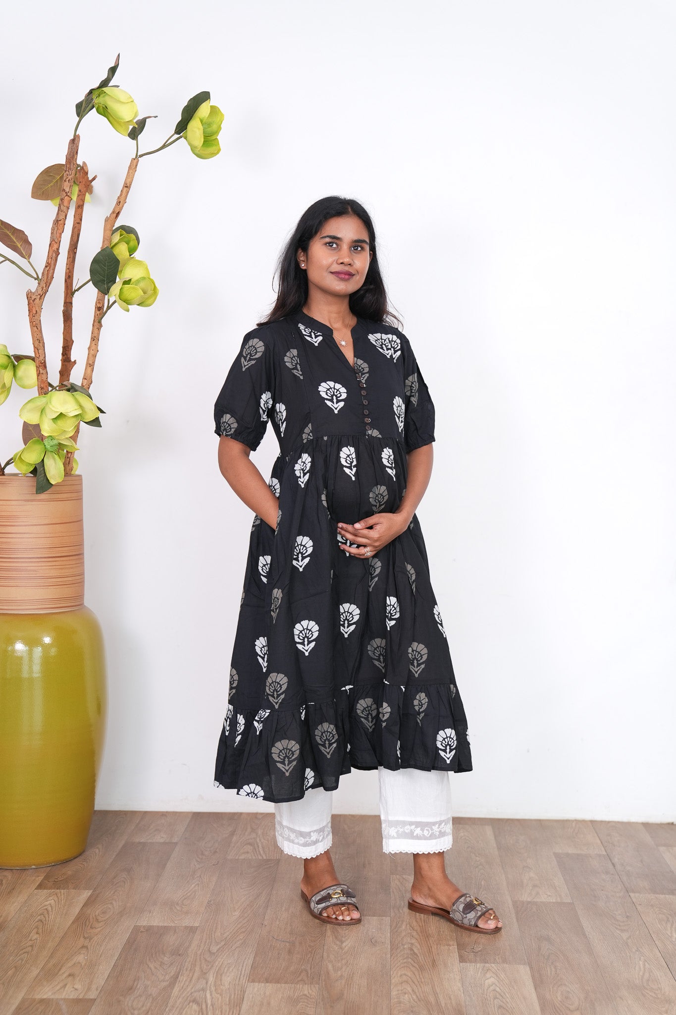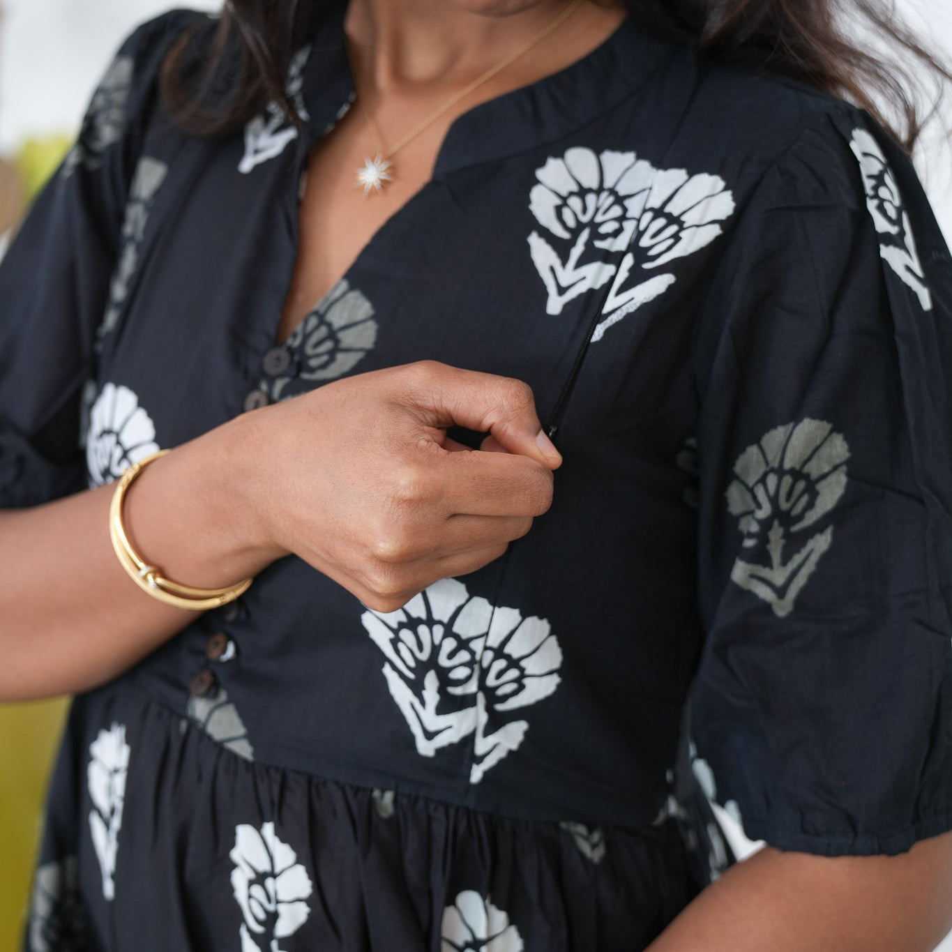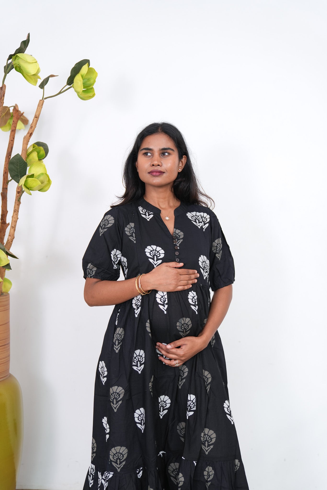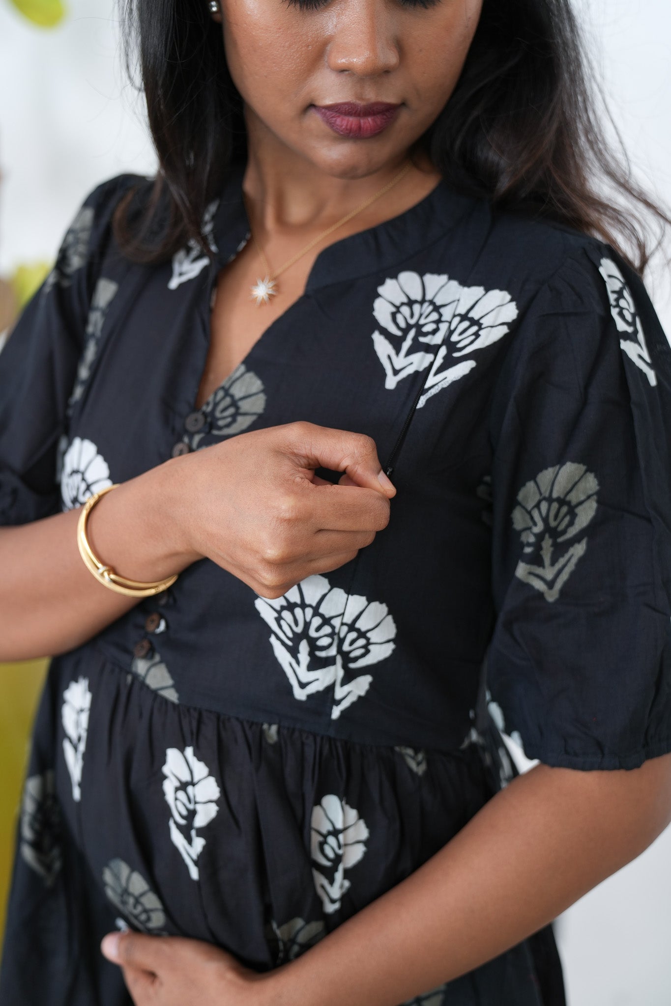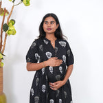 Black cotton maternity nursing midi dress with mandarin neck and balloon sleeves that accomodates the bump throughout nine months and has invisible zip on both sides to carefully feed baby. It is light weight and soft to help you get through pregnancy and breastfeeding journey with ease.