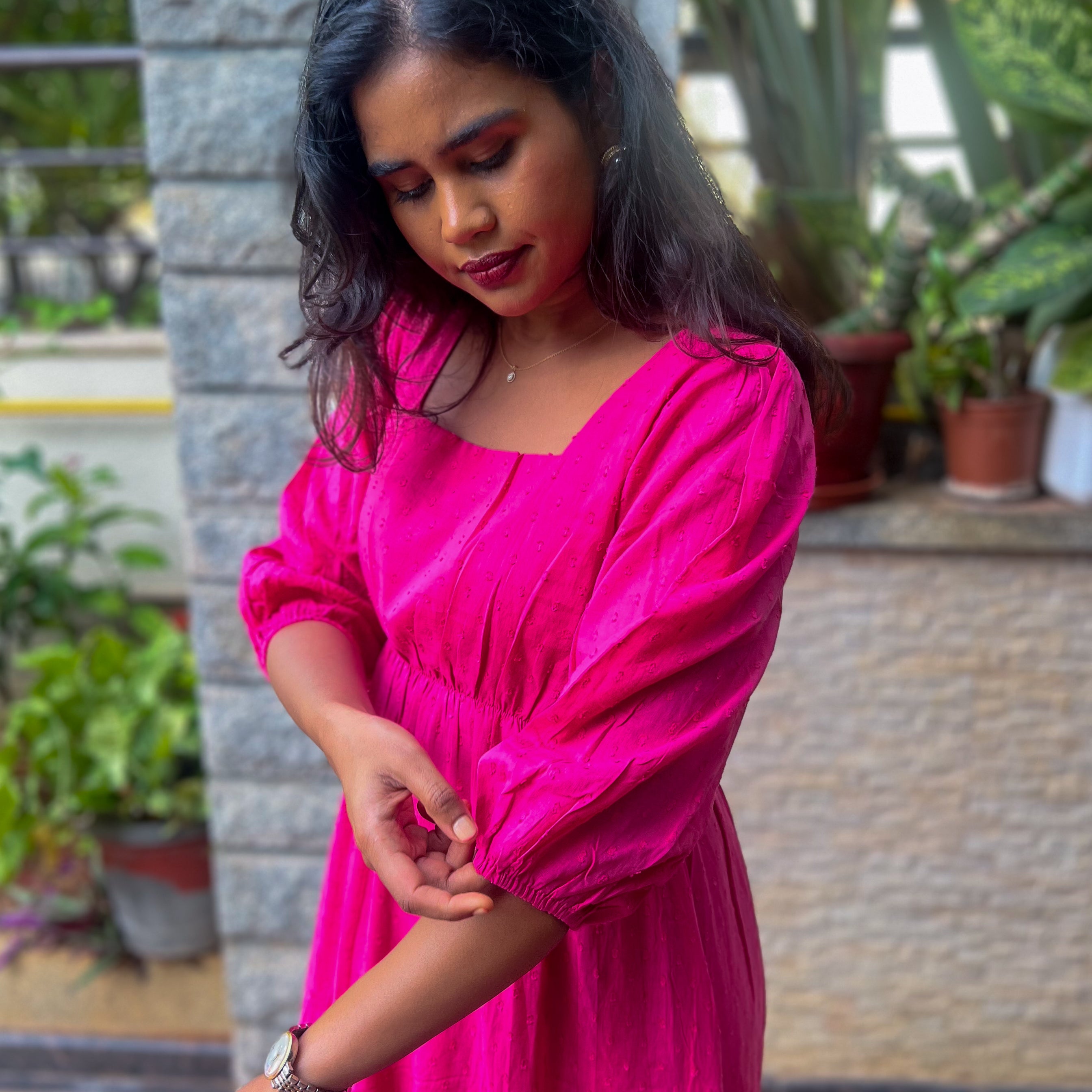 Pink cotton midi dress with square neck and balloon sleeves. It has self dobby pattern along the dress.