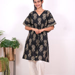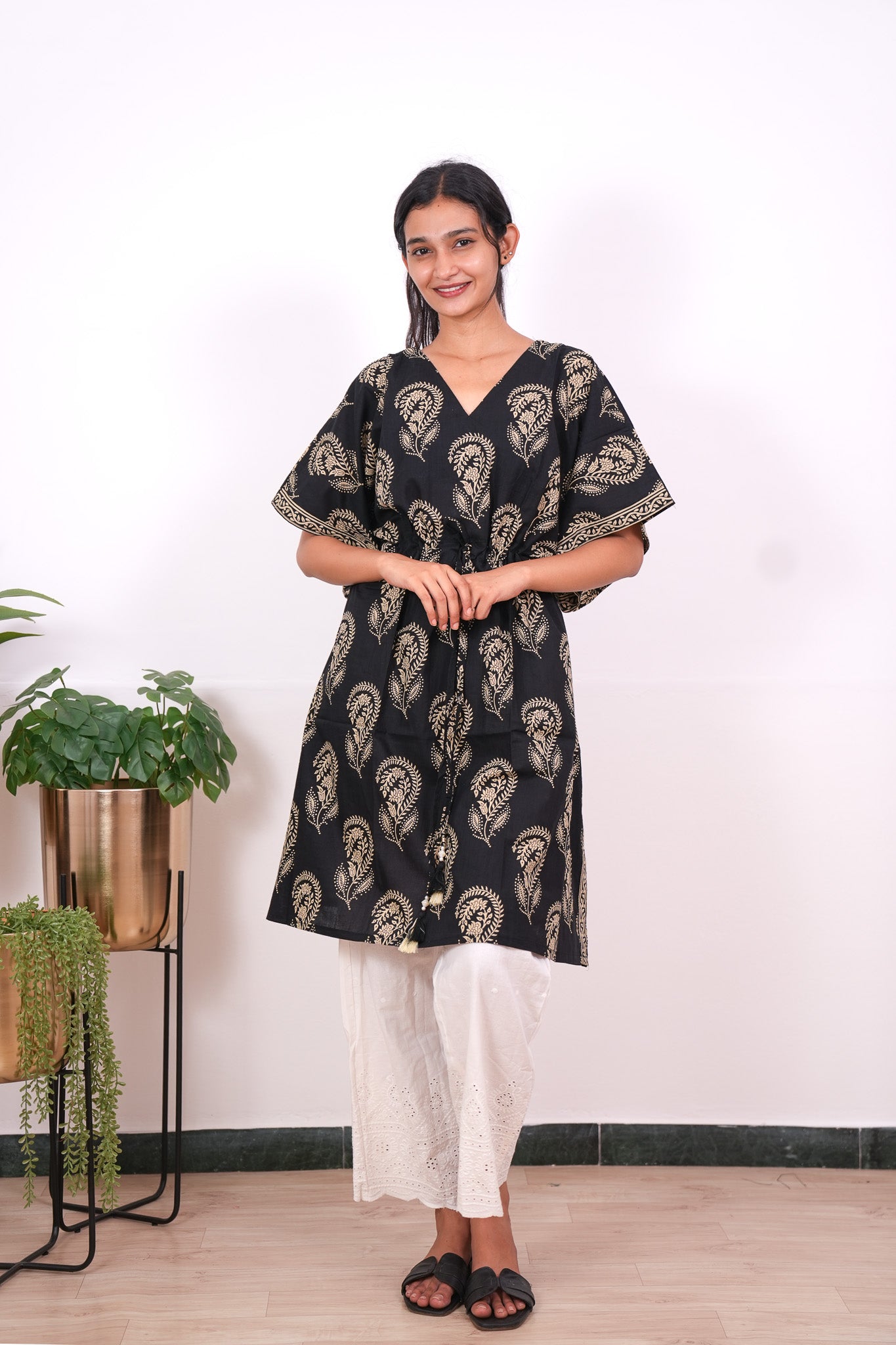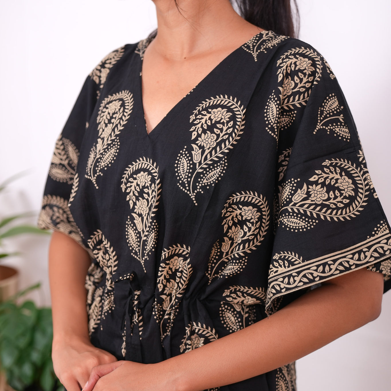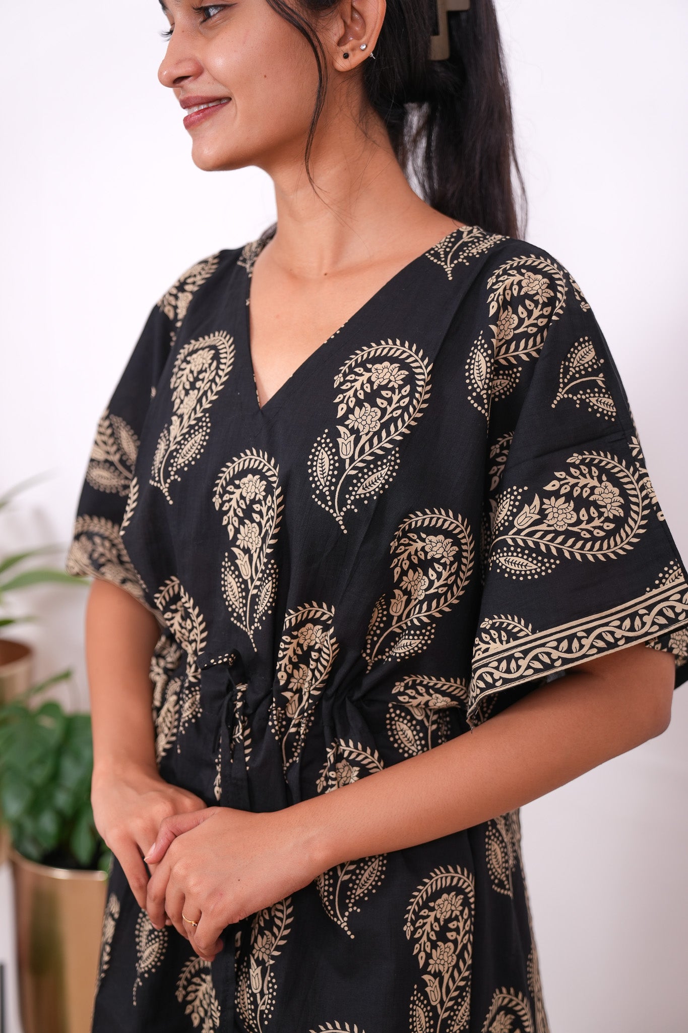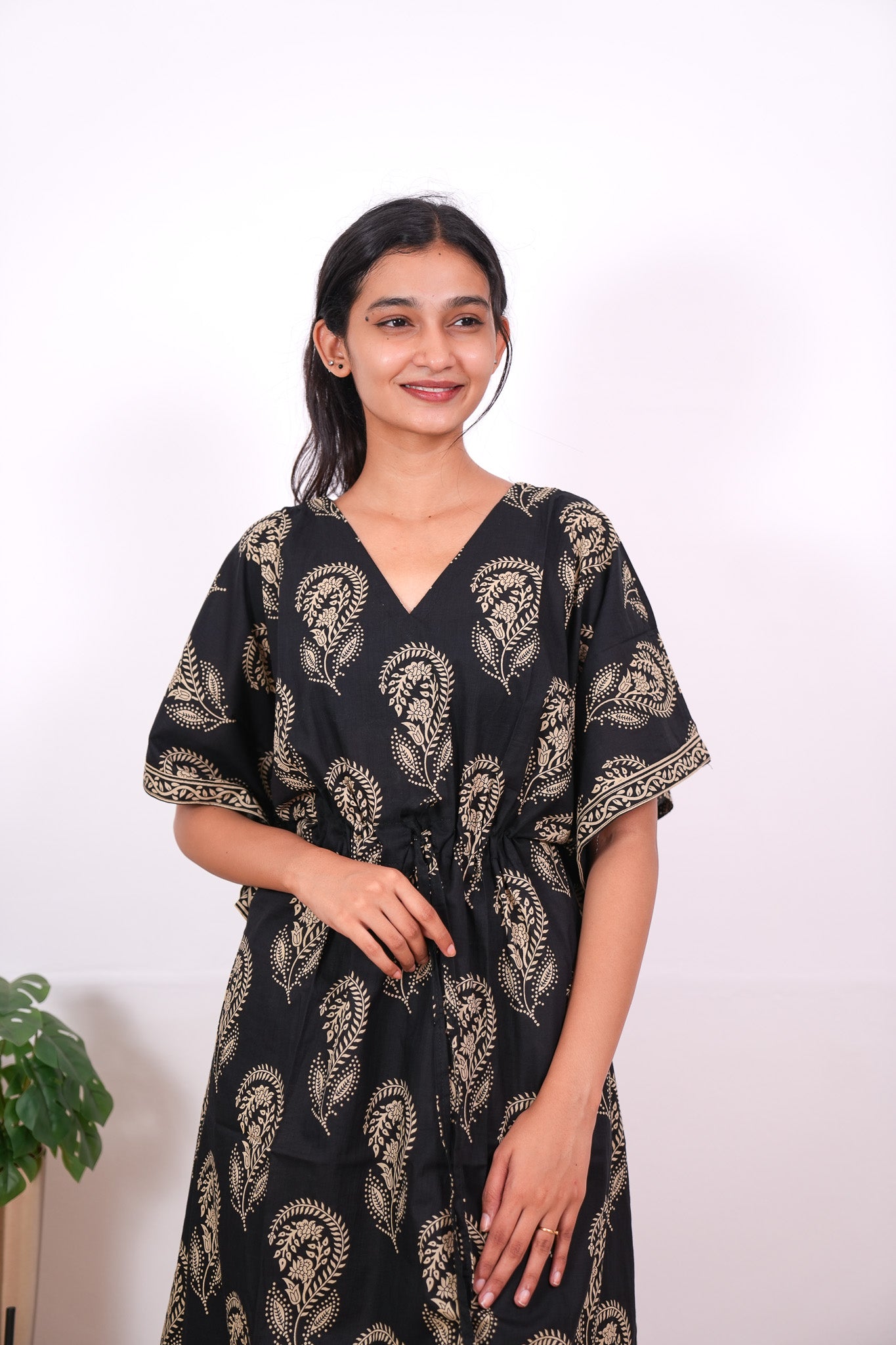 Easy breezy cotton kaftan made for you to feel absolute comfort, elegance and a total stunner at the same time. It comes V neck and tie in the centre with flowy silhouette and floral prints all over.