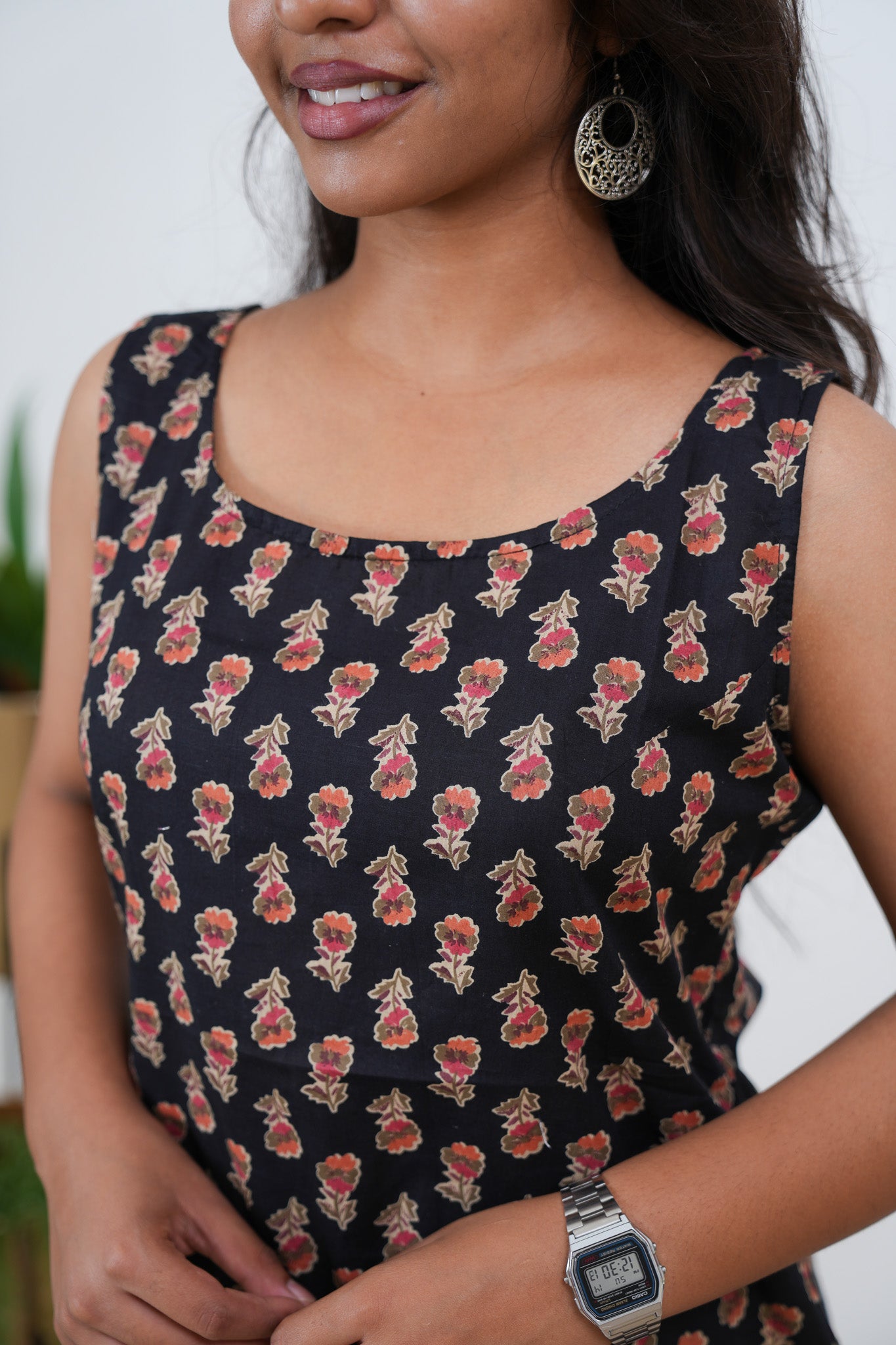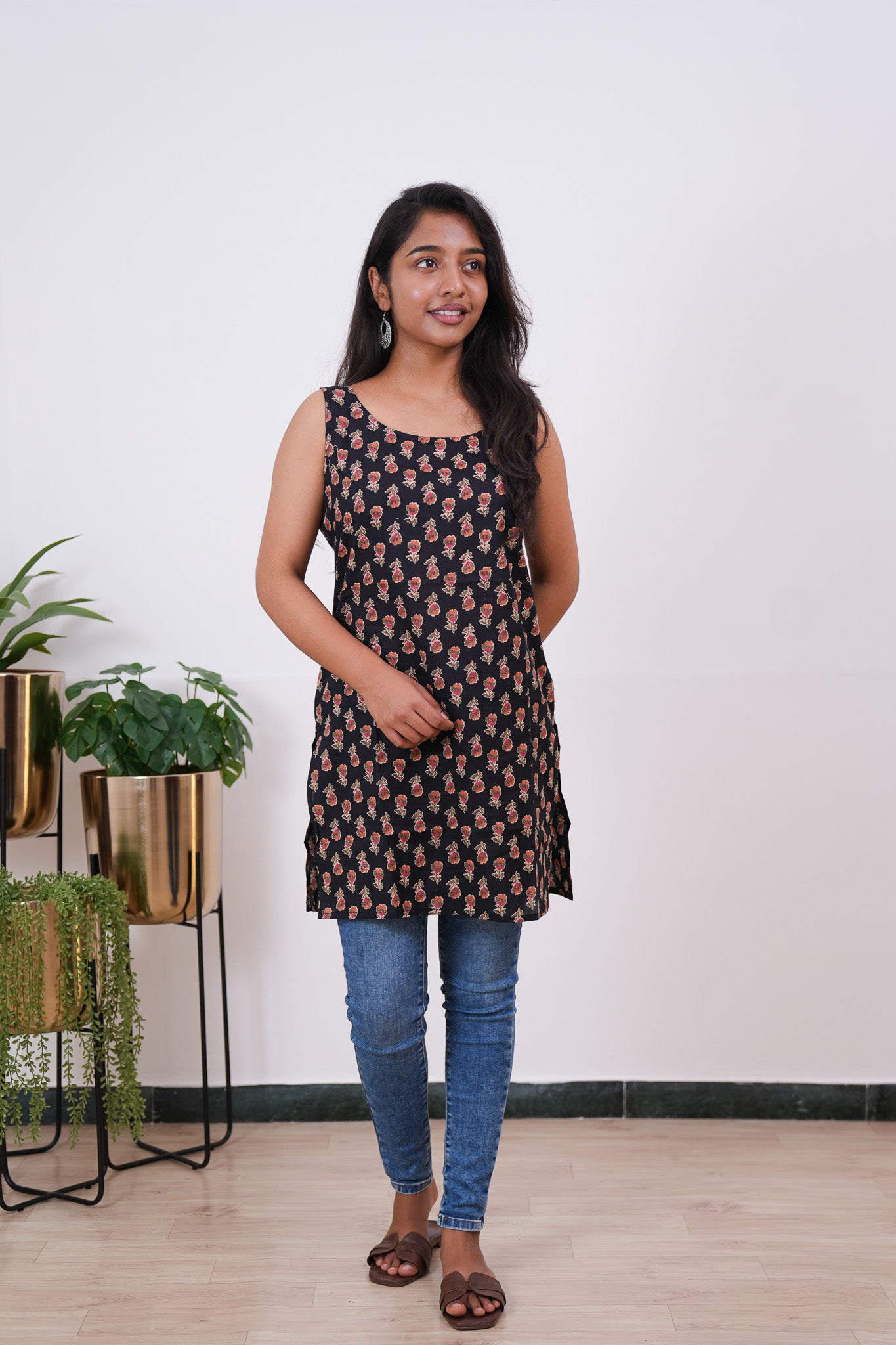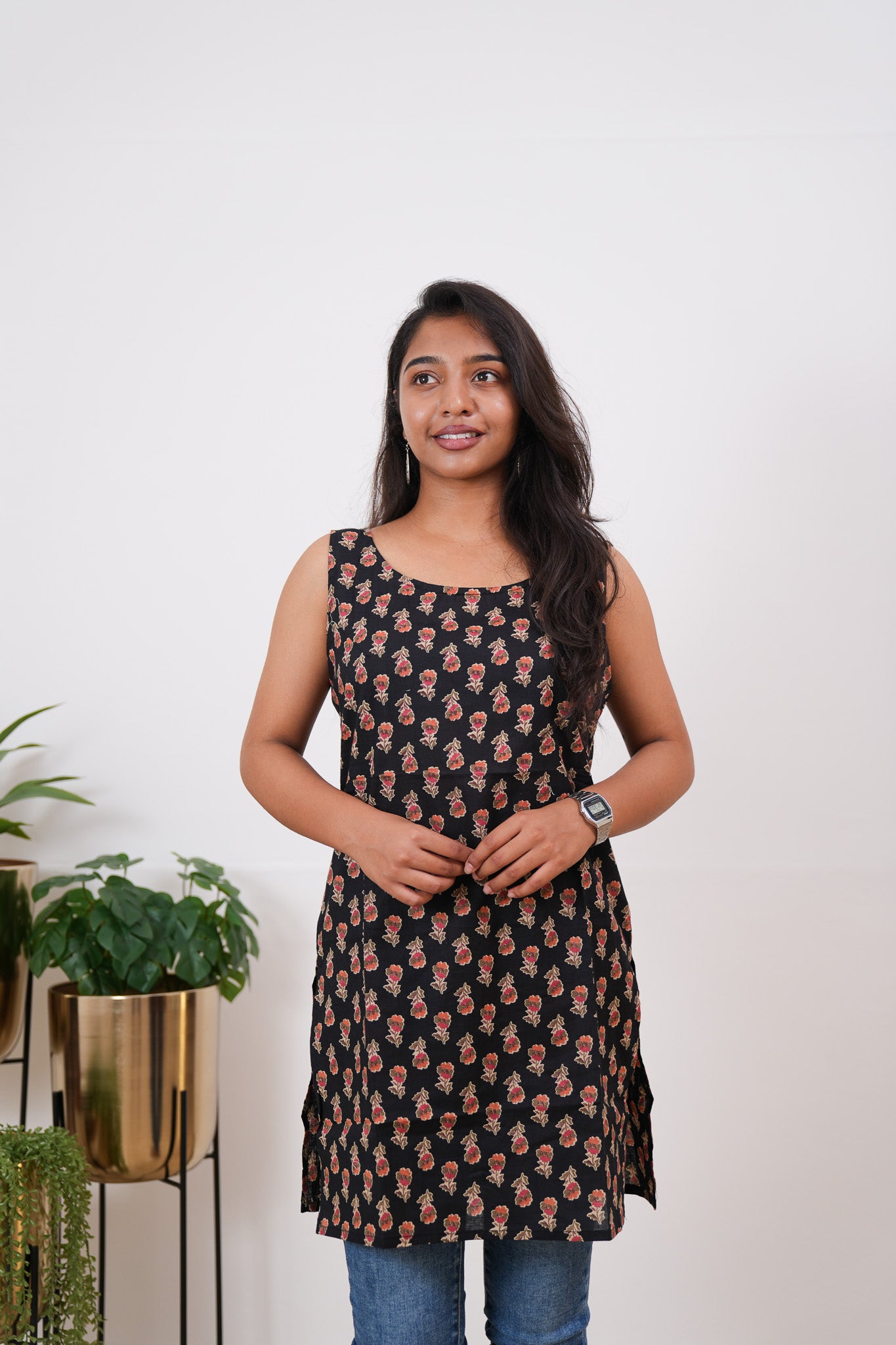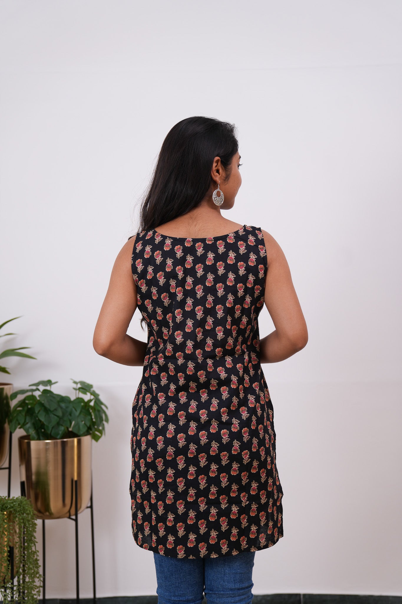 The tunic has round neck and it is sleeveless. It has beautiful floral pattern all over the top.  It can be paired with jeans or skirt to complete the look.