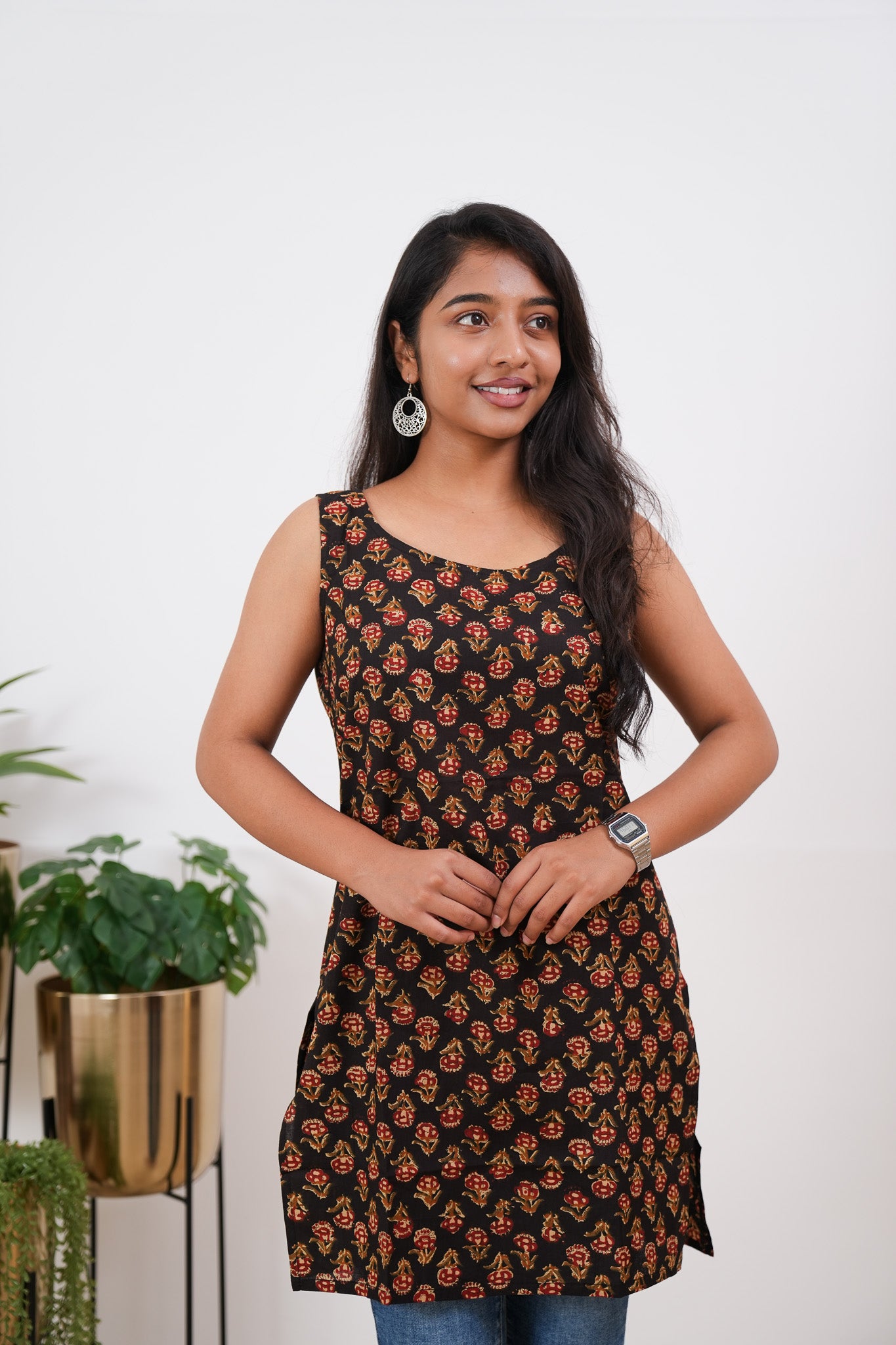 The tunic has round neck and it is sleeveless. It has beautiful floral pattern all over the top.  It can be paired with jeans or skirt to complete the look.