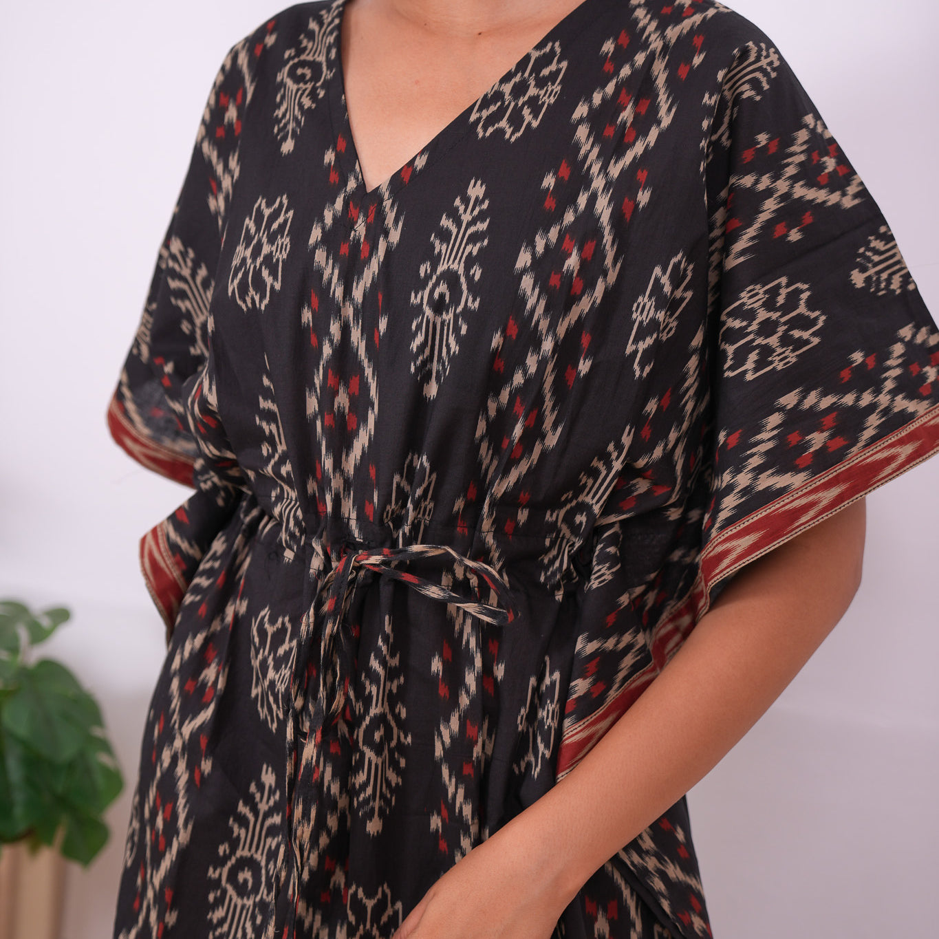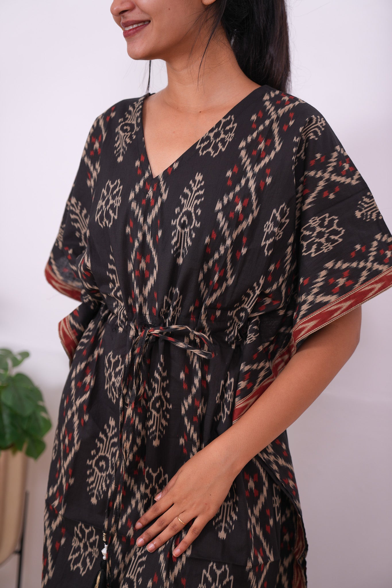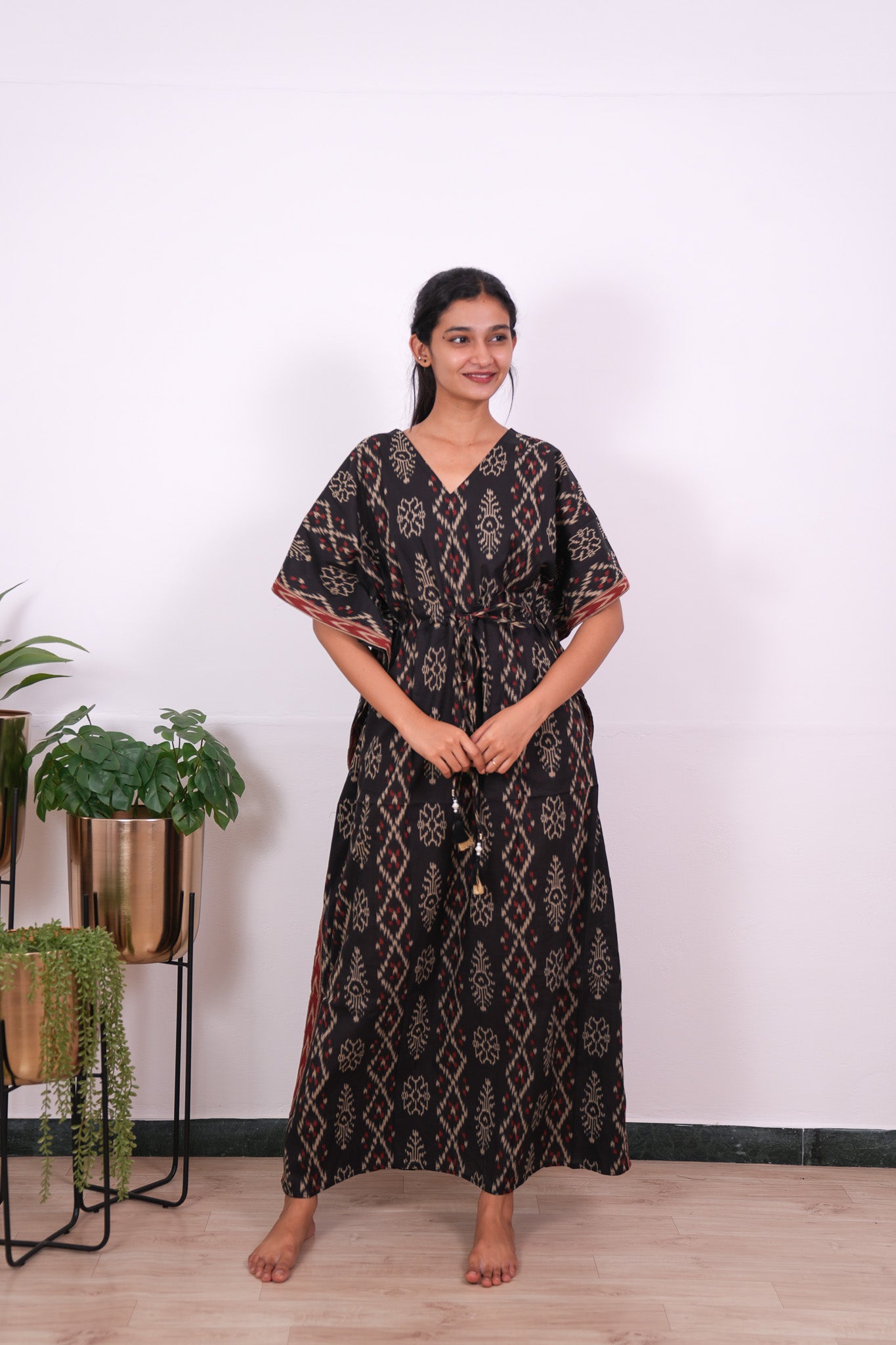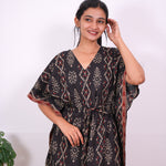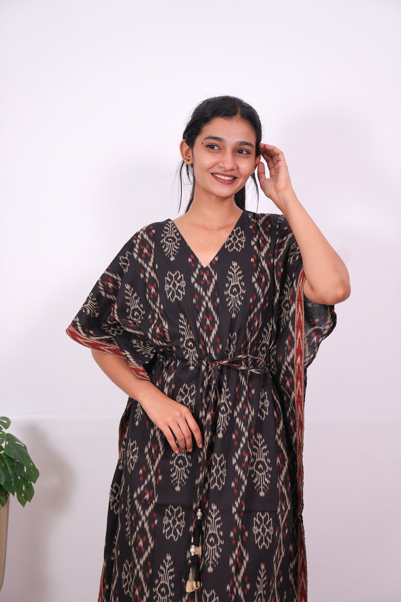 Easy breezy cotton kaftan made for you to feel absolute comfort, elegance and a total stunner at the same time. It comes V neck and tie in the centre with flowy silhouette and floral prints all over.