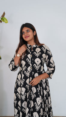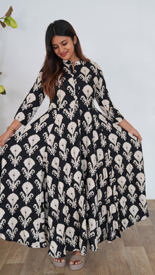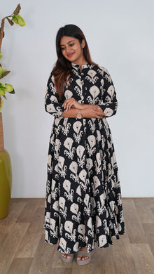 Black geometric long gown that exudes elegance and sophistication. It has small mirror work throughout the gown.