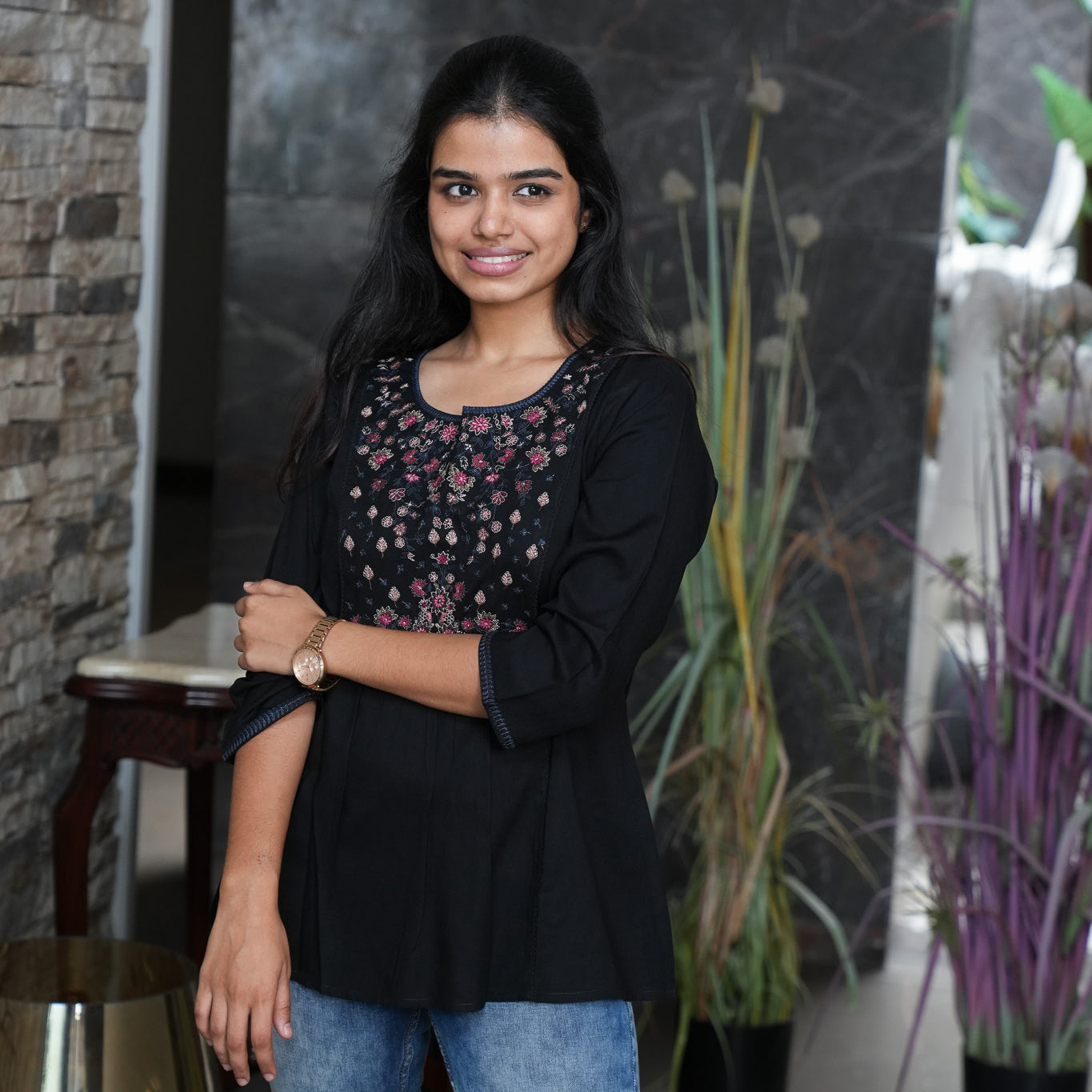 Black hand embroidered cotton top with round neck and elbow length sleeves. These are so chic, comfortable and luxurious at the same time. Pair it with denim or cotton pants and the look is complete!!