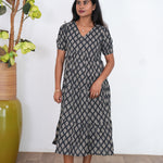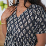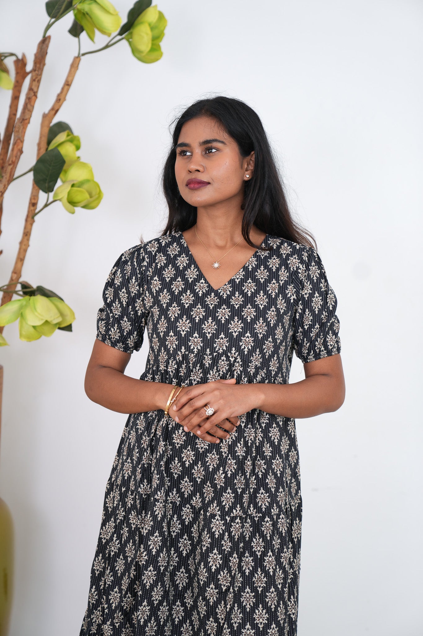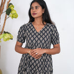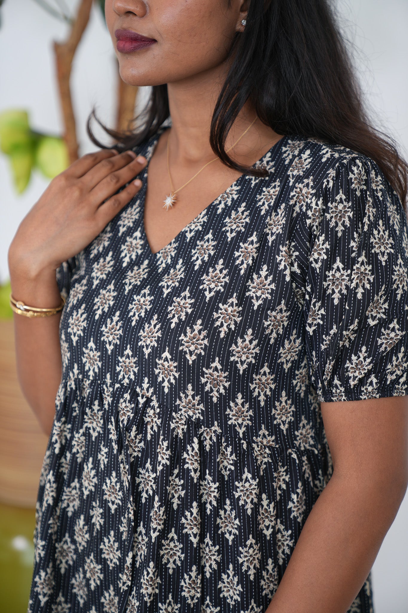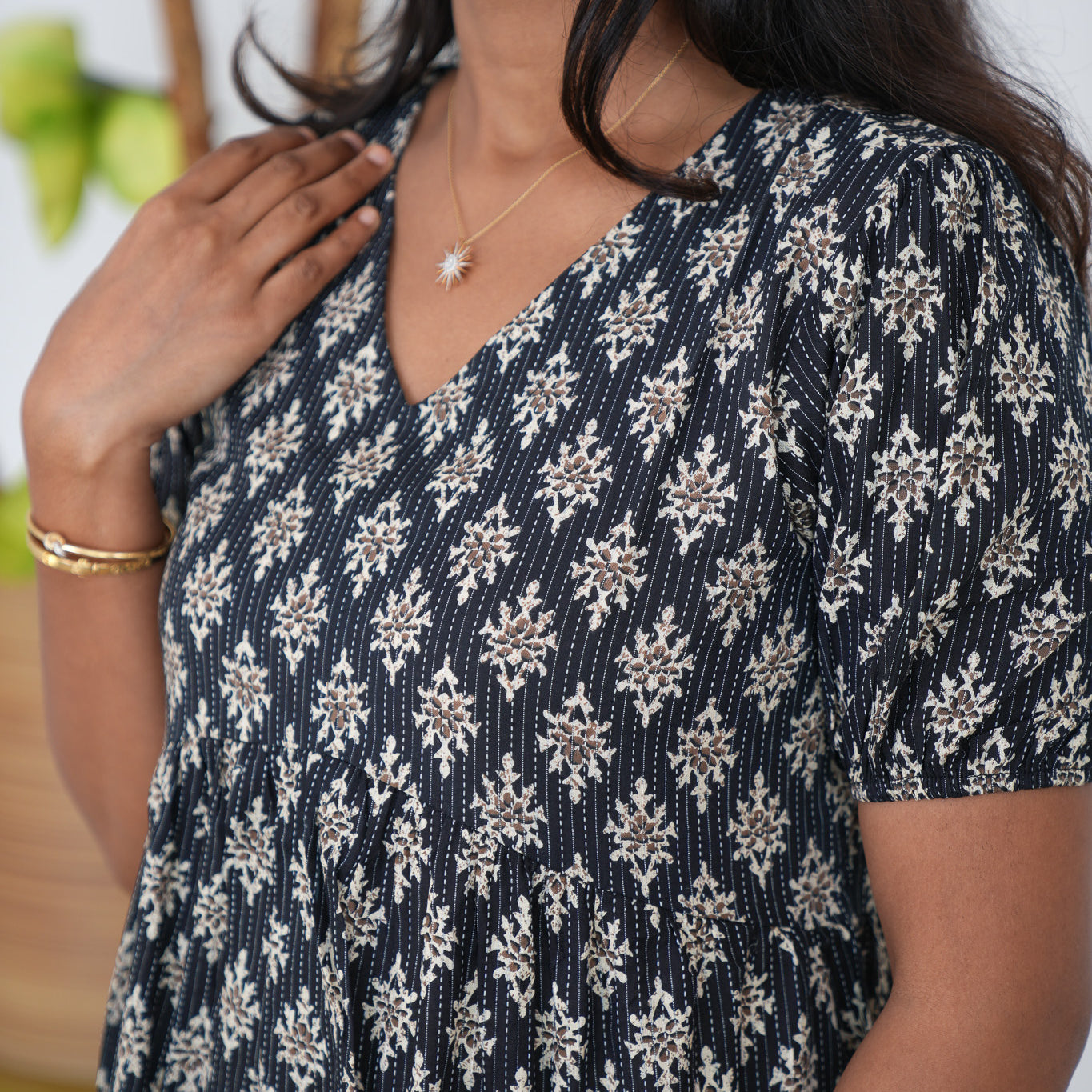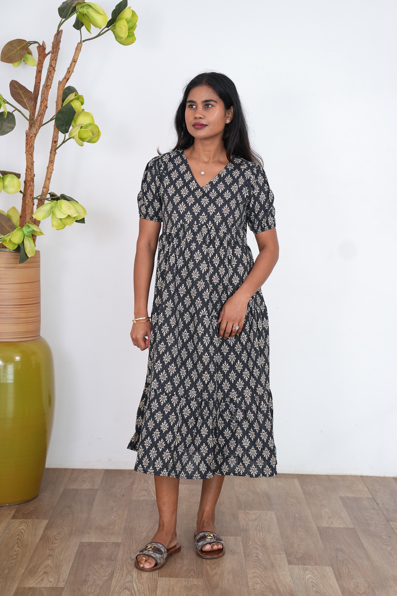 Black katha cotton dress with V neck and balloon sleeves. It has floral print all over the dress.