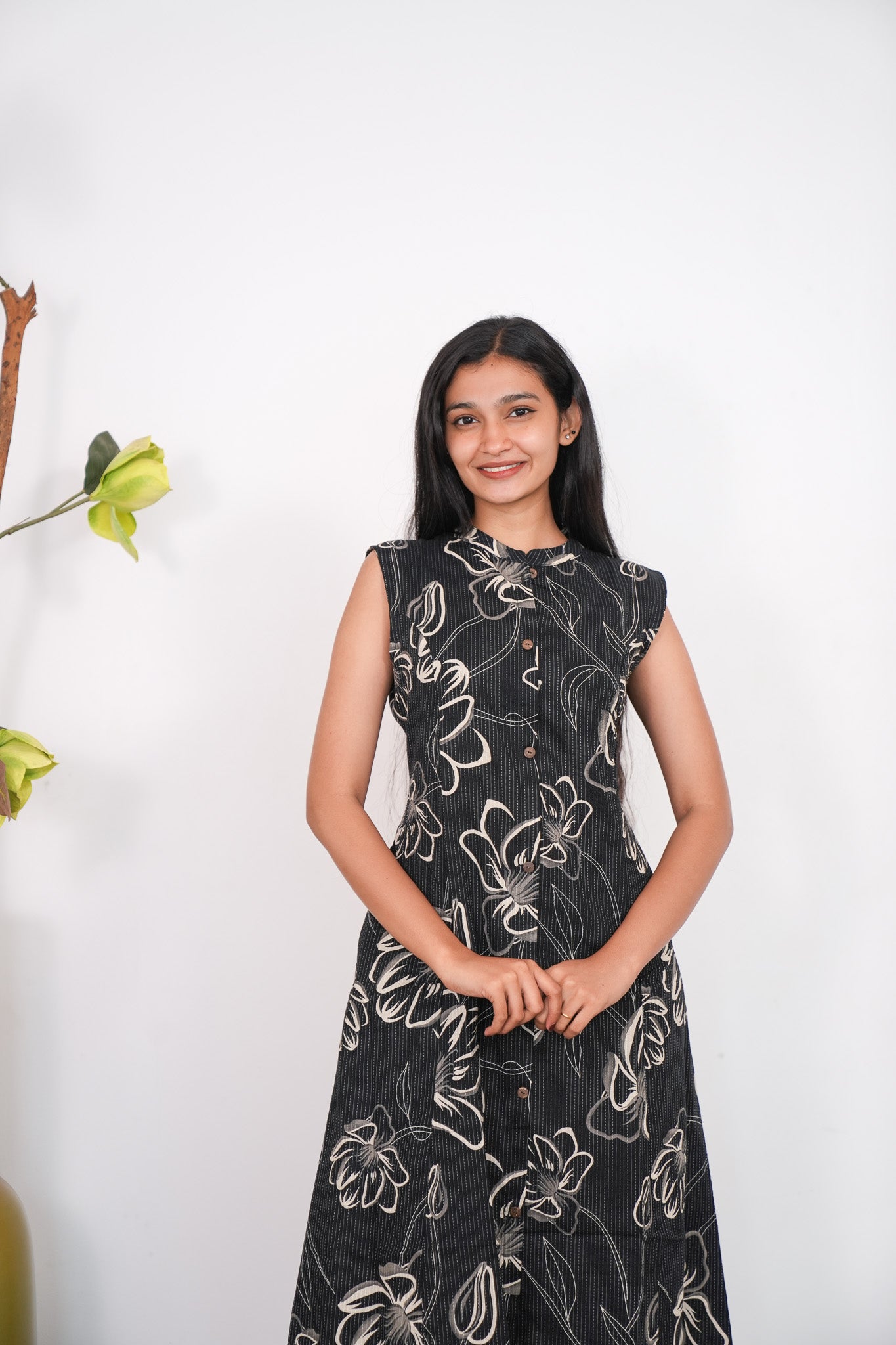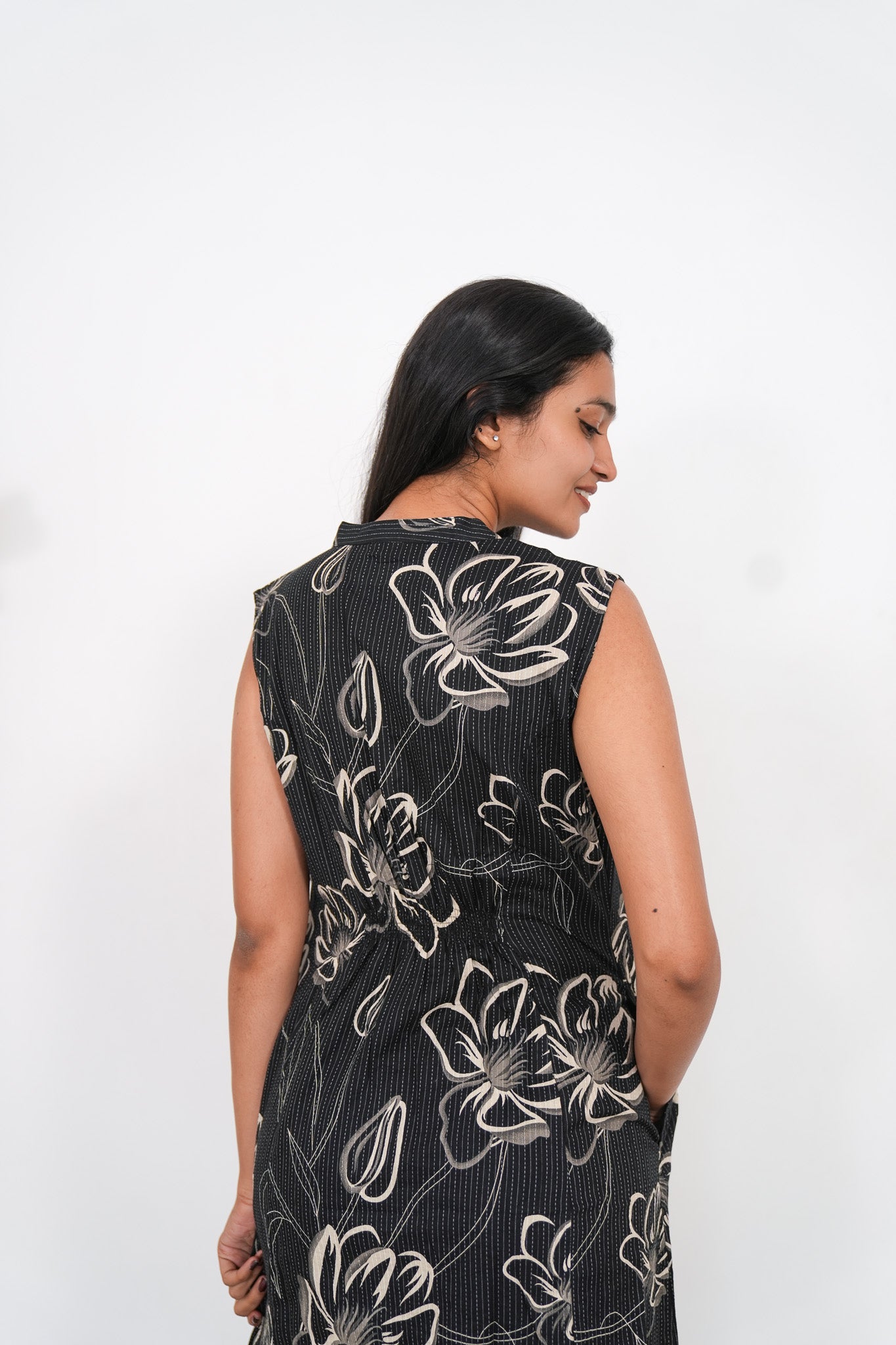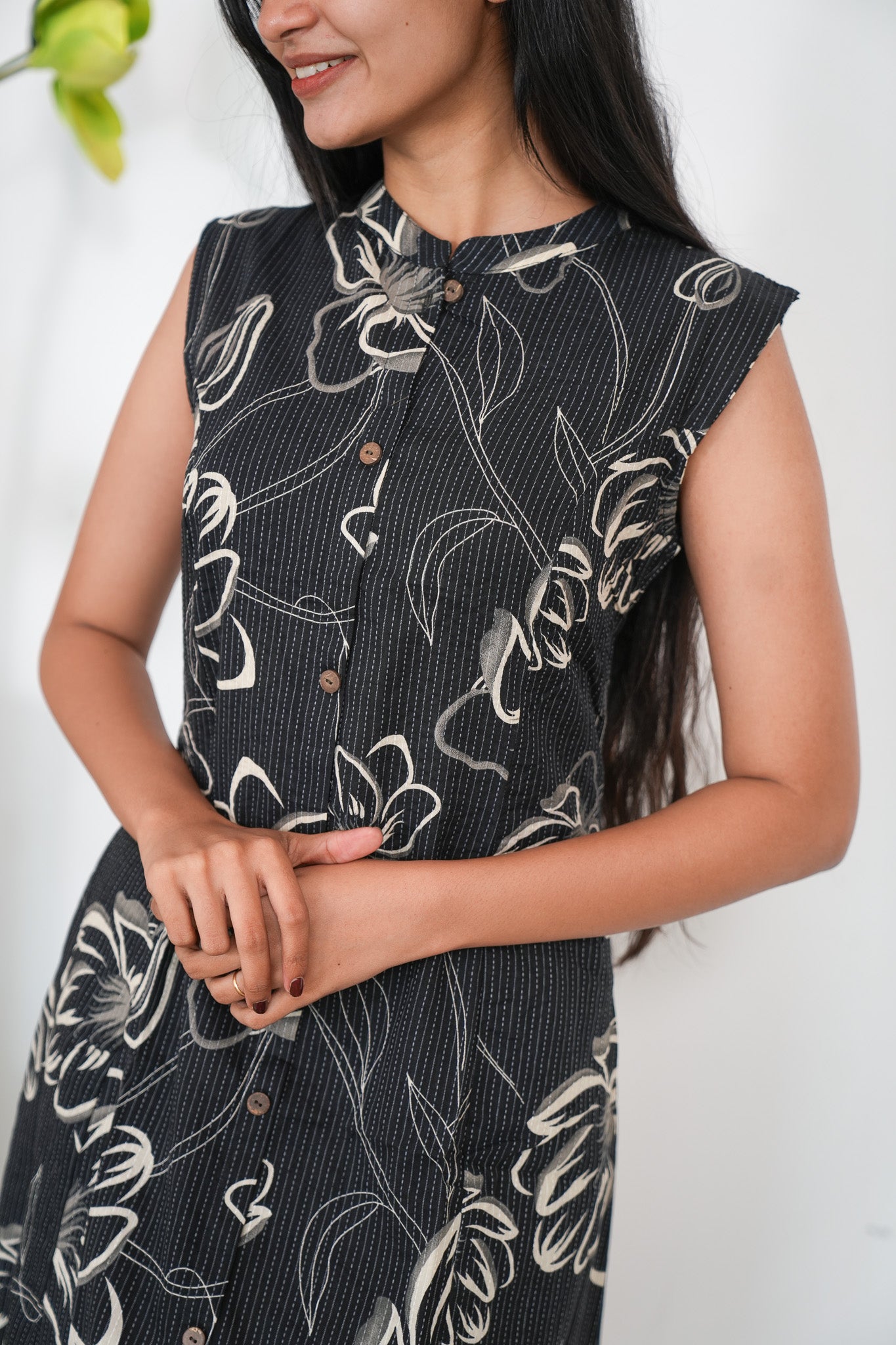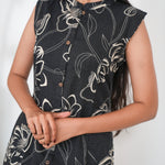 Black mandarin cotton shirt dress that exudes elegance and sophistication. It has buttons running down. Buttons cannot be opened.