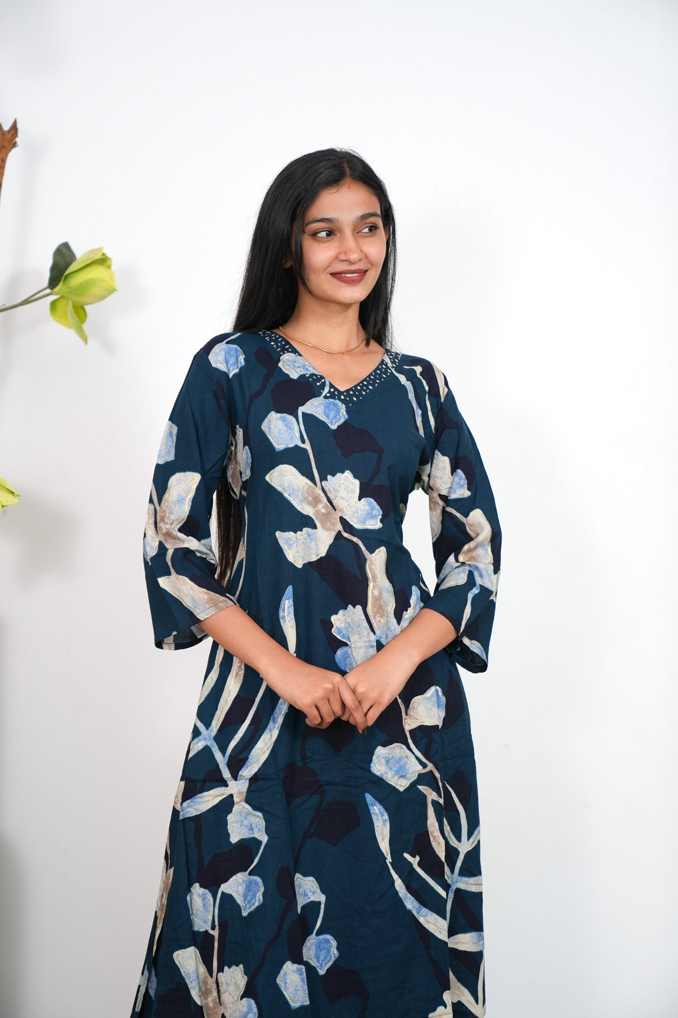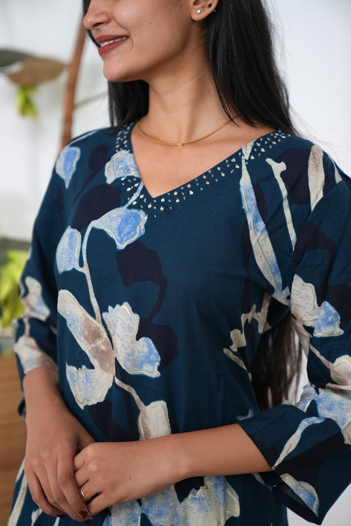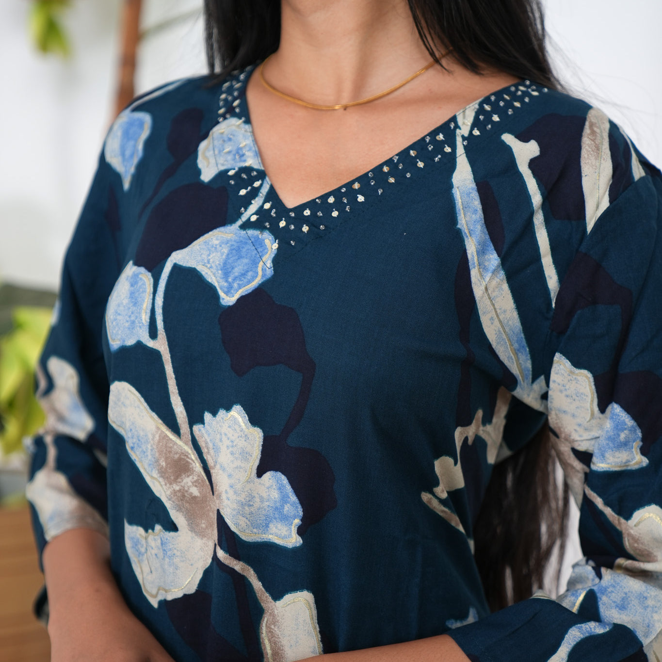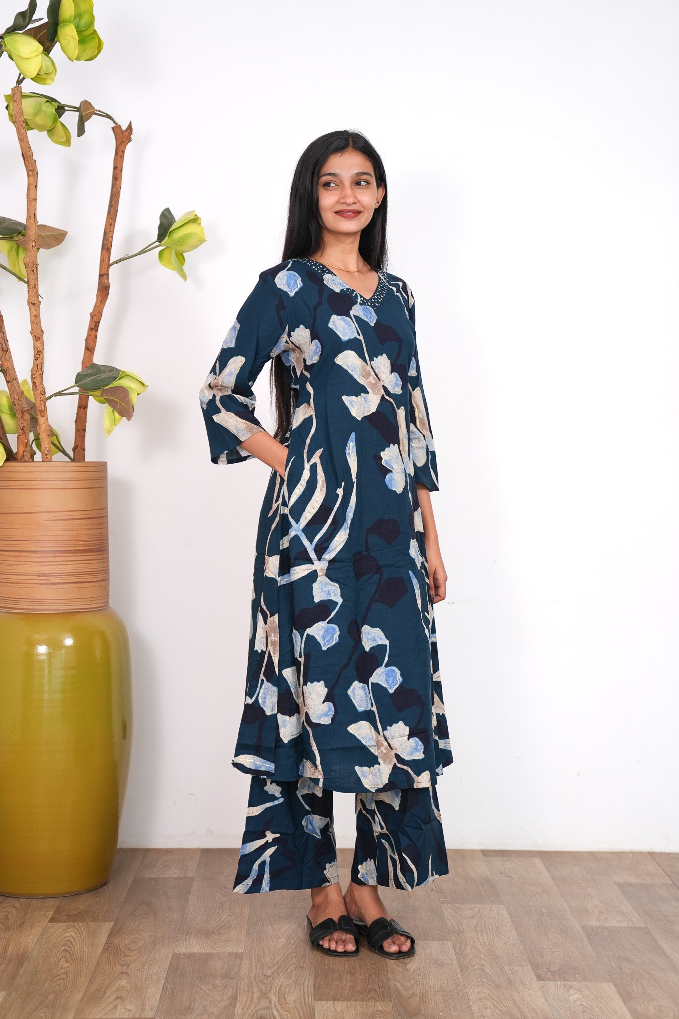 These Co-ords are so cozy, comfortable and chic making it perfect for brunch and a girl's day out! The kurta has V neck and 3/4 sleeves. Pant comes with elastic and has a palazzo fit.