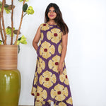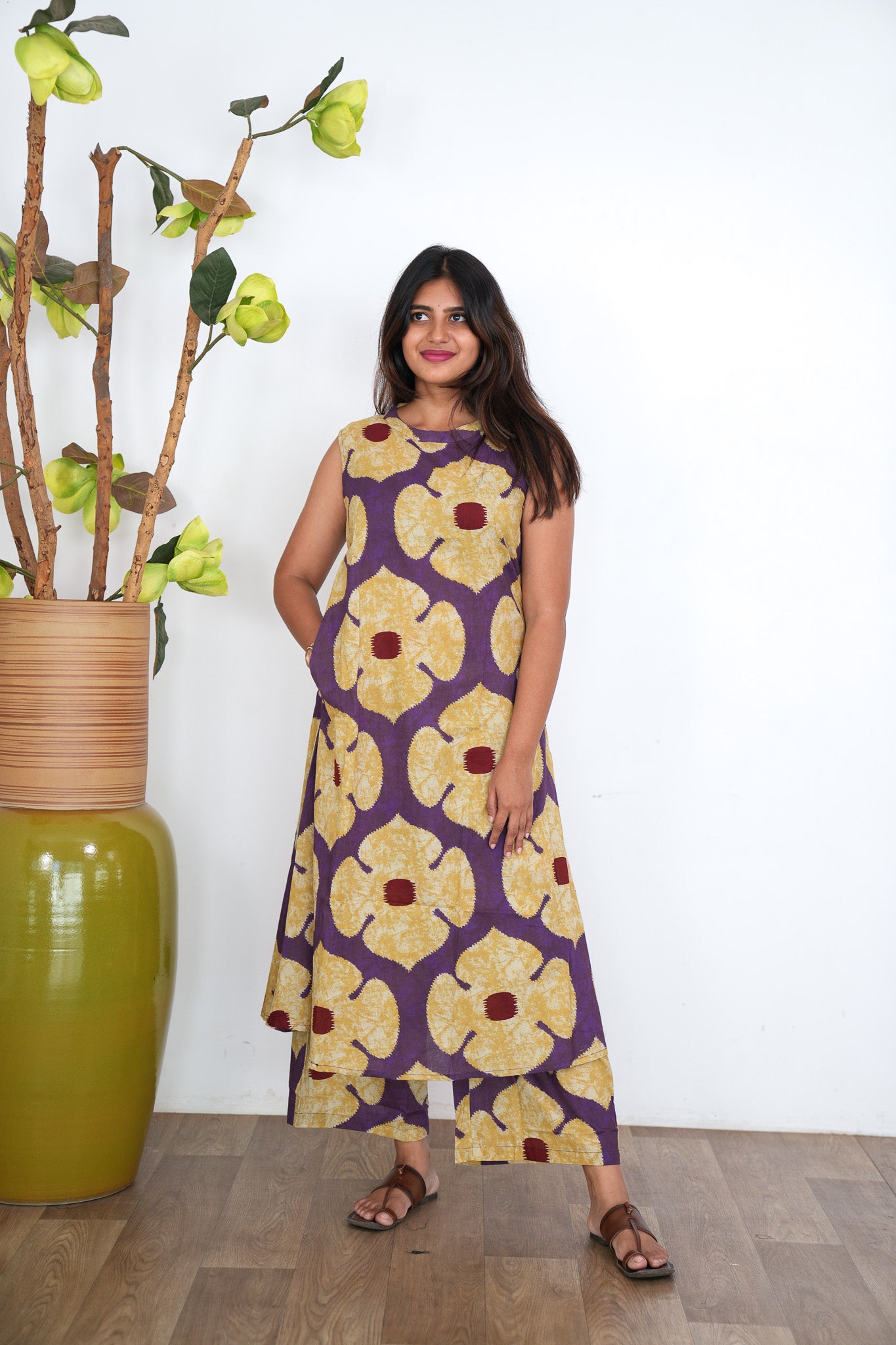 These Co-ords are so cozy, comfortable and chic making it perfect for brunch and a girl's day out! The kurta has round neck with attached sleeves. Pant comes with elastic and has a palazzo fit.