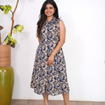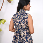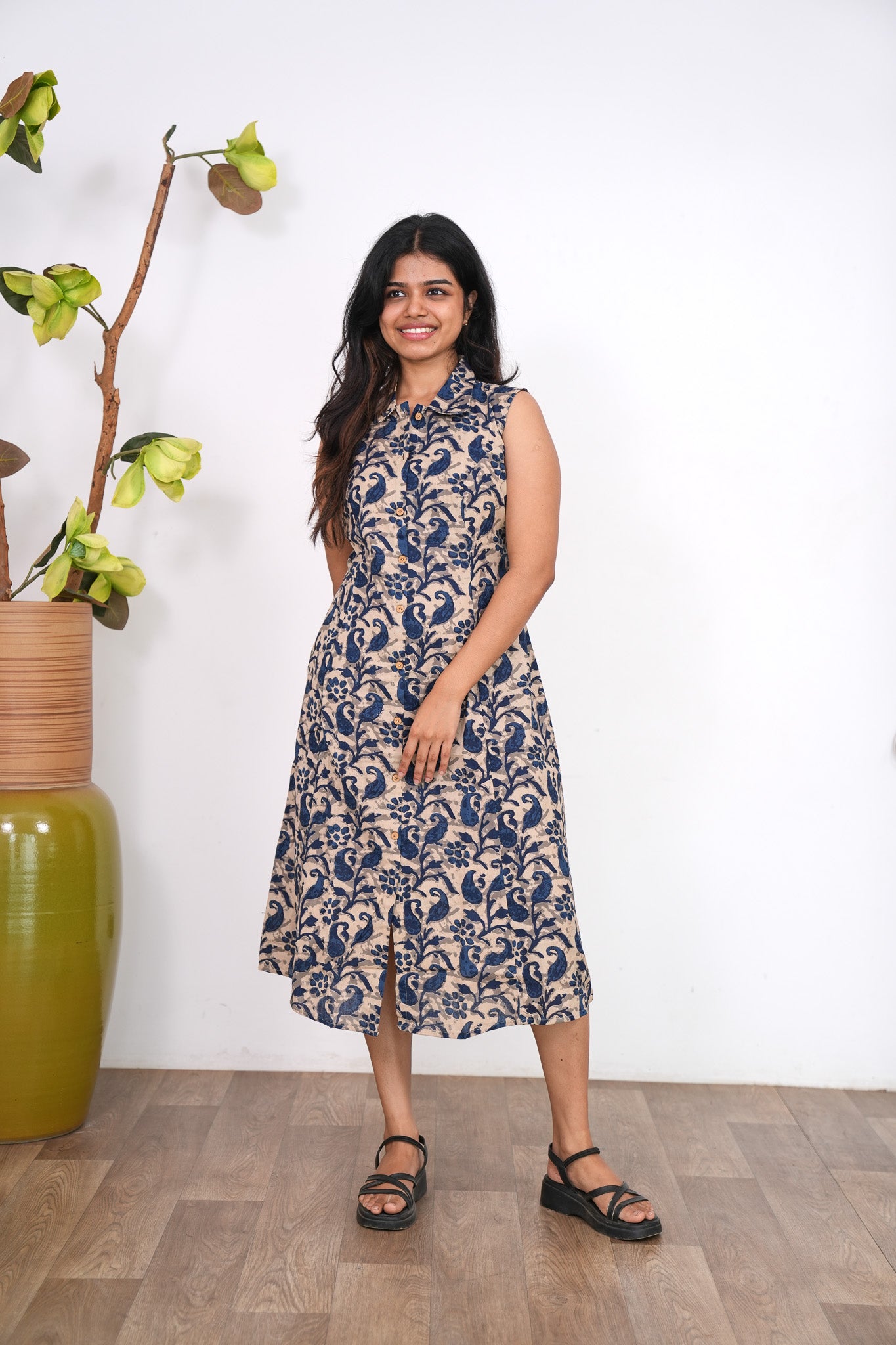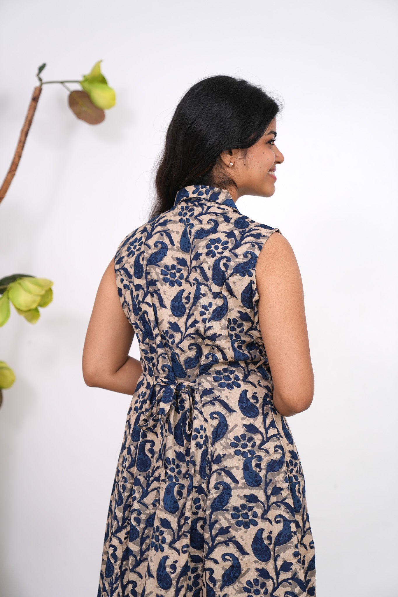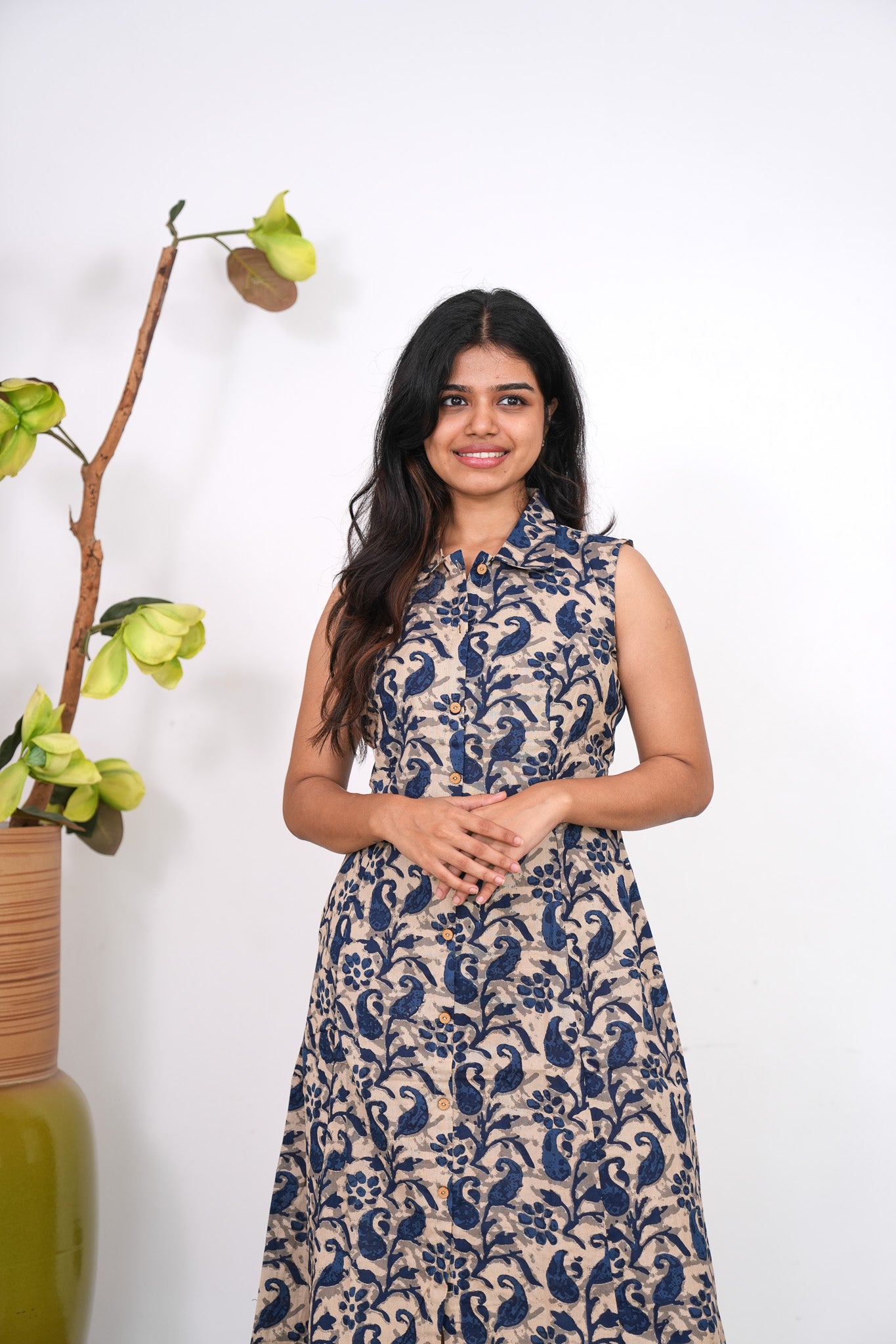 Blue paisley cotton shirt dress that exudes elegance and sophistication. It has buttons running down.