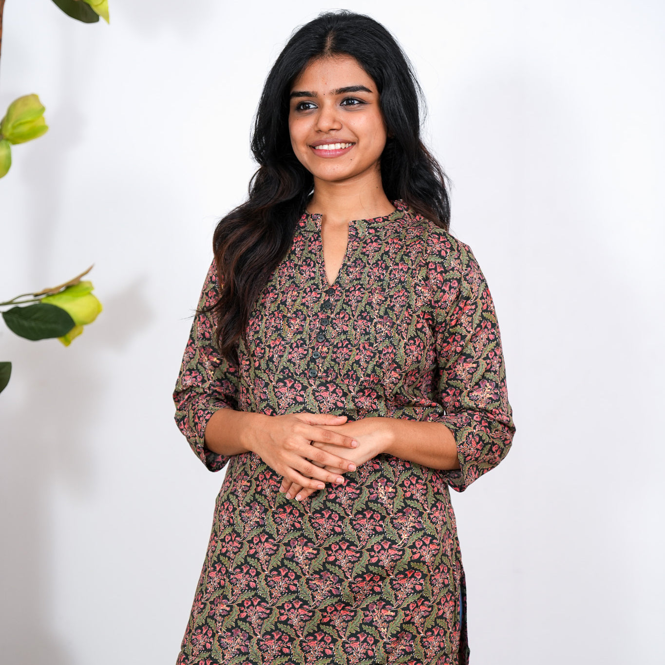 The kurti comes with a floral print all over the kurti with vibrant colour mixtures. It comes with mandarin collar with elbow length sleeves. It can be paired with cotton pants or jeans to pull of that comfortable look!!
