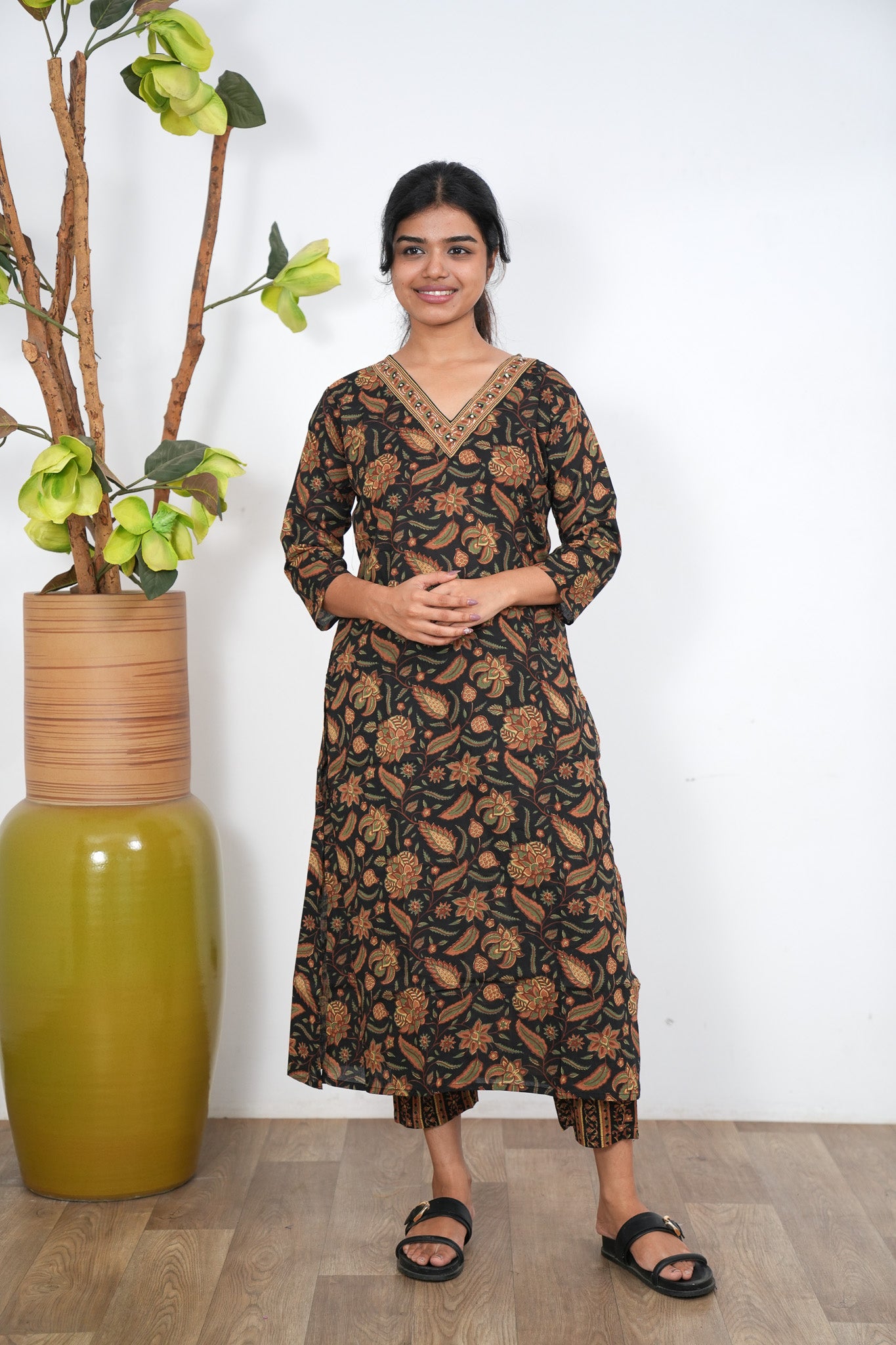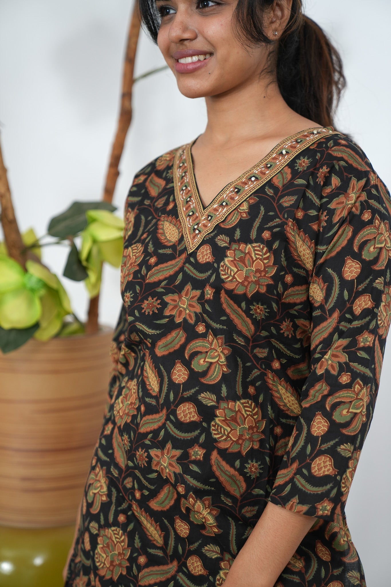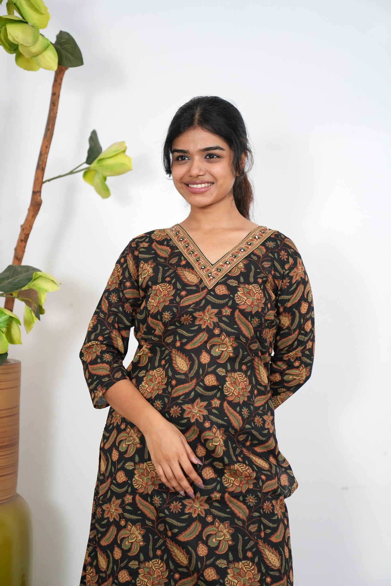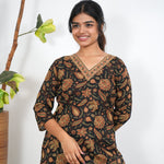 Black floral cotton co-ords set which can be paired together or with jeans for a easy breezy summer outfit. It comes with round neck and elbow length sleeves with straight cut pants.