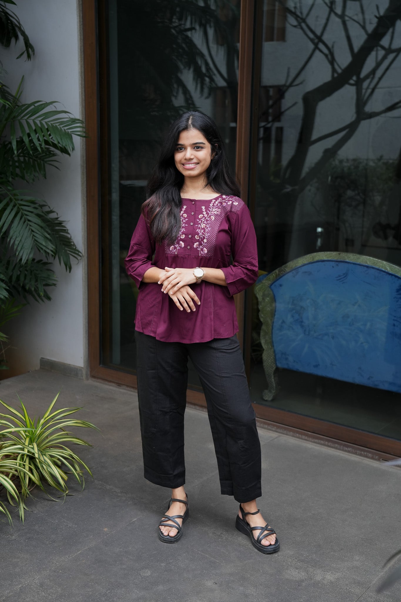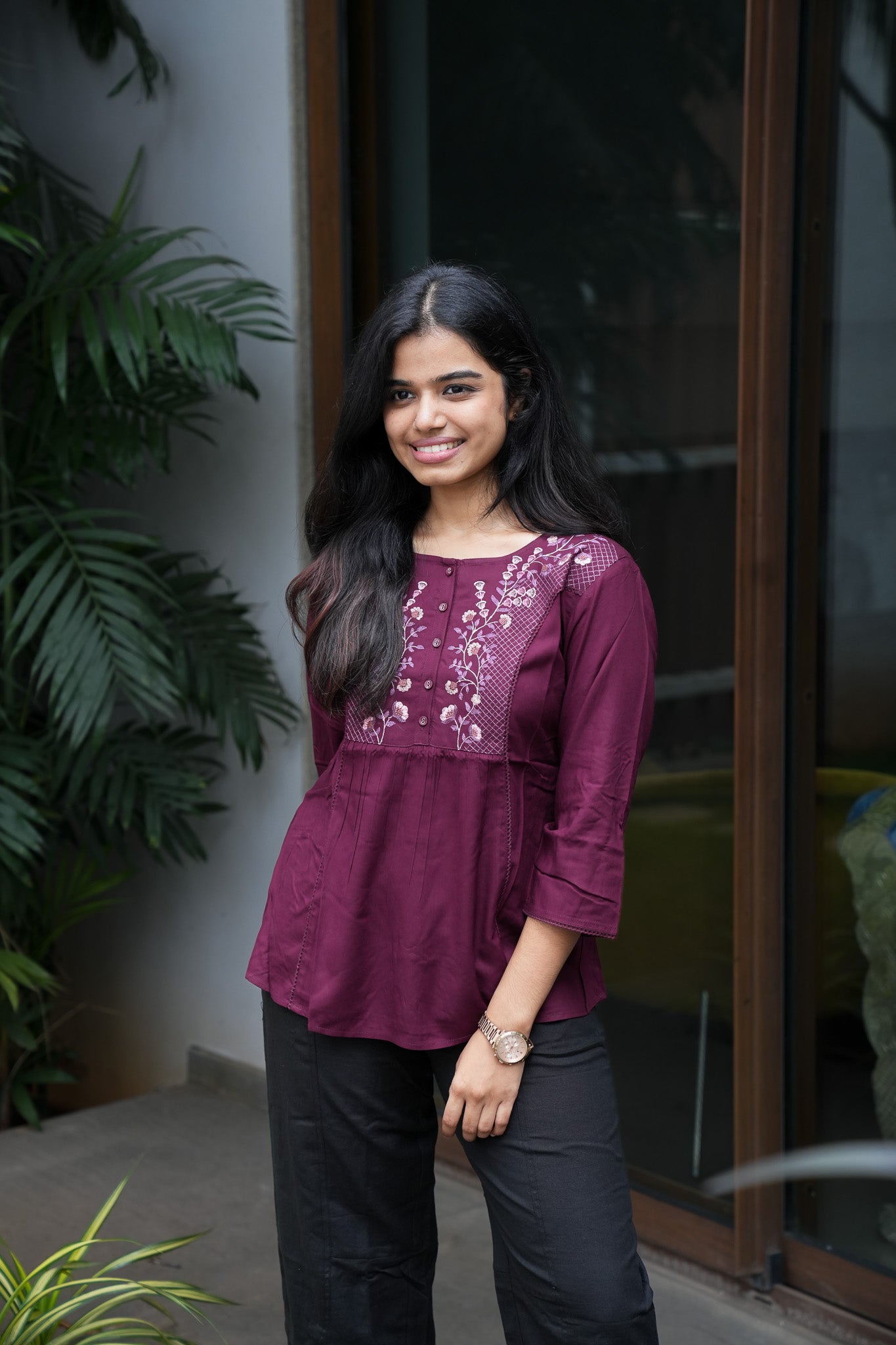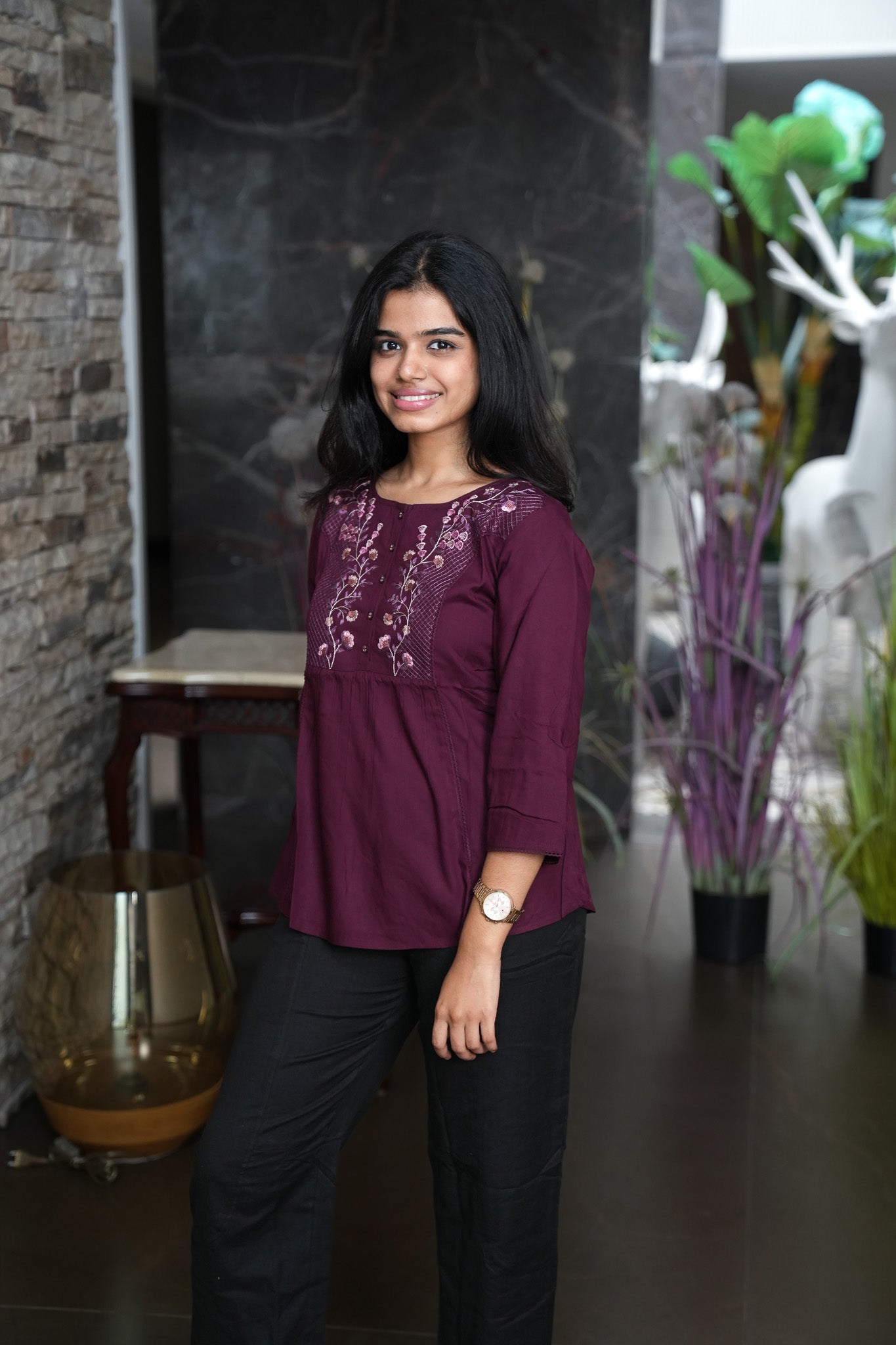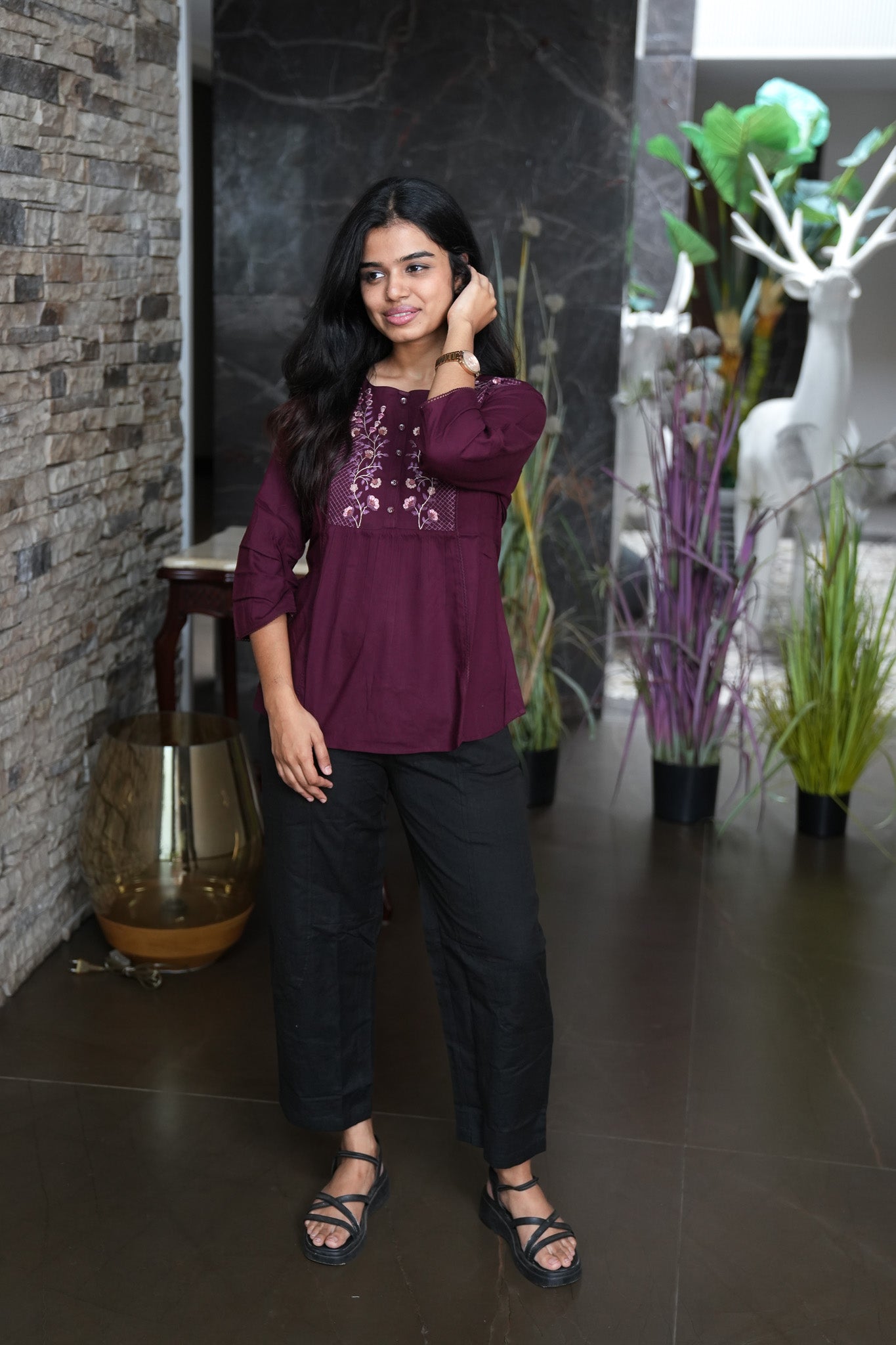 Burgundy hand embroidered cotton top with round neck and elbow length sleeves. These are so chic, comfortable and luxurious at the same time. Pair it with denim or cotton pants and the look is complete!!