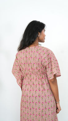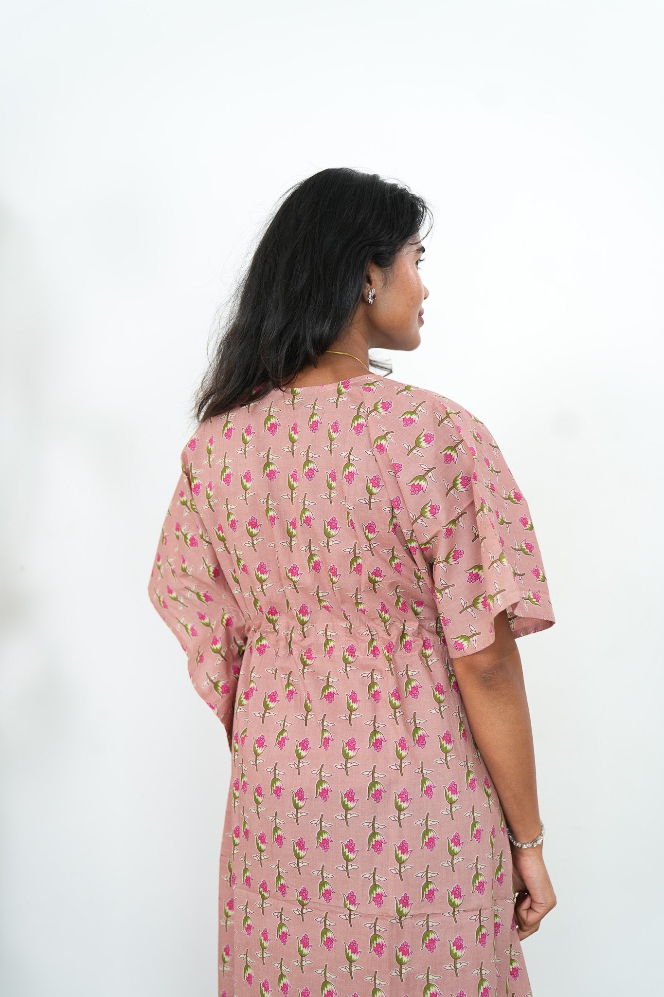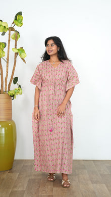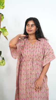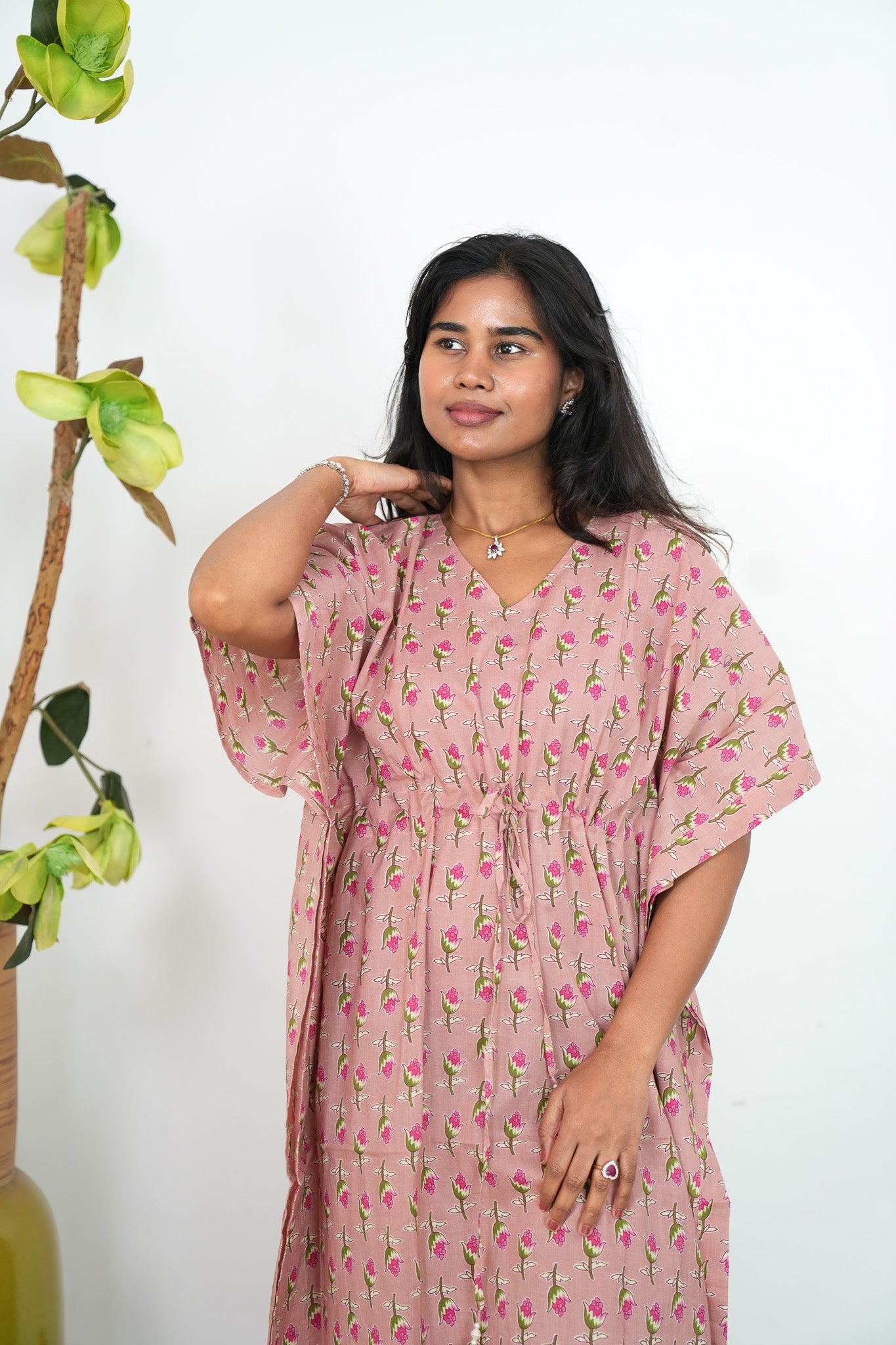 Easy breezy cotton kaftan made for you to feel absolute comfort, elegance and a total stunner at the same time. It comes V neck and tie in the centre with flowy silhouette and floral prints all over.