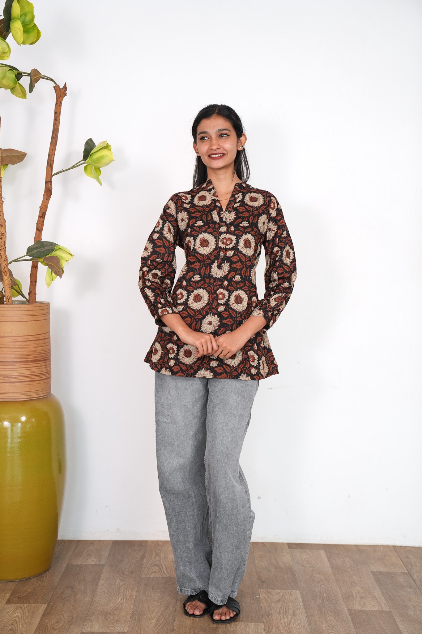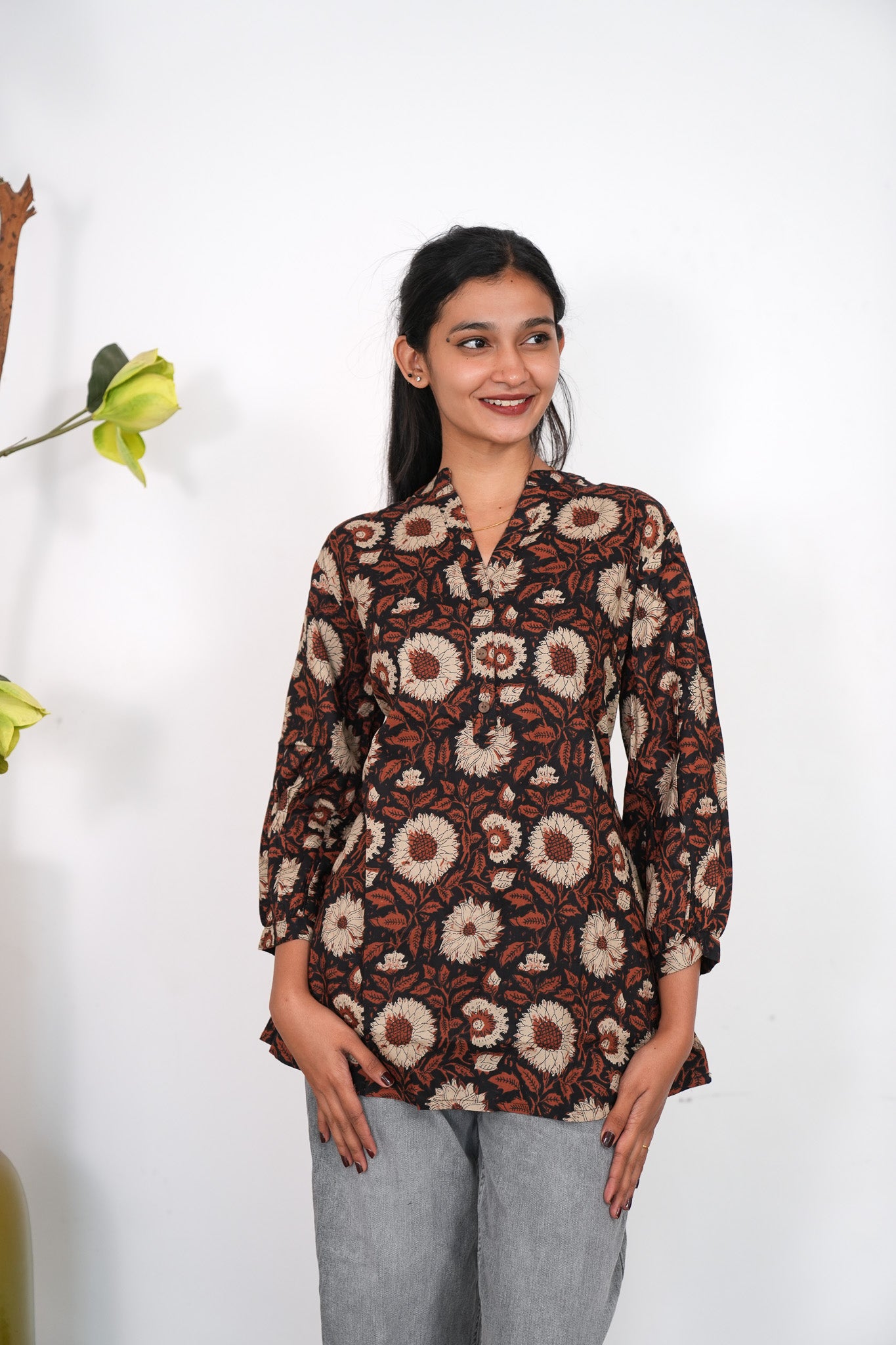 This cotton short kurti has mandarin collar and 3/4 length sleeves they are extremely breathable and light weight making it perfect for all day comfort. They can be paired with jeans , skirt or even cotton pants.