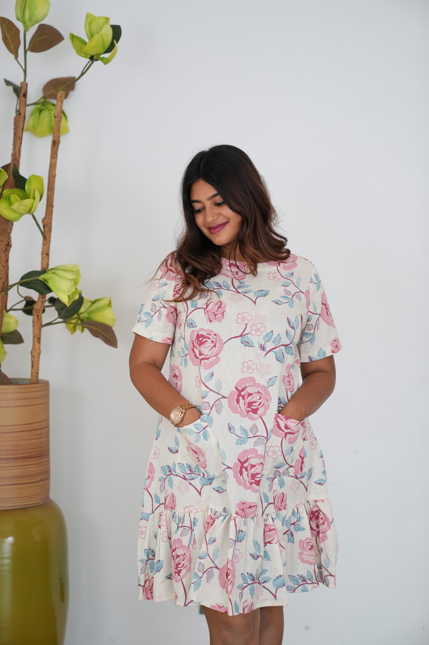 I love the fabric, style...the buttons behind, frill below, the frontal pockets and the eye to detail as in. ...when doing the pockets they have seen that the design falls in sync with the overall design and print.