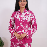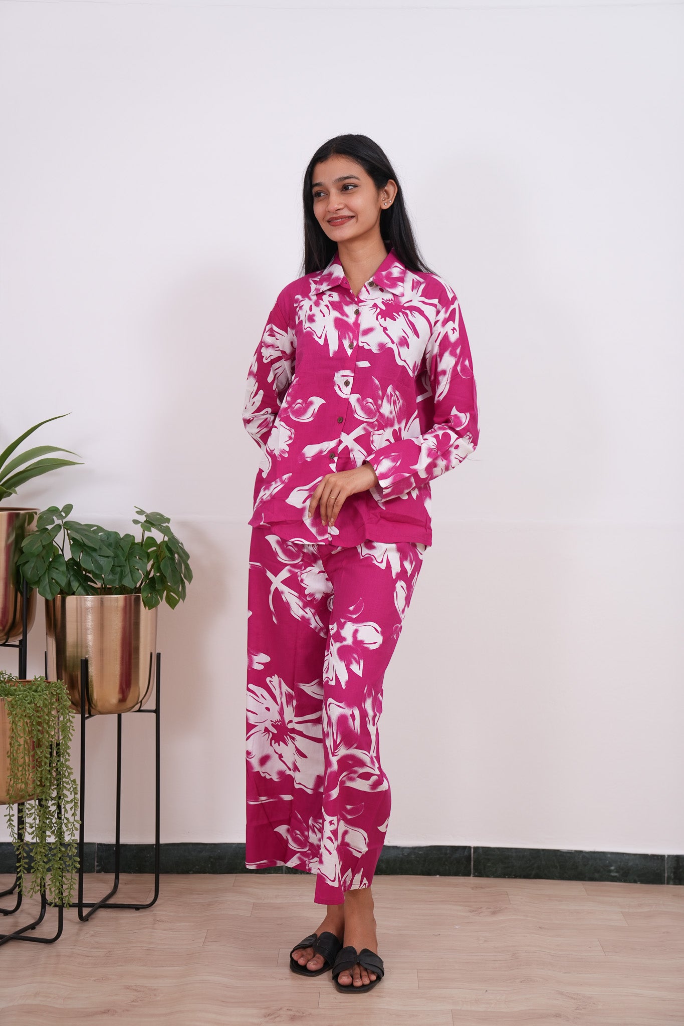The night suit has a standard collar with openable buttons running down. It comes with matching elastic waisted pants