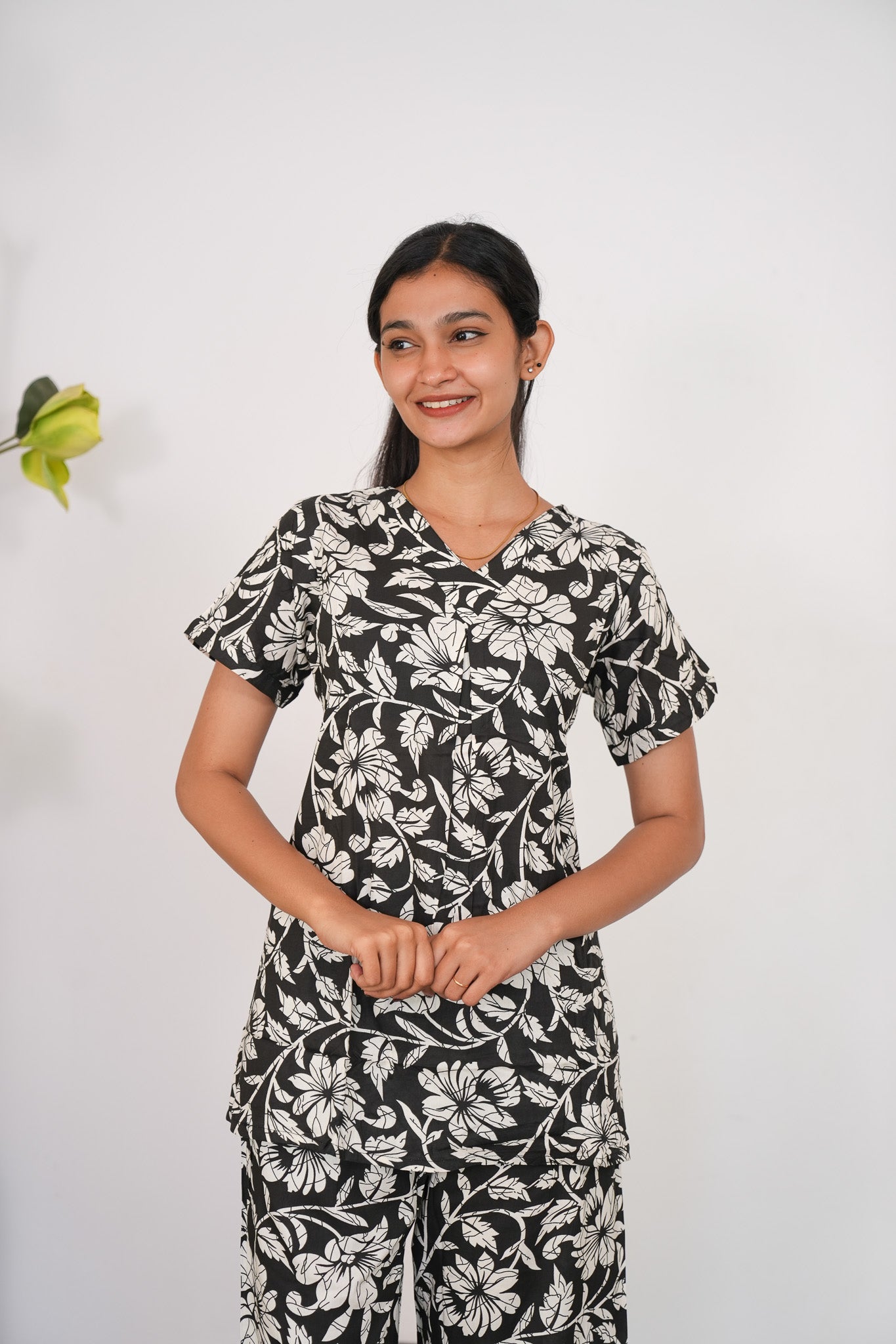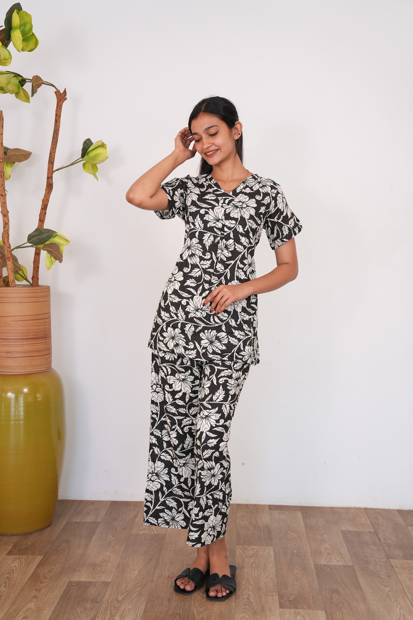 These Co-ords are so cozy, comfortable and chic making it perfect to relax at home or sleep in them. The top has a V neck with short length sleeves. Pant comes with elastic and it has a straight fit.