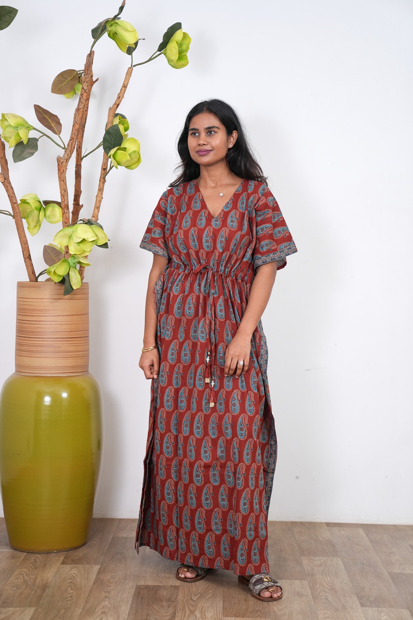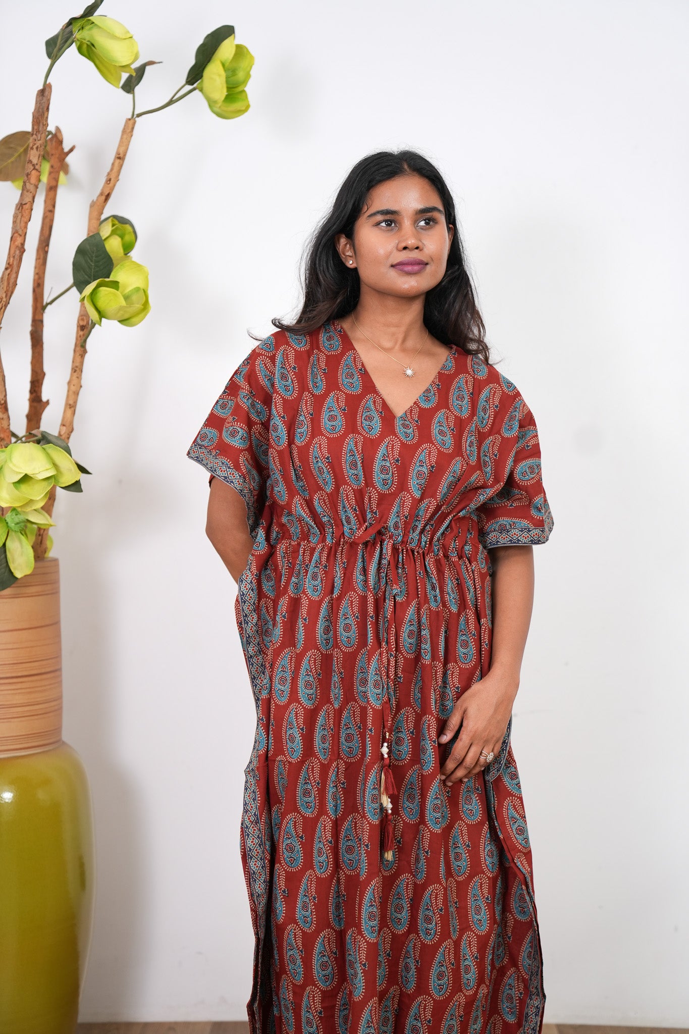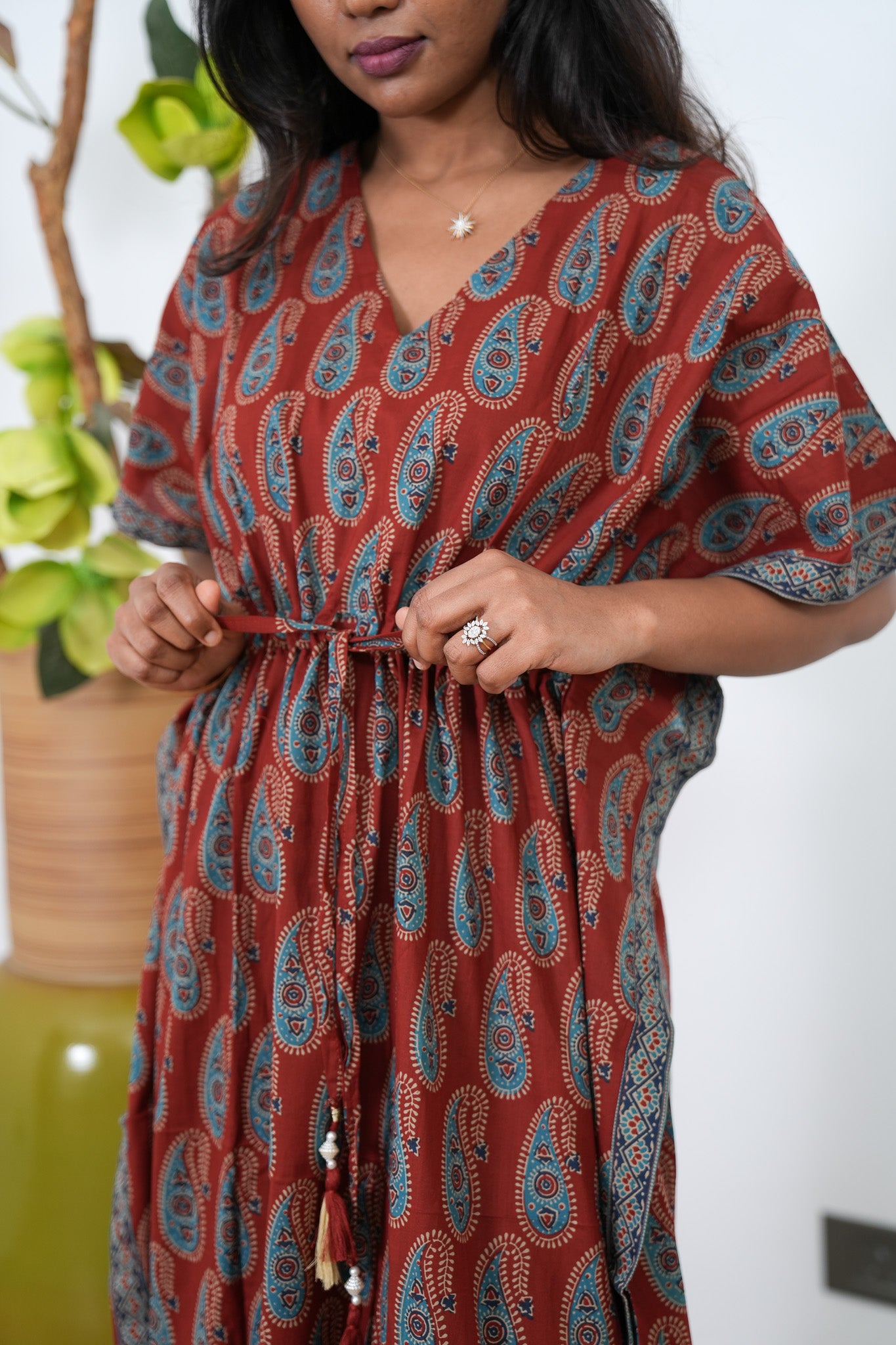 Easy breezy cotton kaftan made for you to feel absolute comfort, elegance and a total stunner at the same time. It comes V neck and tie in the centre with flowy silhouette and floral prints all over.