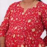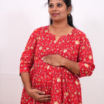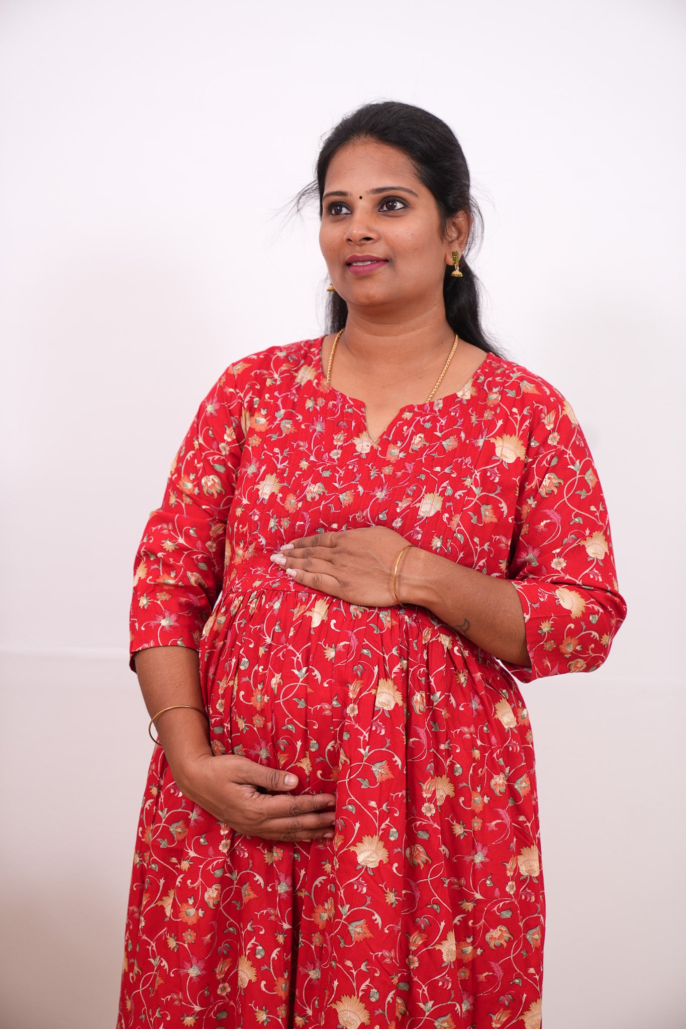 Crimson maternity nursing wear with round neck and 3/4 sleeves that accomodates the bump throughout nine months and has invisible zip on both sides to carefully feed baby. It is light weight and soft to help you get through pregnancy and breastfeeding journey with ease.