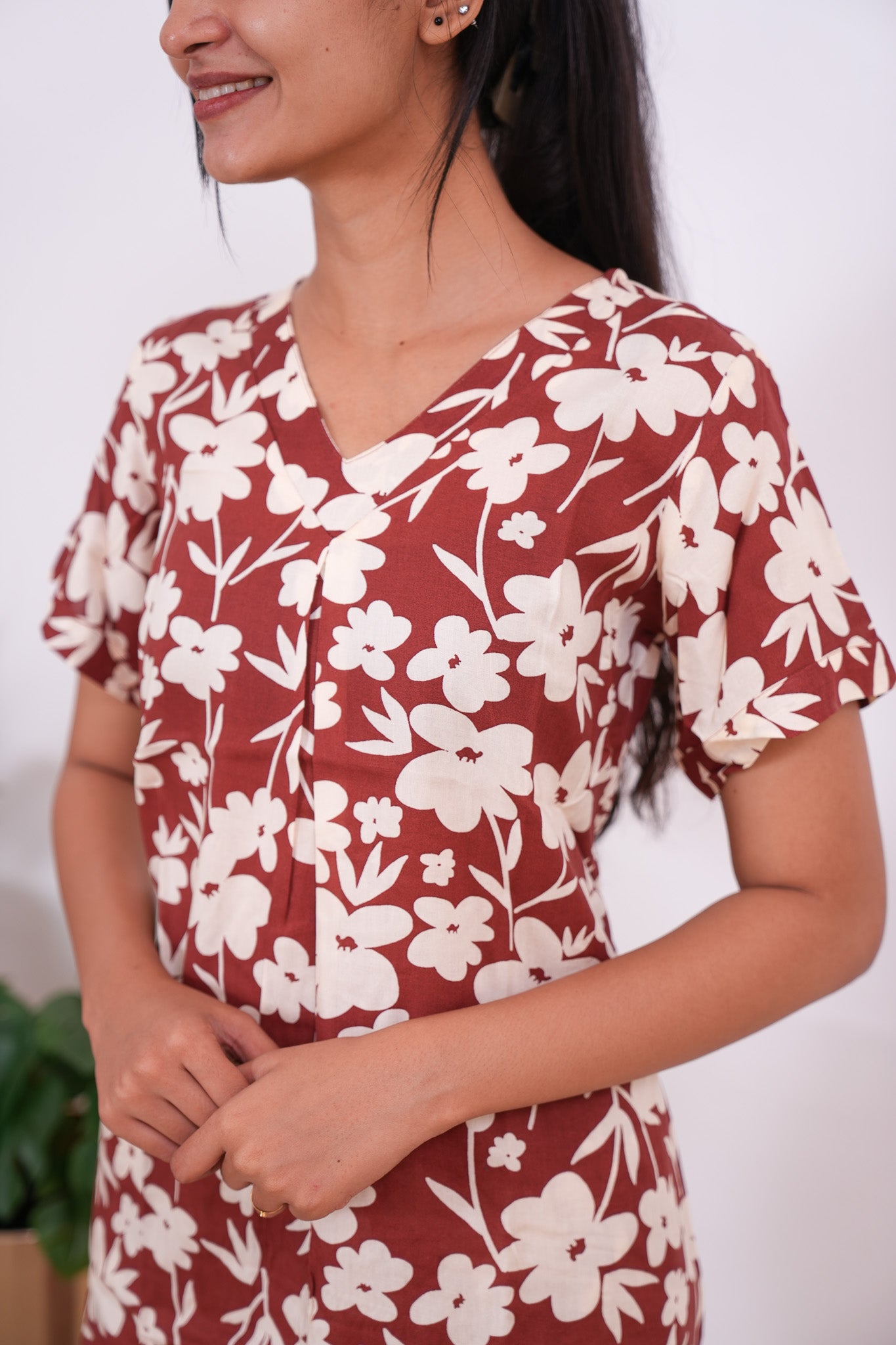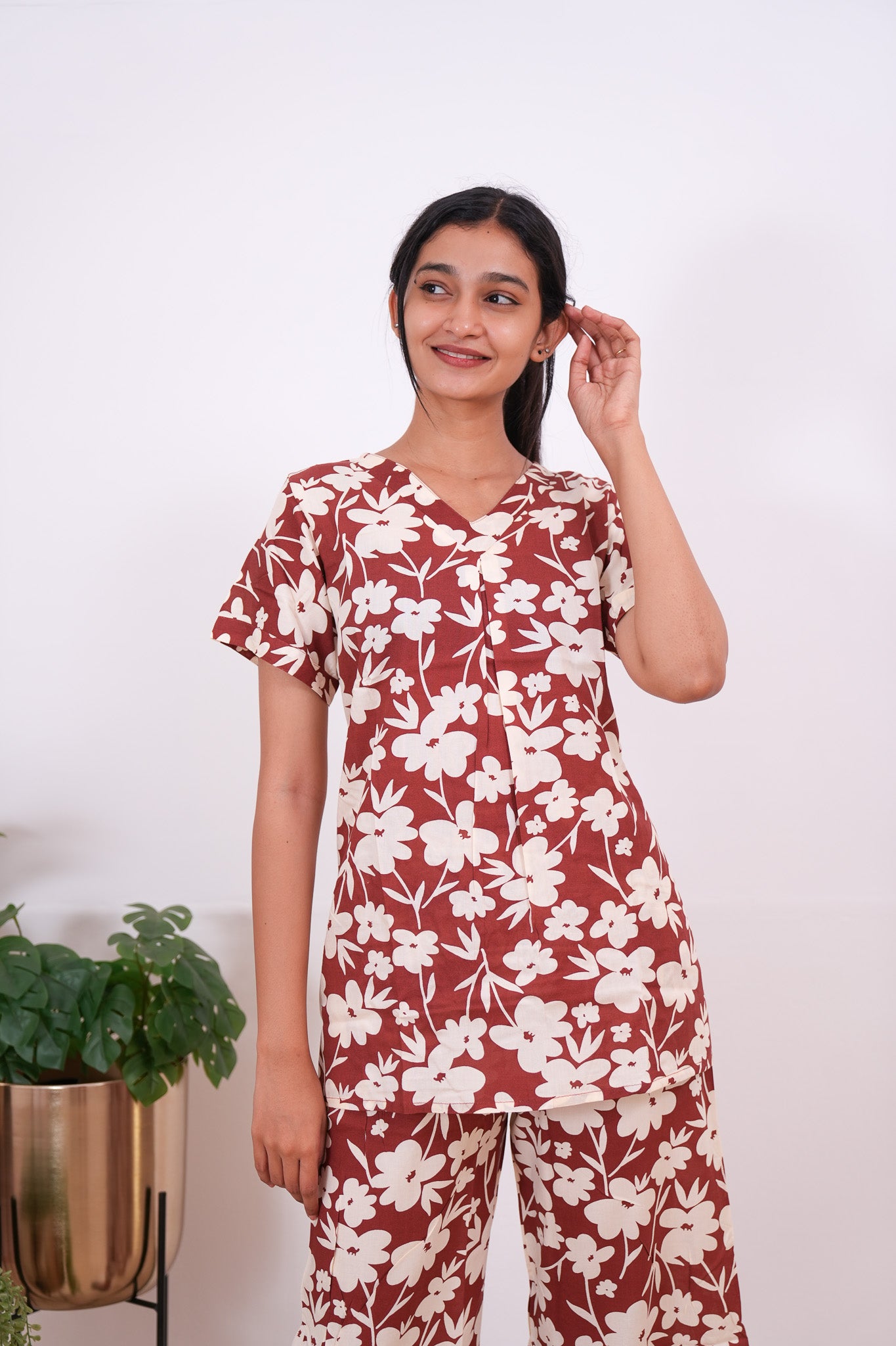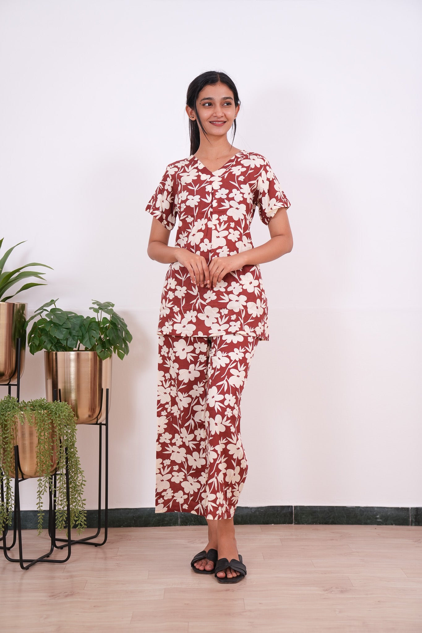 These Co-ords are so cozy, comfortable and chic making it perfect to relax at home or sleep in them. The top has a V neck with short length sleeves. Pant comes with elastic and it has a straight fit.