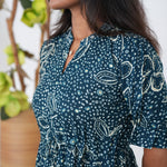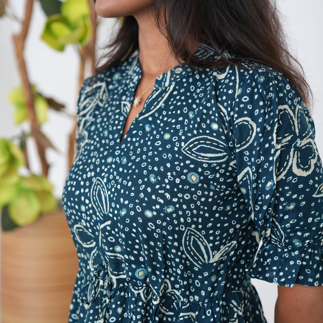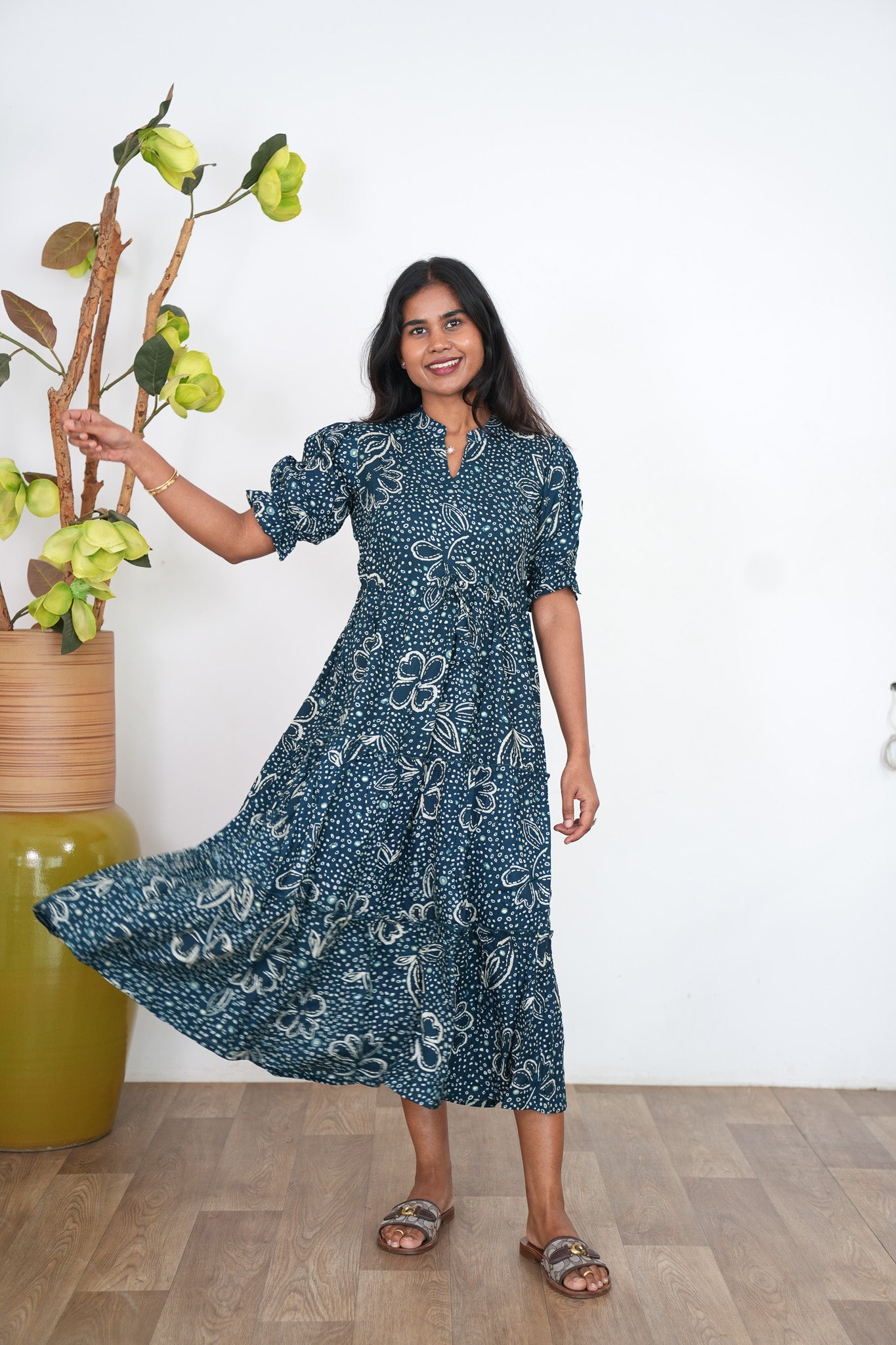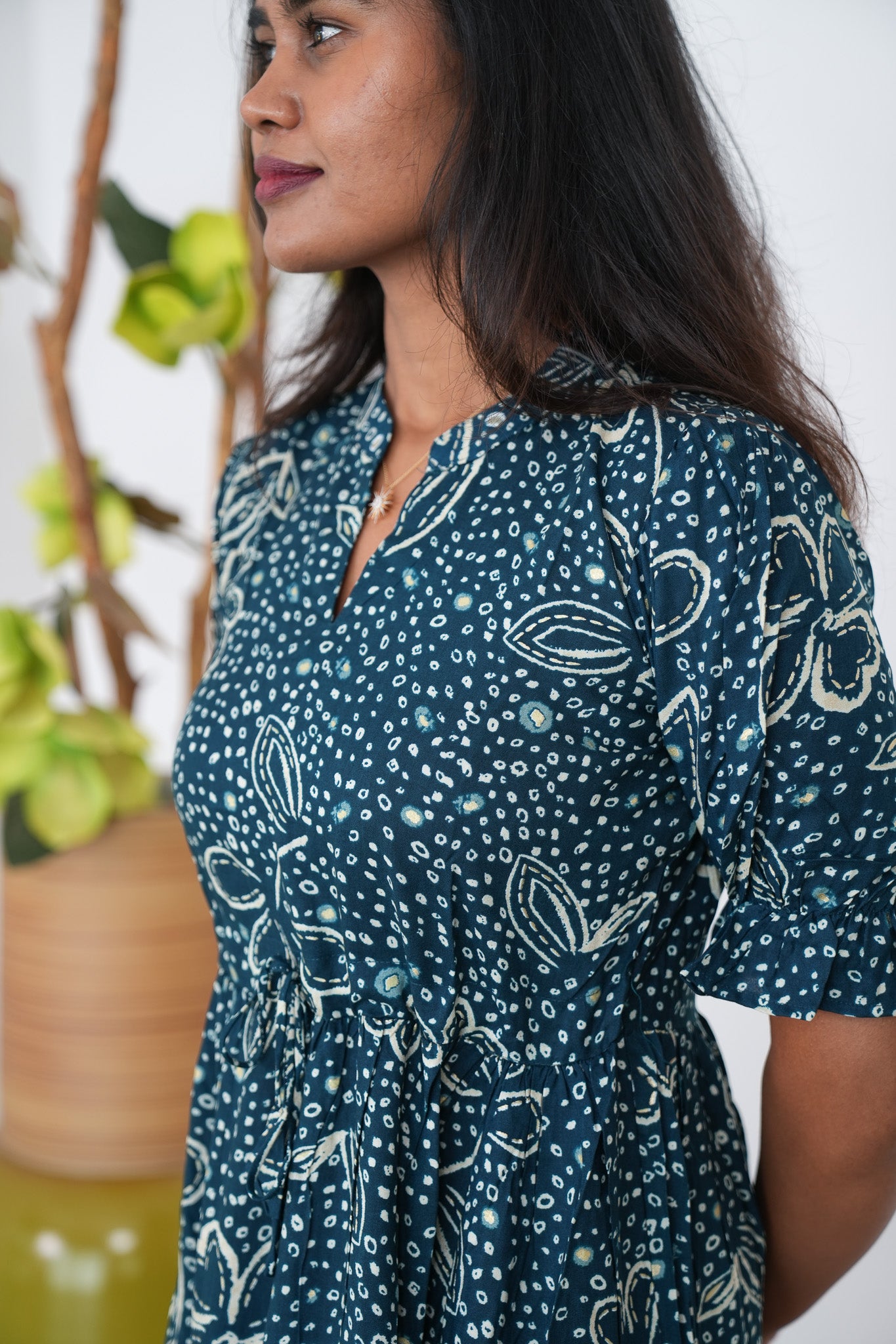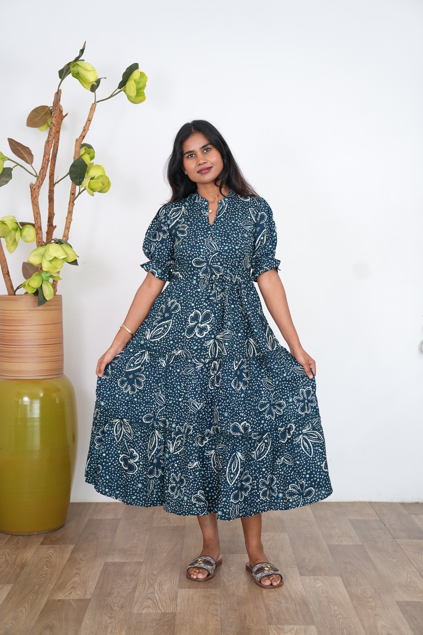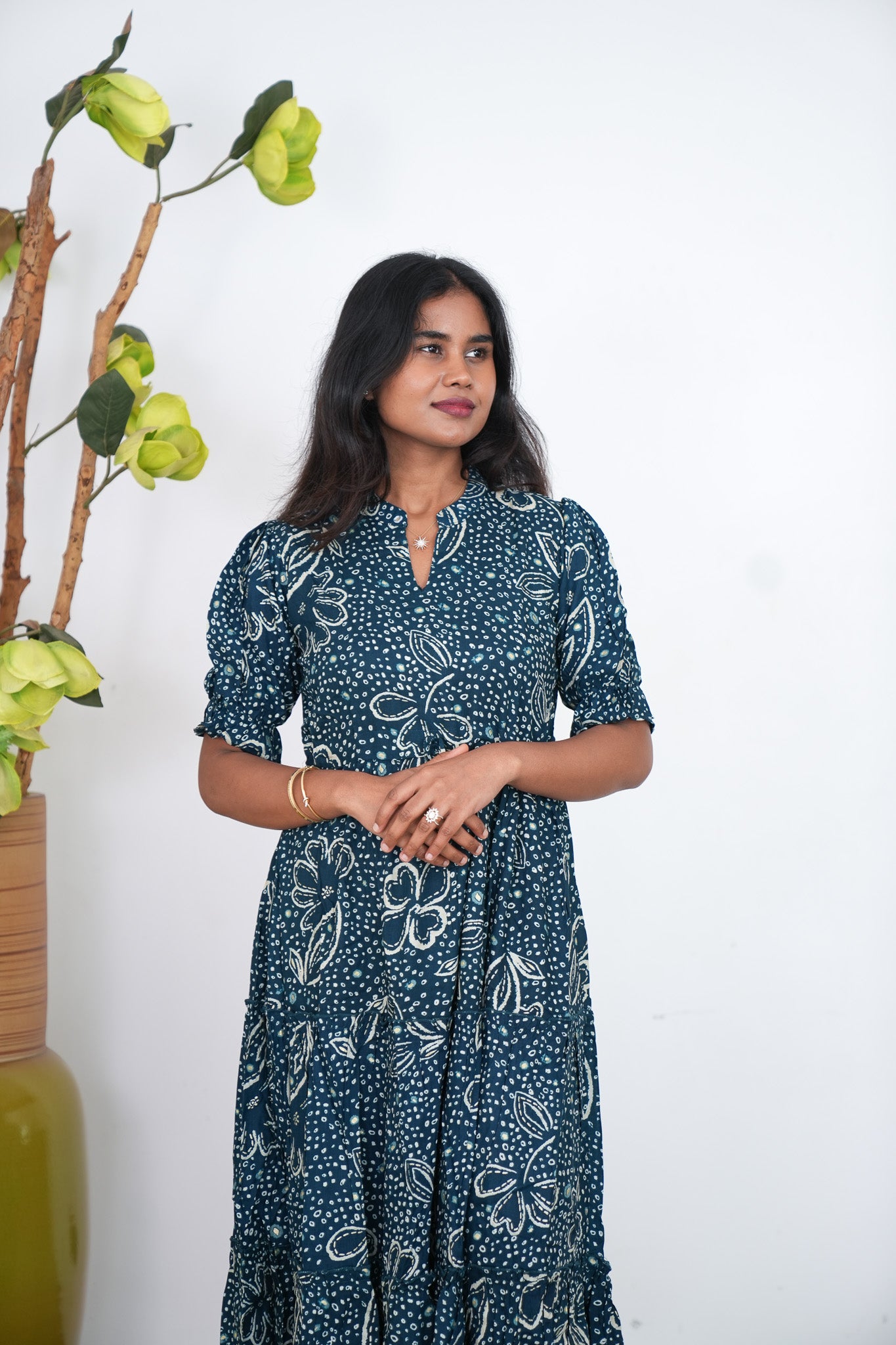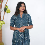 Dark green  midi dress with mandarin neck and balloon sleeves. It has a tie in the center.