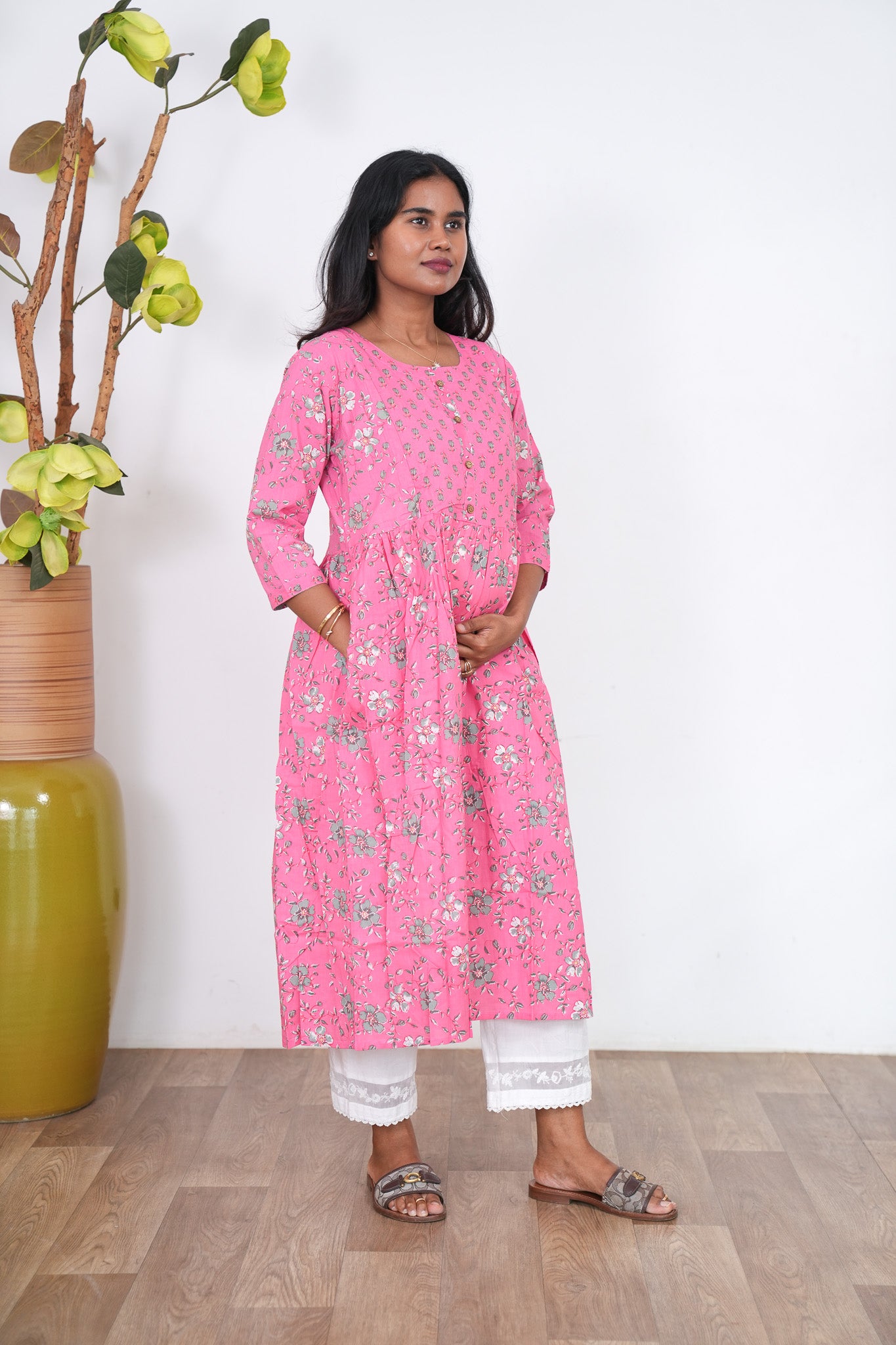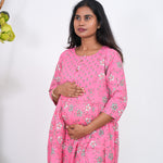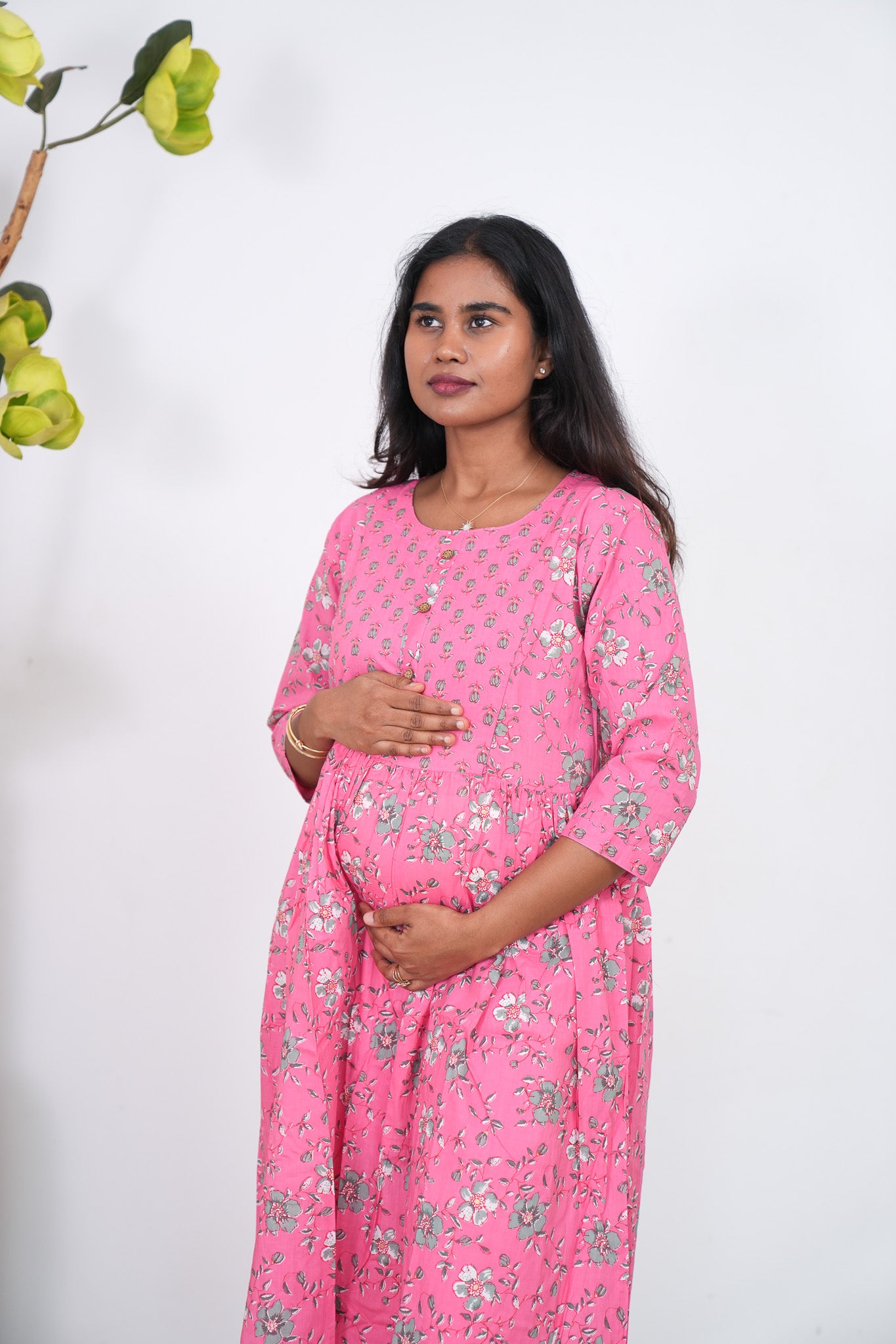 Pink maternity nursing wear with round neck and 3/4 sleeves that accomodates the bump throughout nine months and has invisible zip on both sides to carefully feed baby. It is light weight and soft to help you get through pregnancy and breastfeeding journey with ease.
