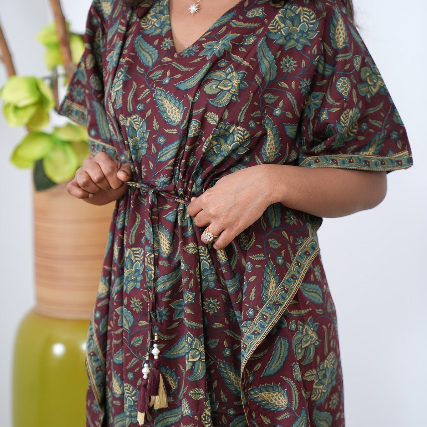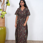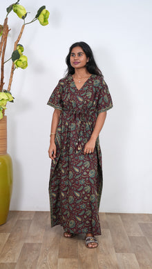 Easy breezy cotton kaftan made for you to feel absolute comfort, elegance and a total stunner at the same time. It comes V neck and tie in the centre with flowy silhouette and floral prints all over.