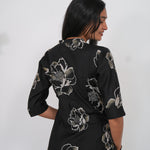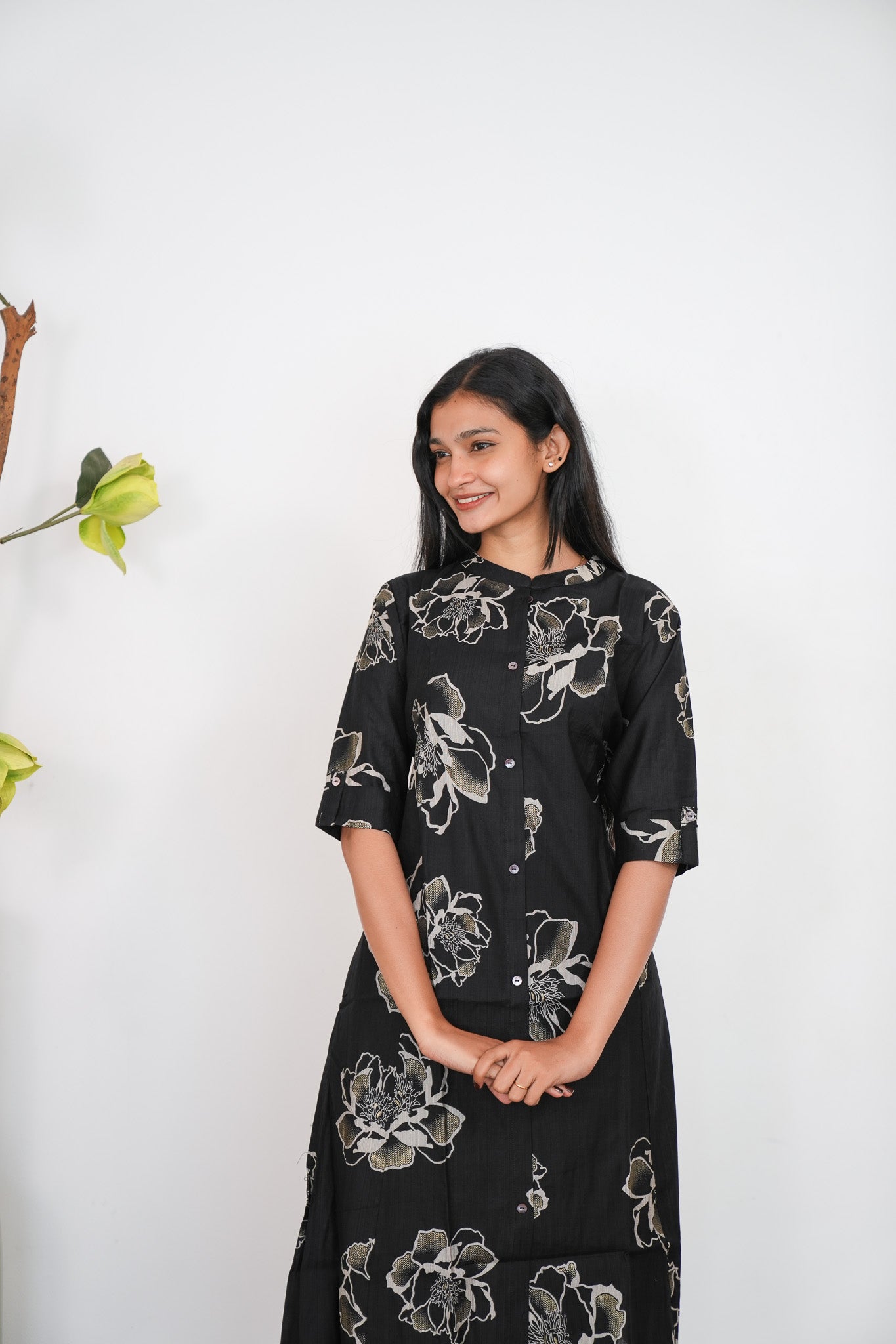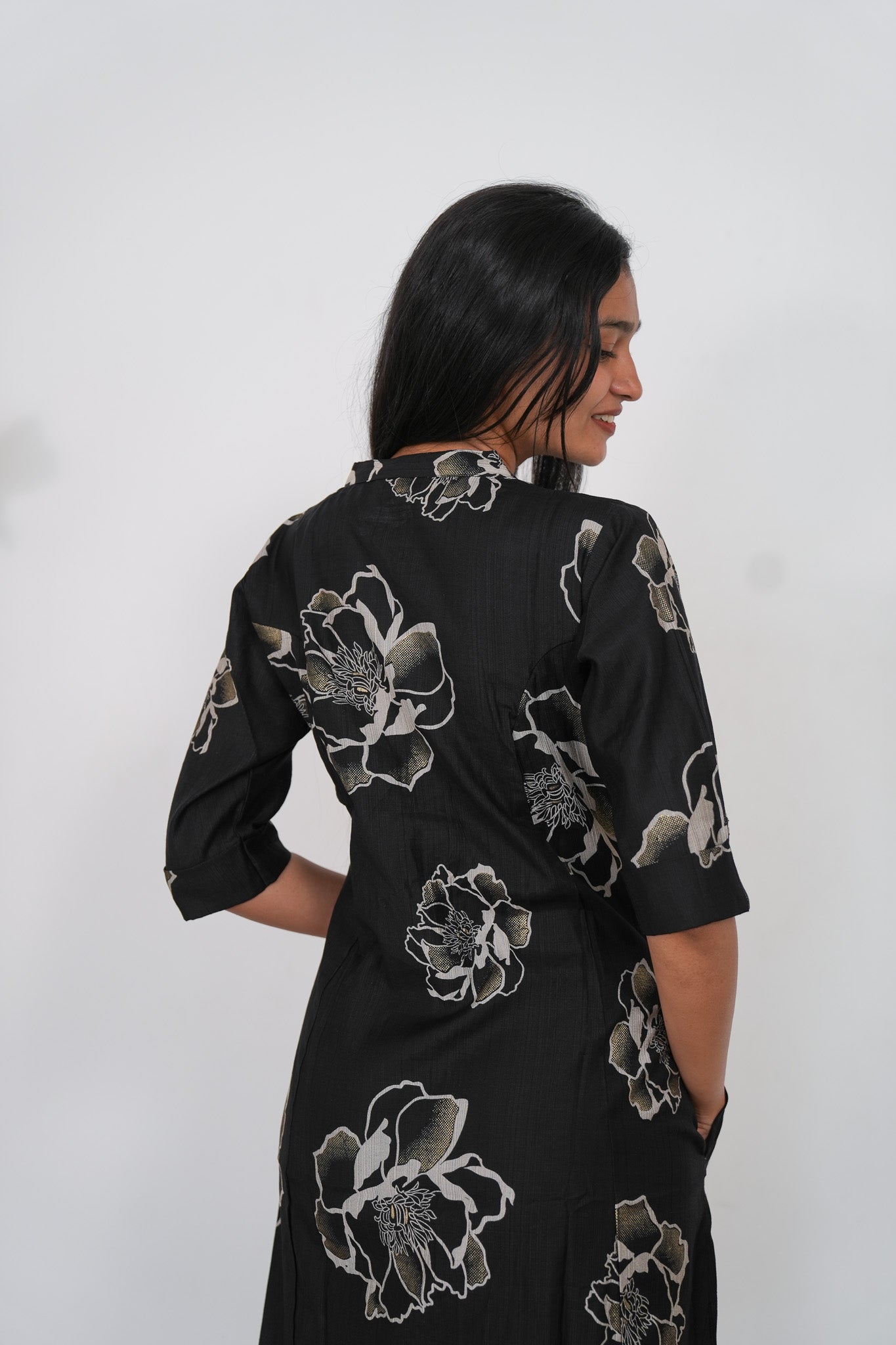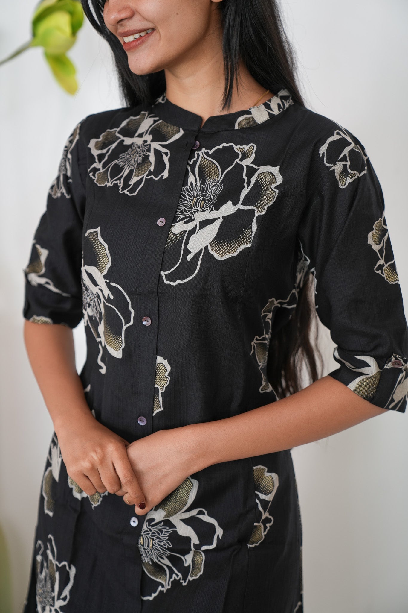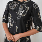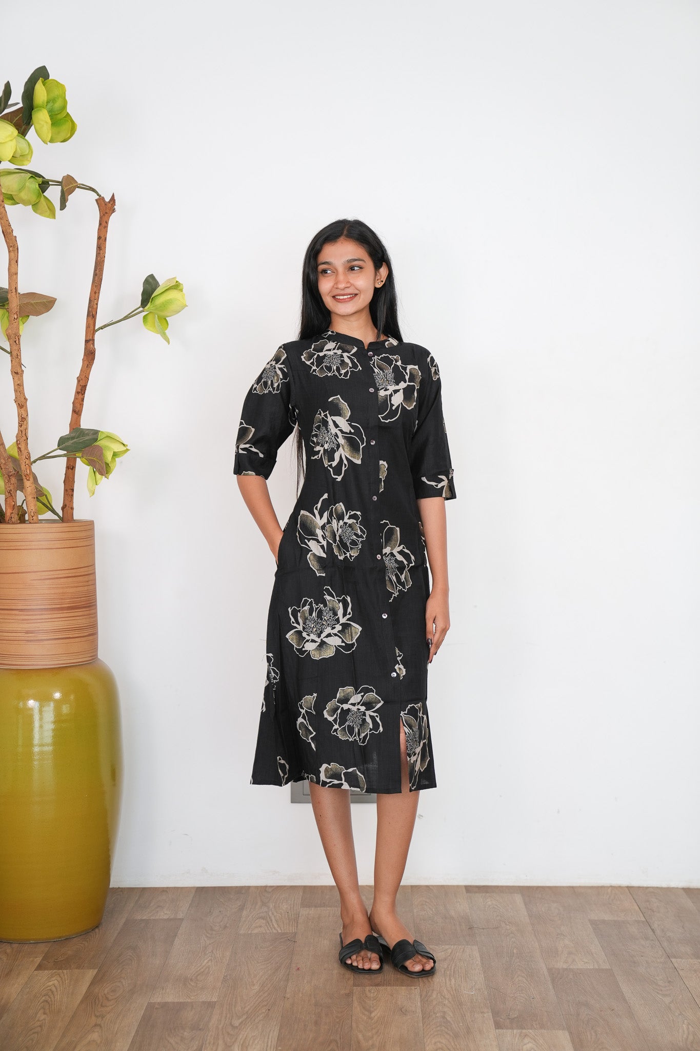 Ebony mandarin cotton shirt dress that exudes elegance and sophistication. It has buttons running down which cannot be opened.