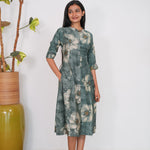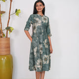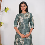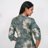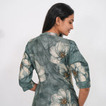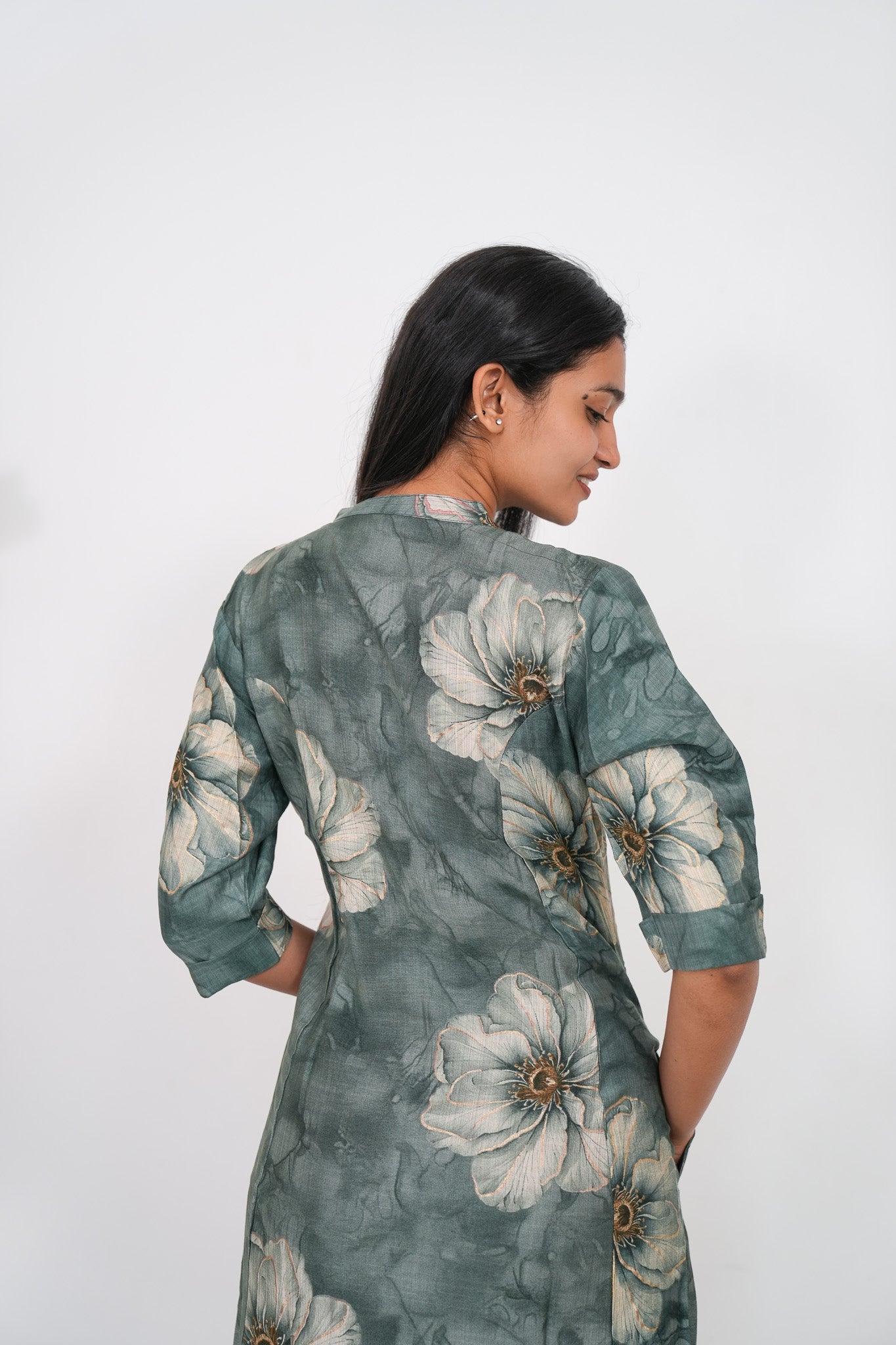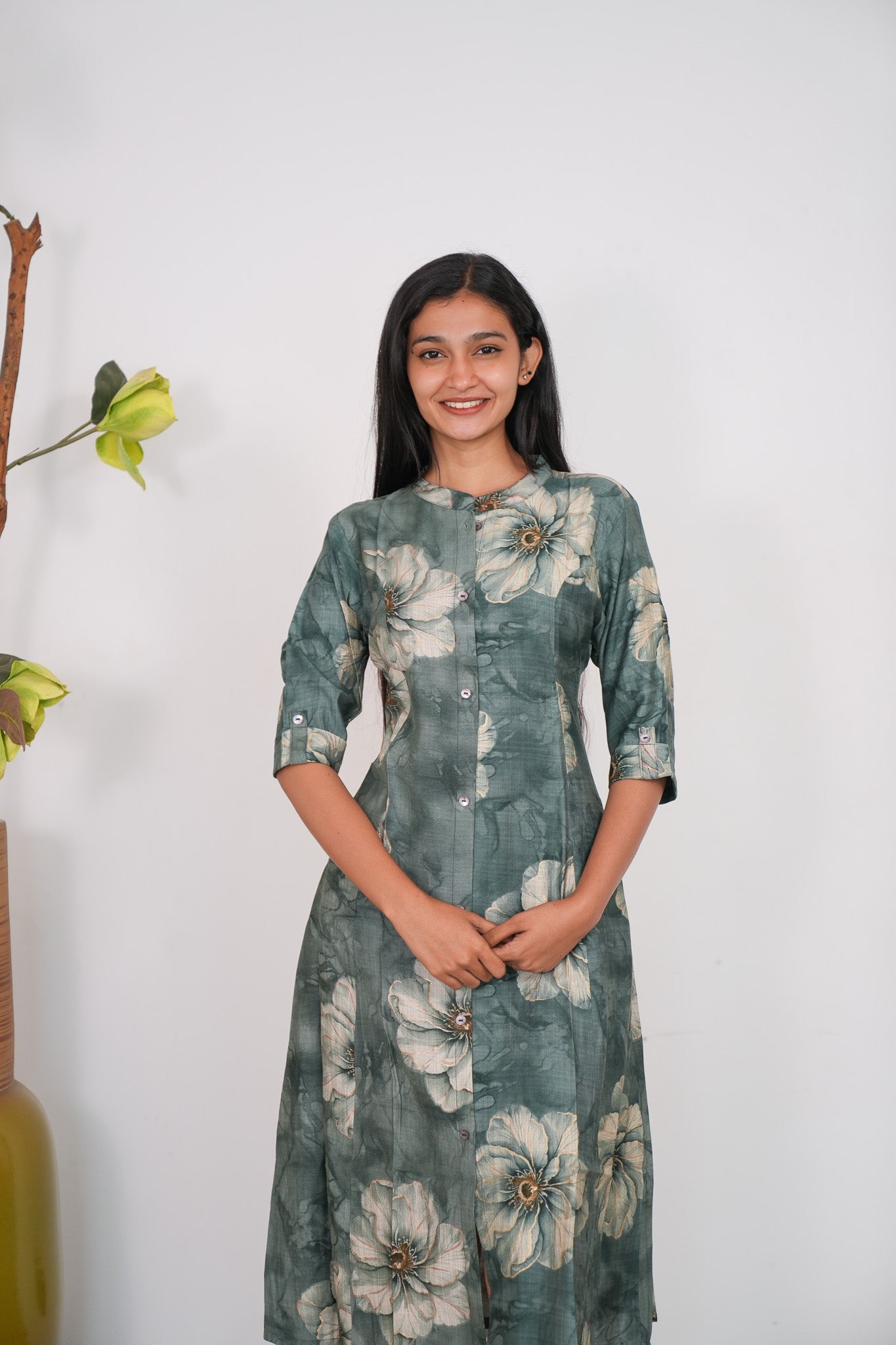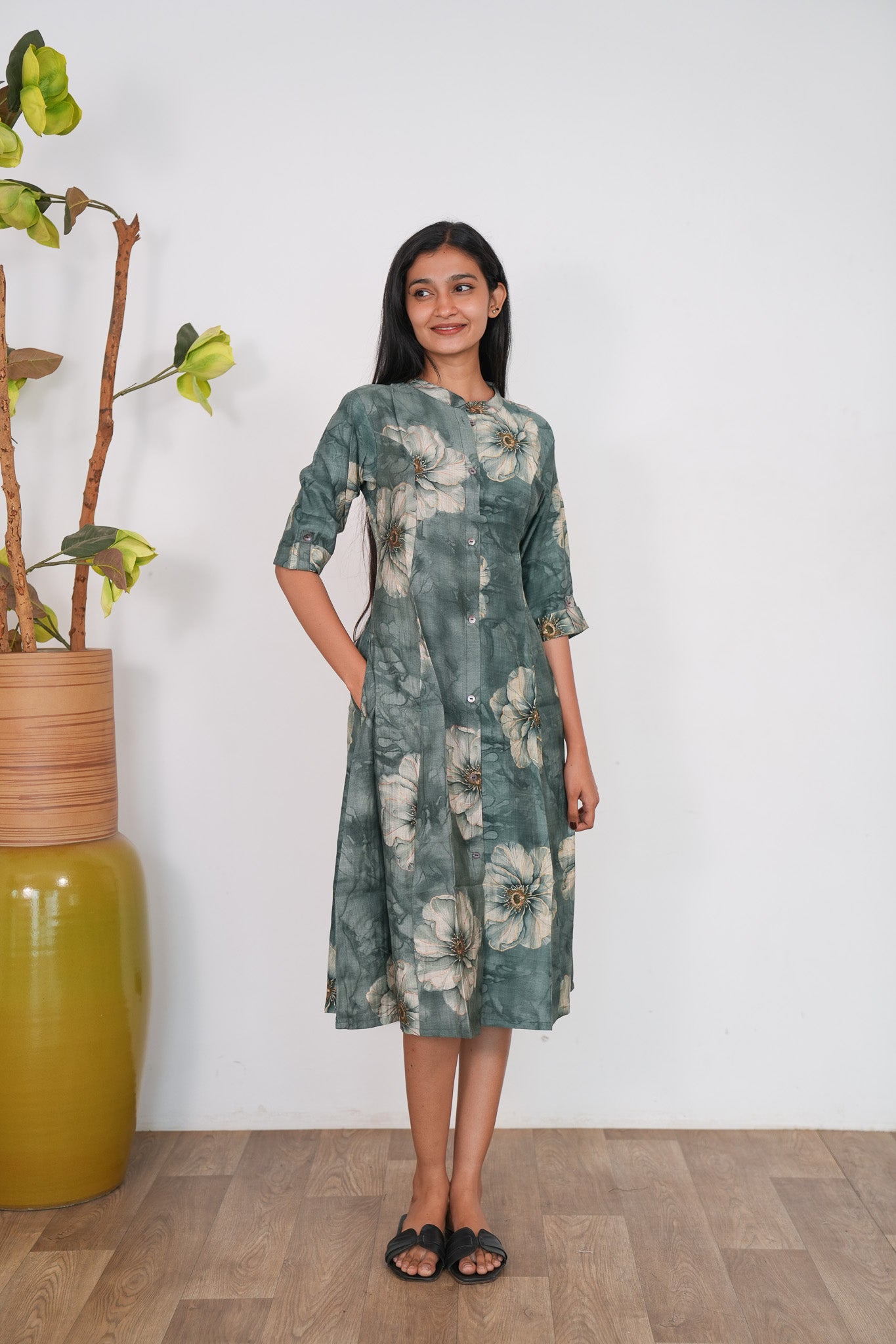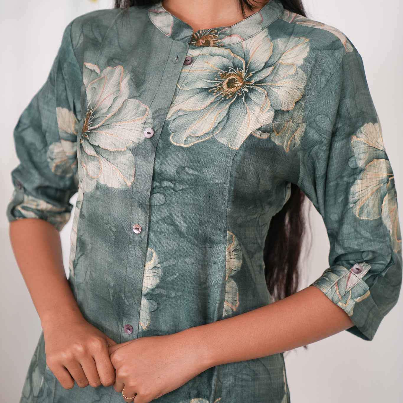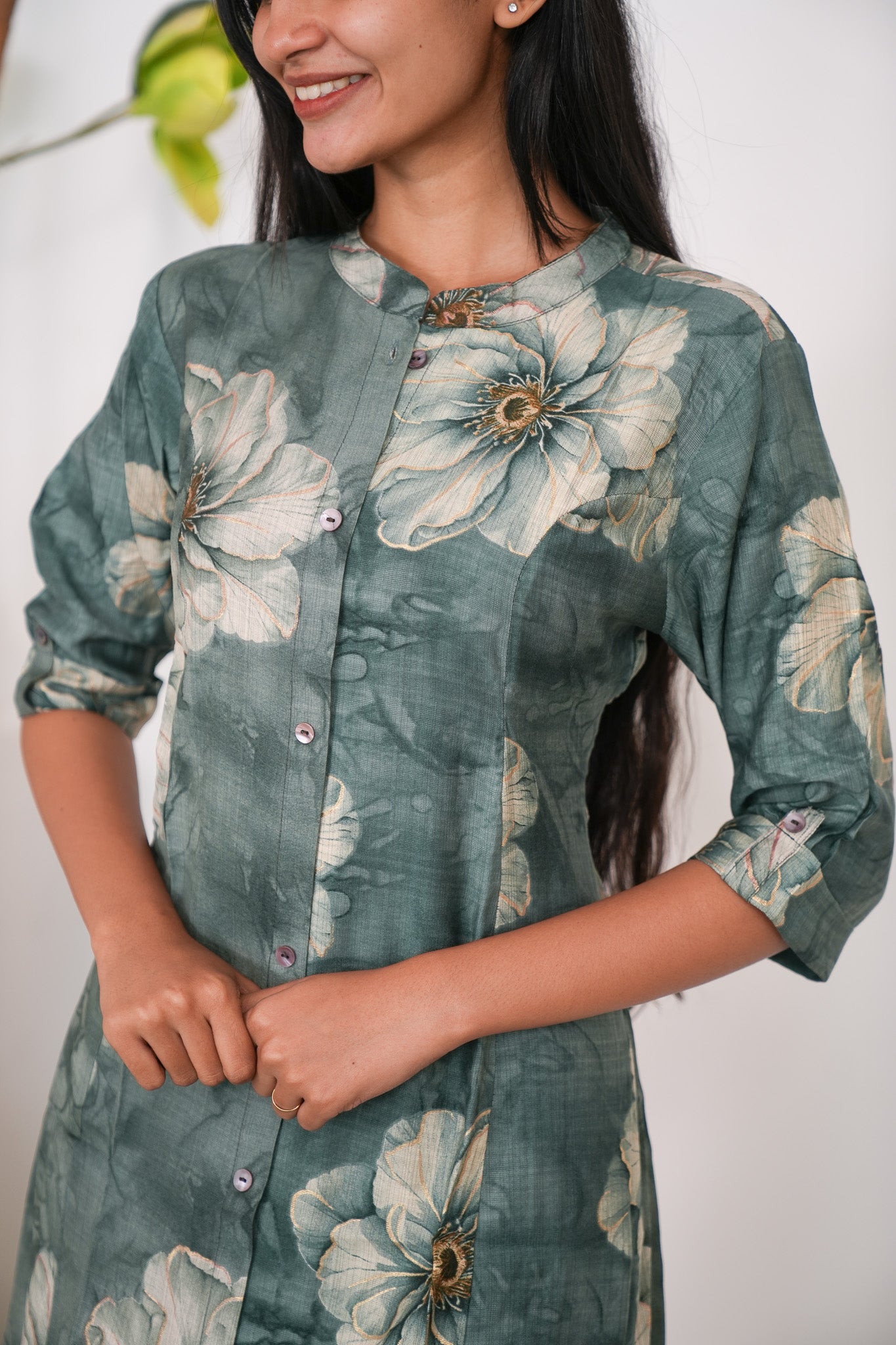 Emerald floral cotton shirt dress that exudes elegance and sophistication. It has buttons running down which cannot be opened.