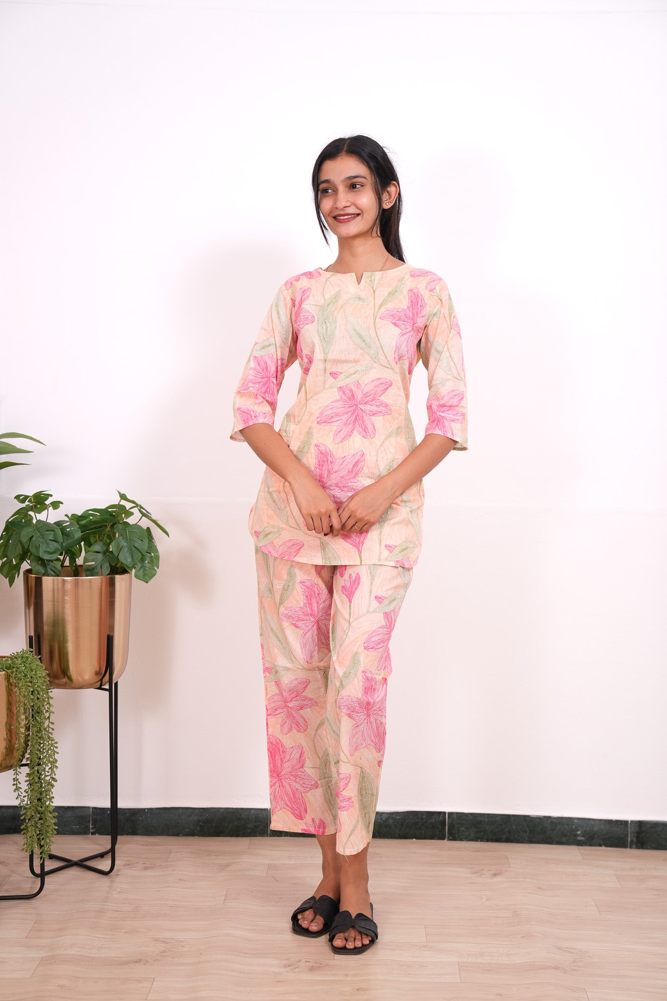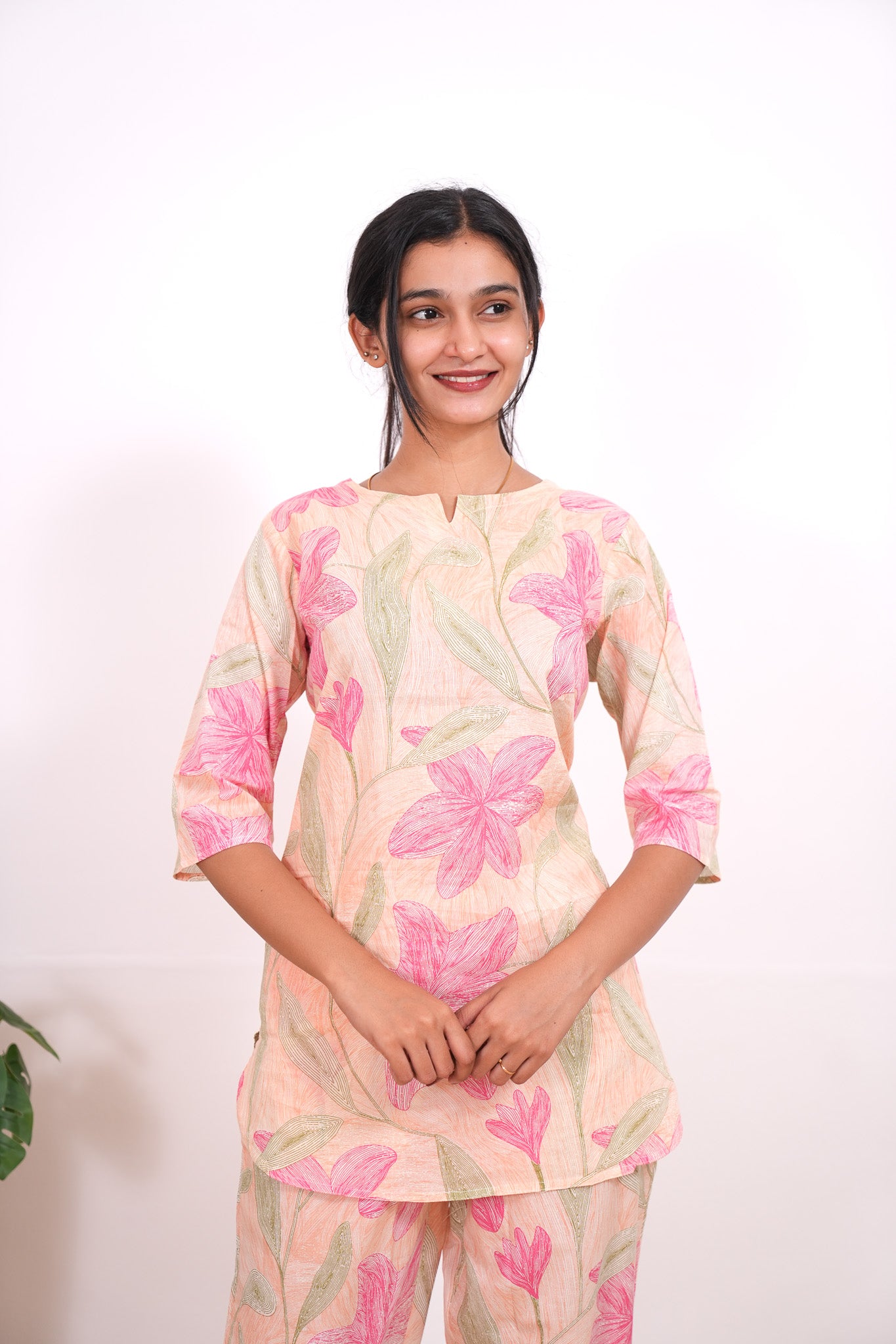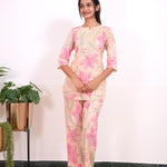 These Co-ords are so cozy, comfortable and chic making it perfect to relax at home or sleep in them. The top has a round neck with elbow length sleeves. Pant comes with elastic and it has a straight fit.