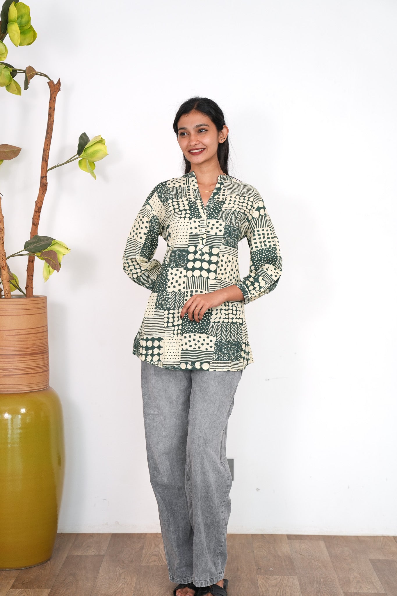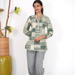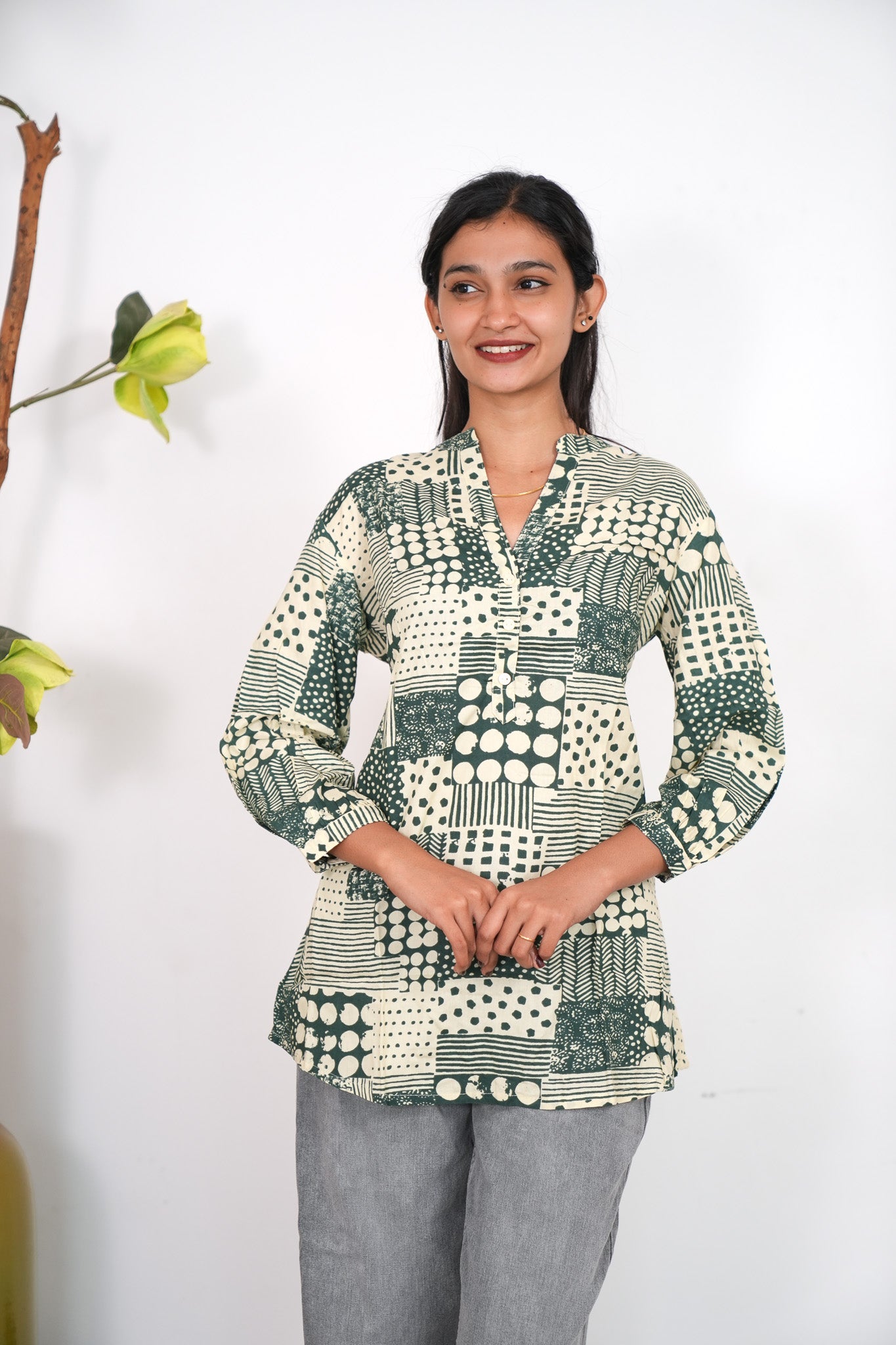 This short kurti has mandarin collar and 3/4 length sleeves they are extremely breathable and light weight making it perfect for all day comfort. They can be paired with jeans , skirt or even cotton pants.