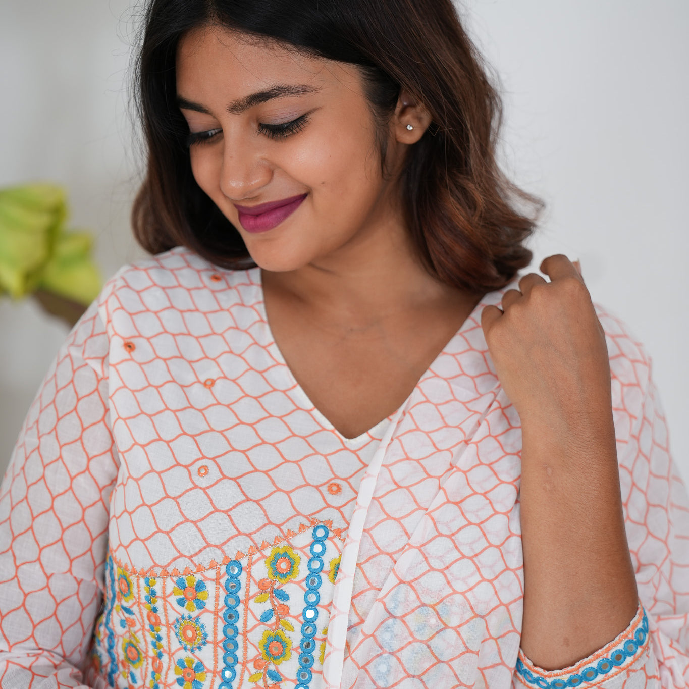 Orange checked floral long gown that exudes elegance and sophistication. It has floral print throughout the gown.
