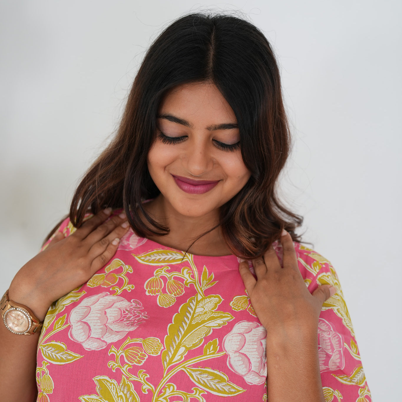 Hot pink floral  cotton dress with half sleeves and round neck. The fabric and prints are top notch.. which are perfect for brunch, shopping or just a cozy day at home!! you can wear just as a dress or add jeans to add some modesty whichever you find it suitable and comfortable..