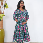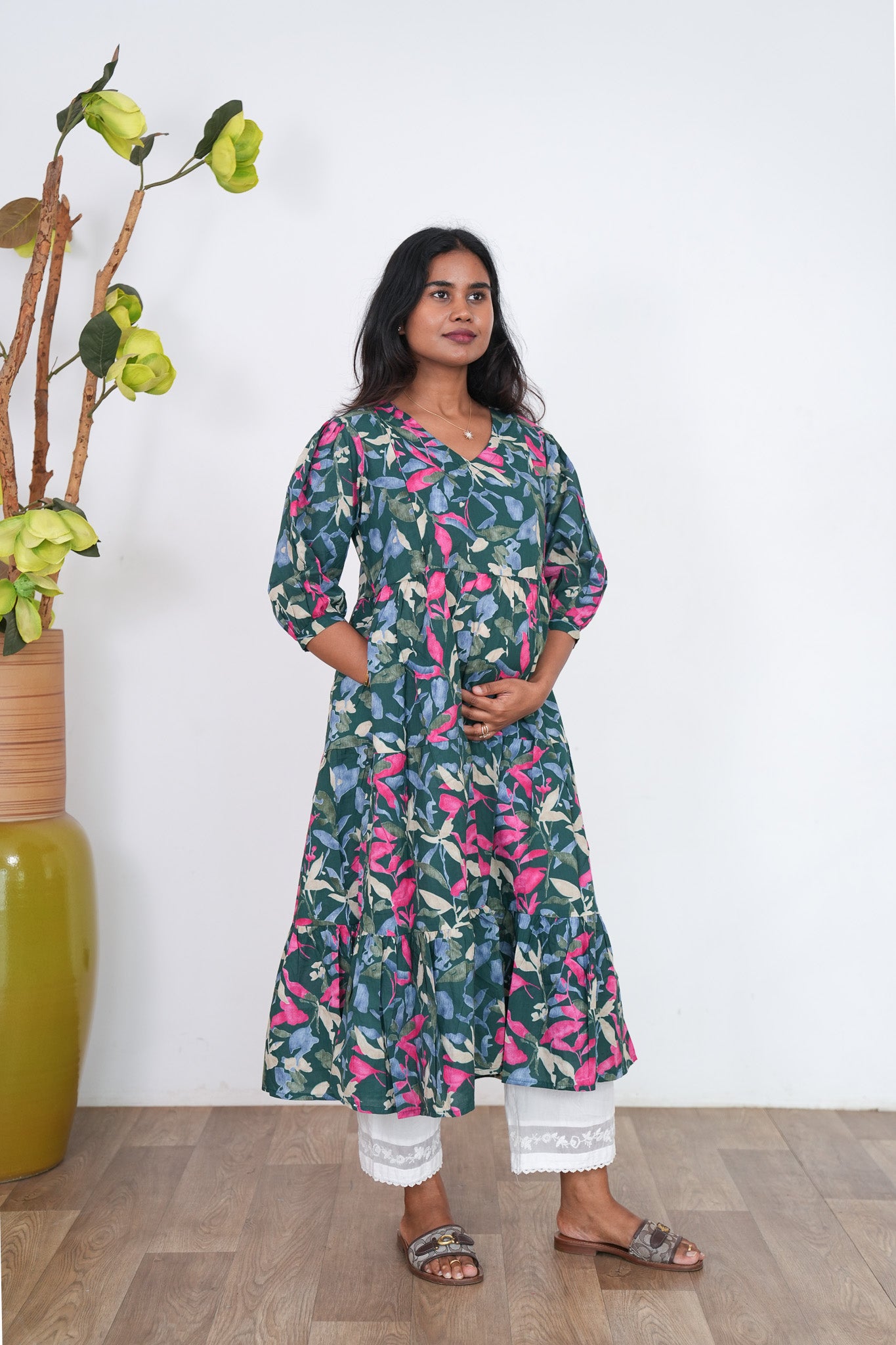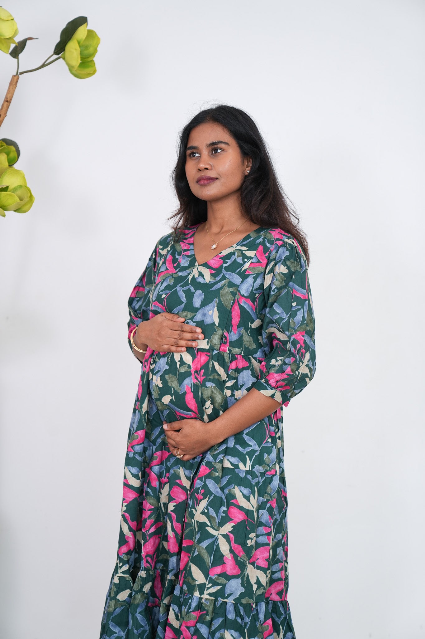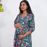 Hunter green fern maternity nursing wear with V neck and 3/4 sleeves that accomodates the bump throughout nine months and has invisible zip on both sides to carefully feed baby. It is light weight and soft to help you get through pregnancy and breastfeeding journey with ease.