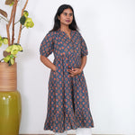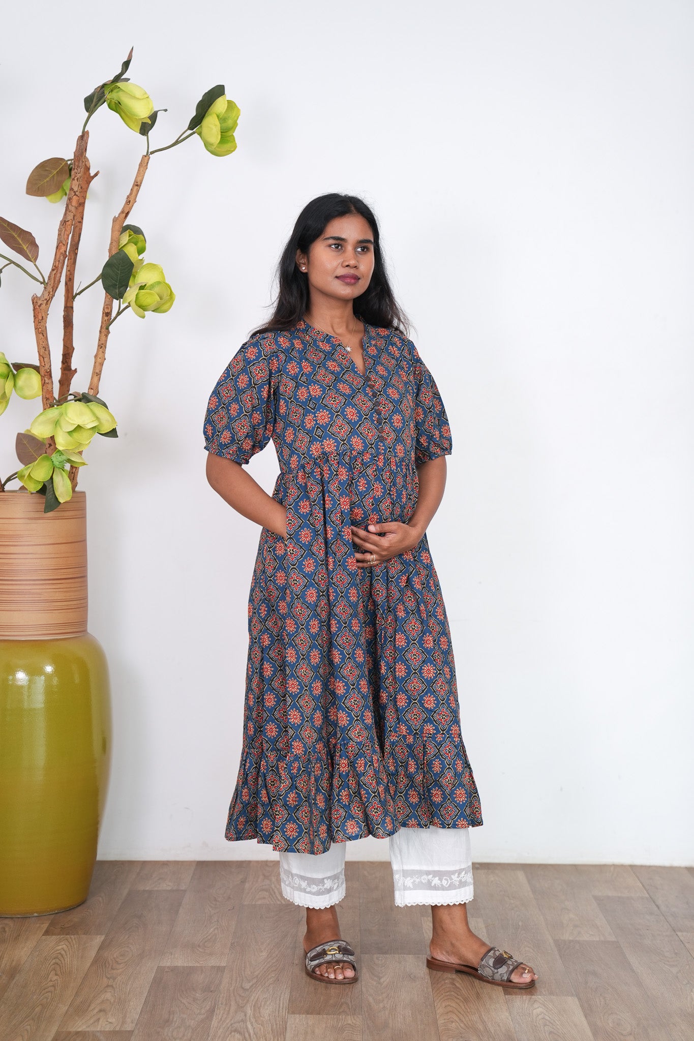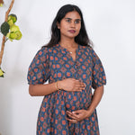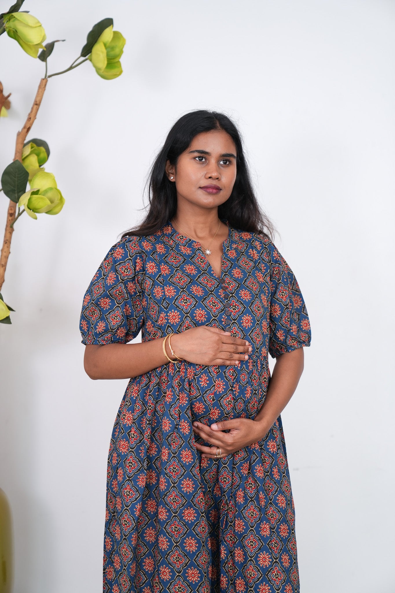 Indigo cotton maternity nursing midi dress with mandarin neck and balloon sleeves. that accomodates the bump throughout nine months and has invisible zip on both sides to carefully feed baby. It is light weight and soft to help you get through pregnancy and breastfeeding journey with ease.