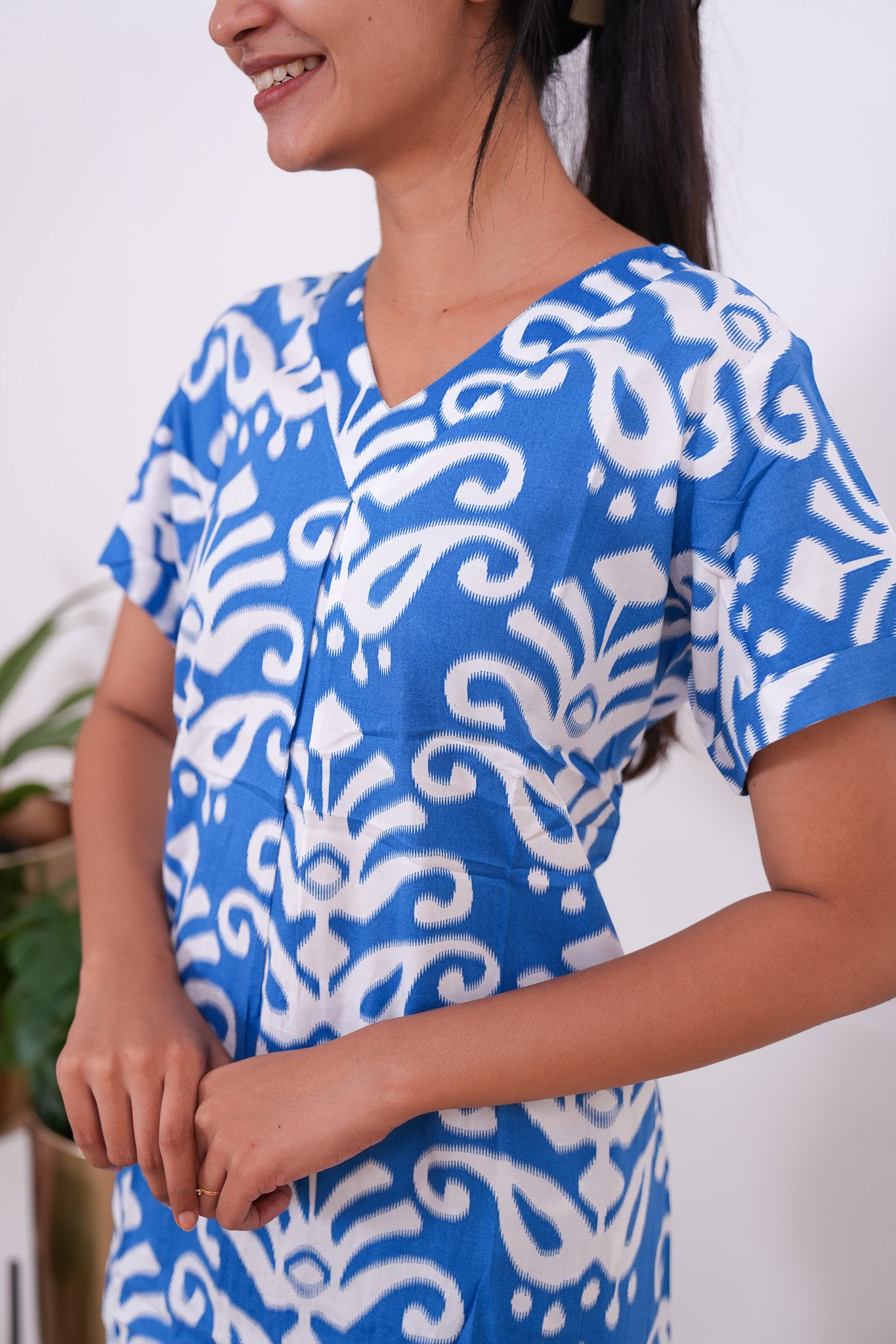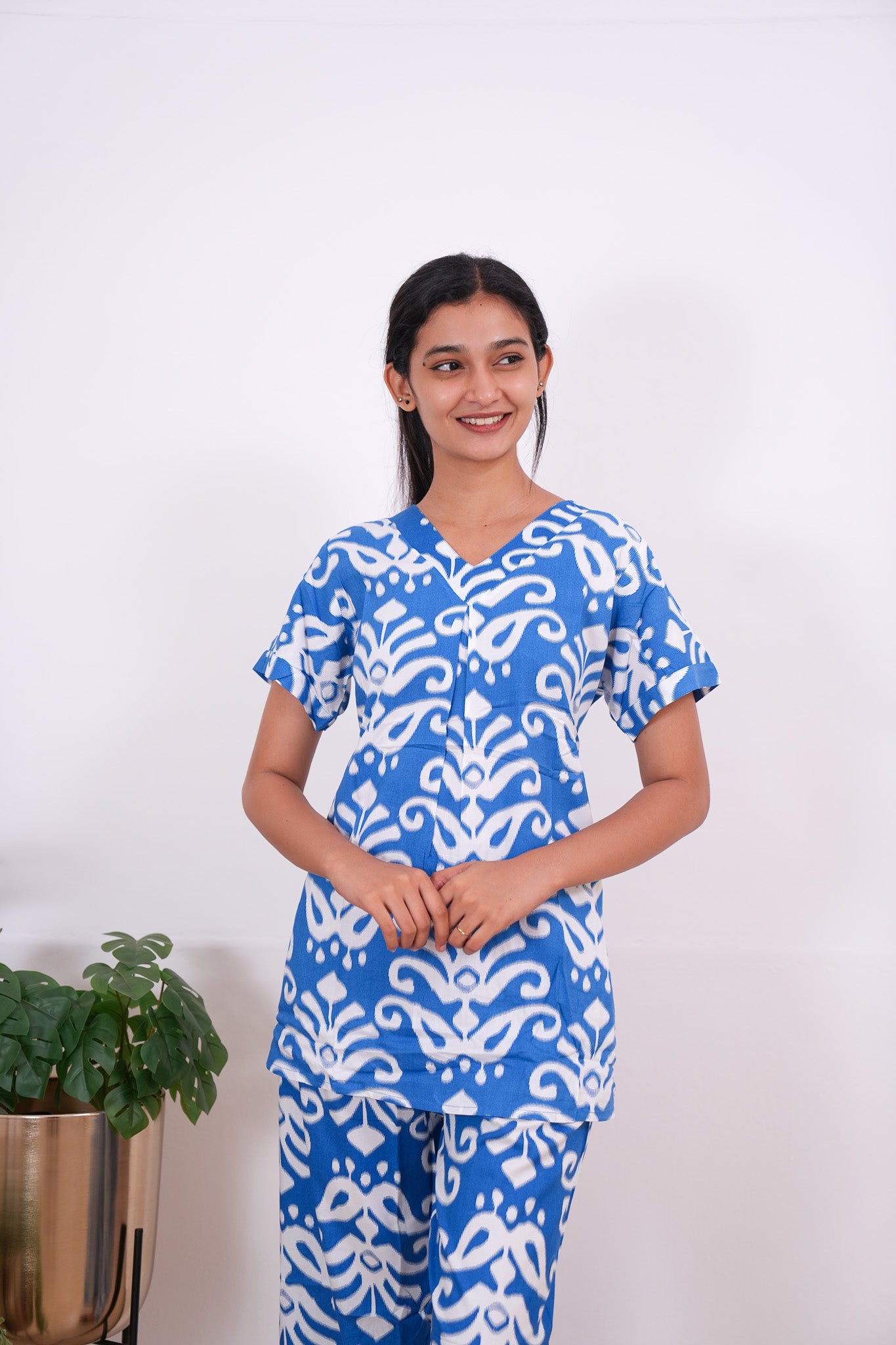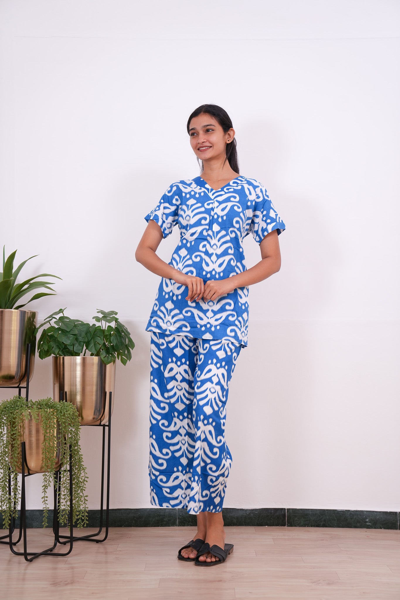 These Co-ords are so cozy, comfortable and chic making it perfect to relax at home or sleep in them. The top has a V neck with short length sleeves. Pant comes with elastic and it has a straight fit.