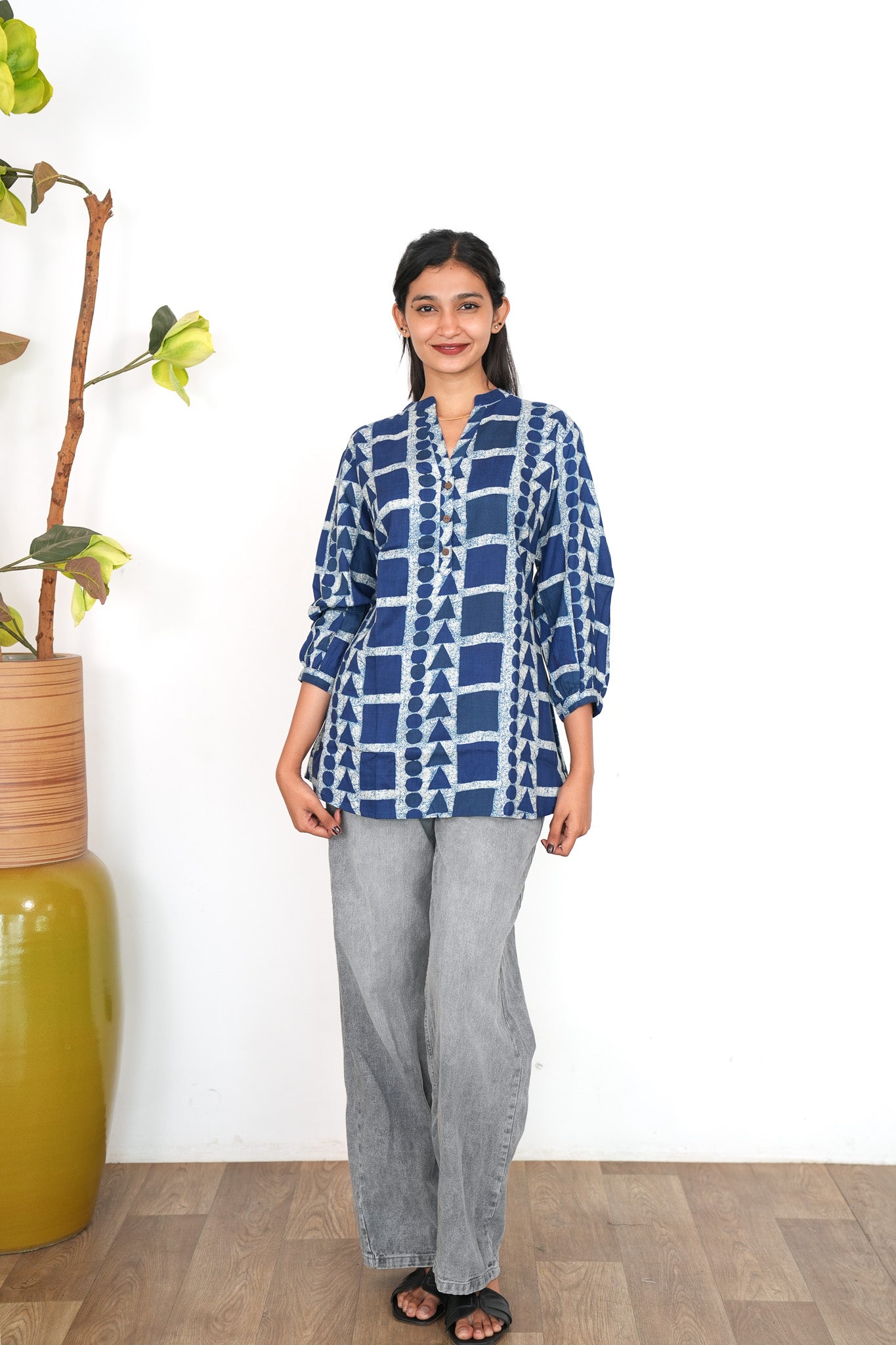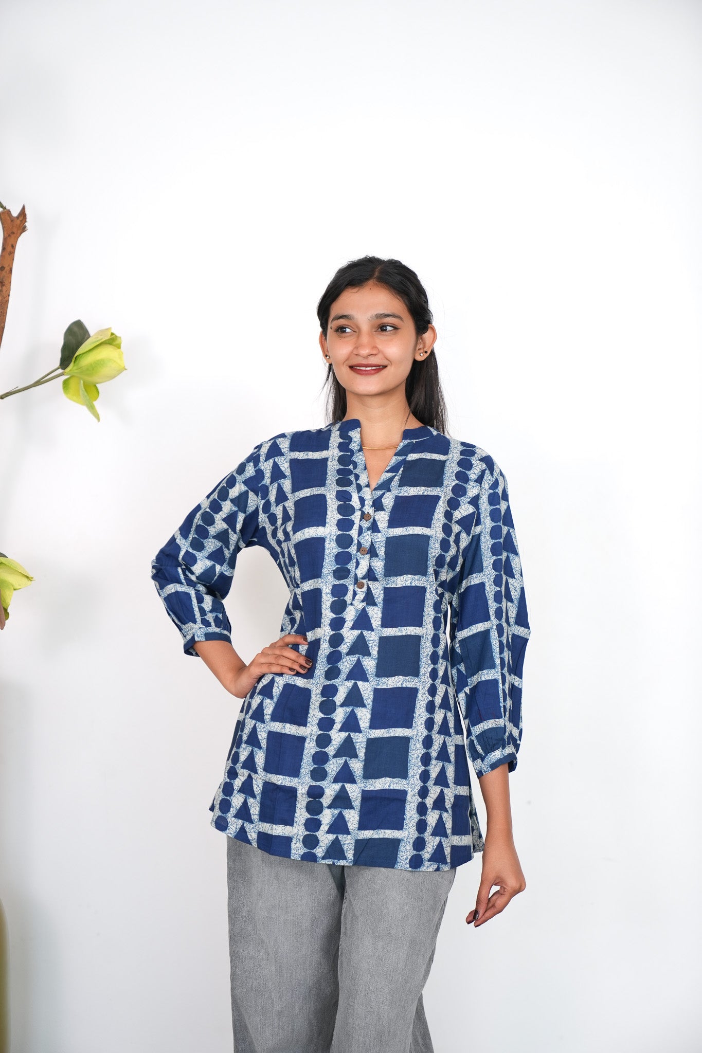 This short kurti has mandarin collar and 3/4 length sleeves they are extremely breathable and light weight making it perfect for all day comfort. They can be paired with jeans , skirt or even cotton pants.