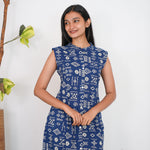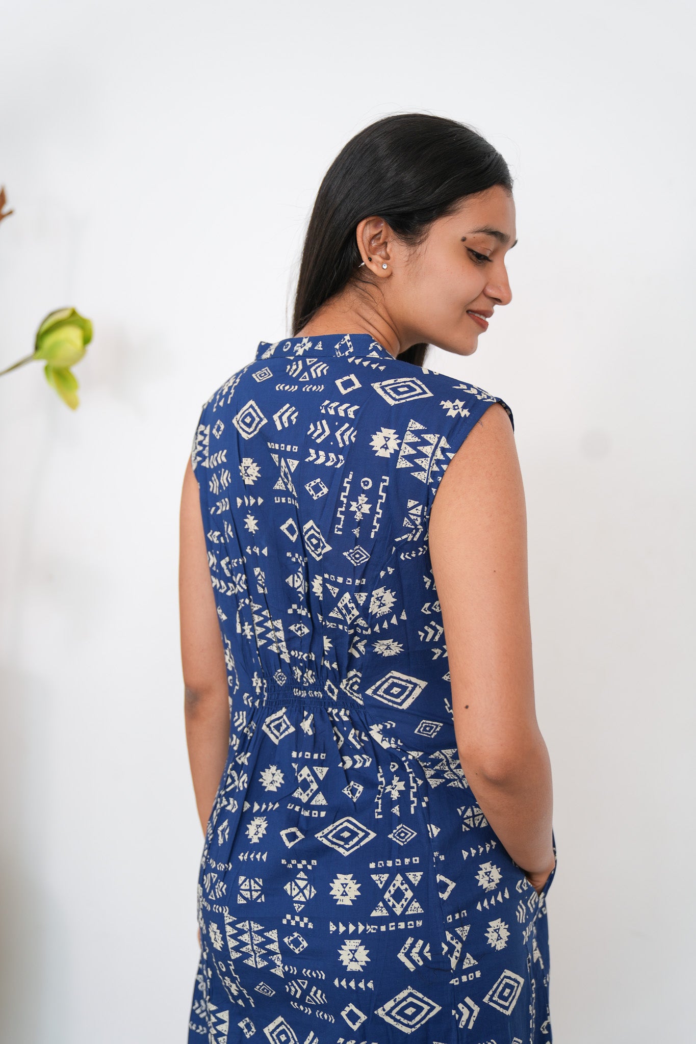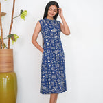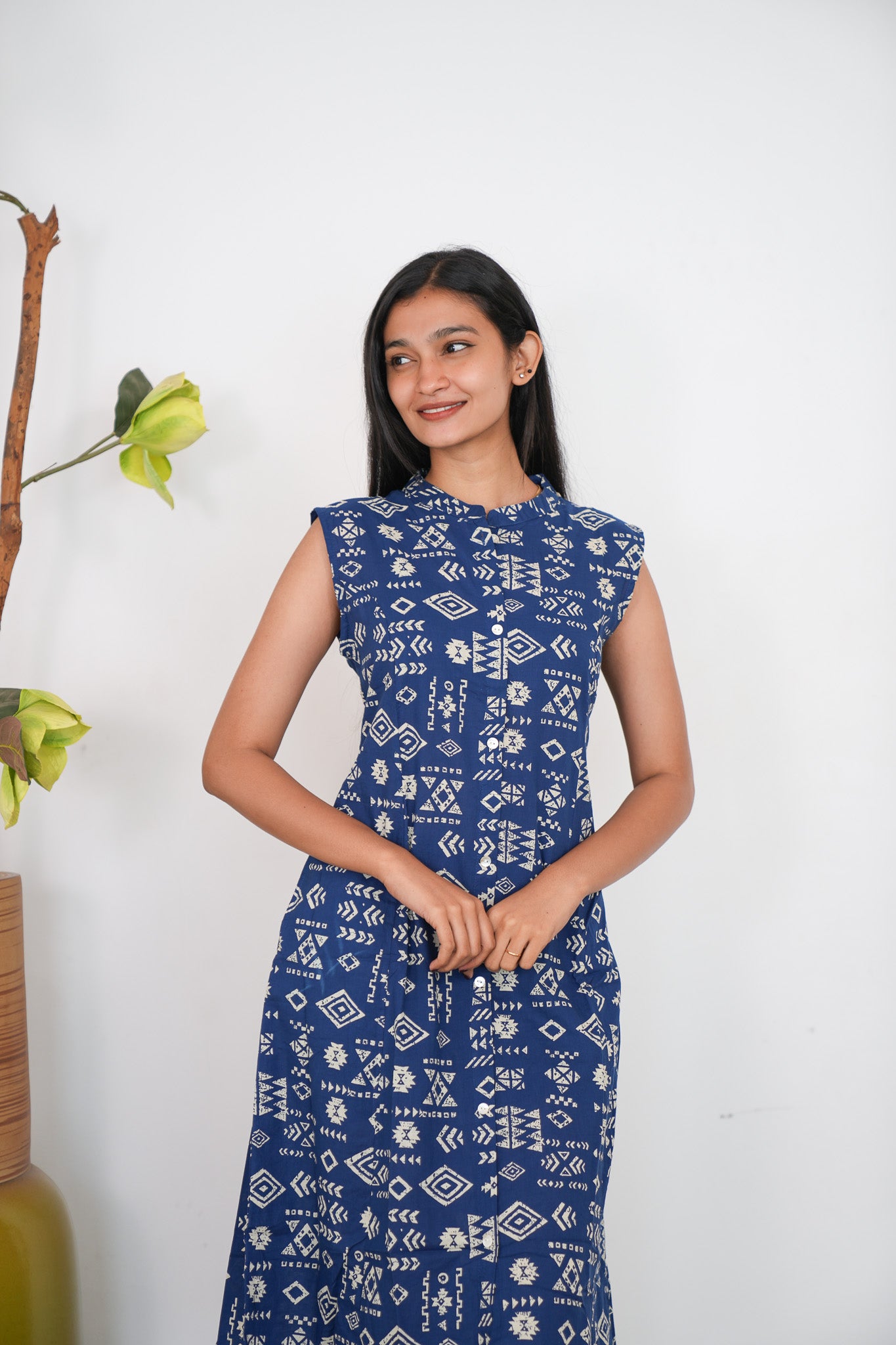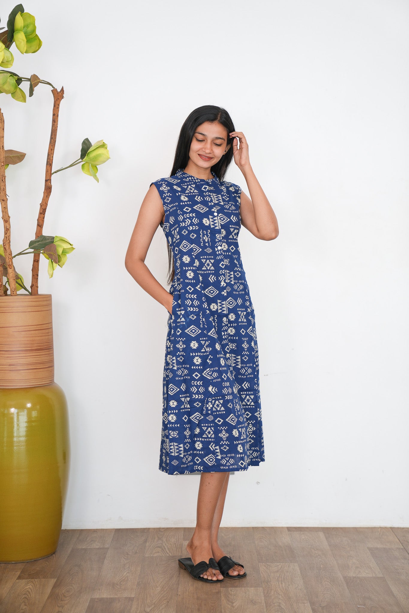 Indigo mandarin cotton shirt dress that exudes elegance and sophistication. It has buttons running down. Buttons cannot be opened.