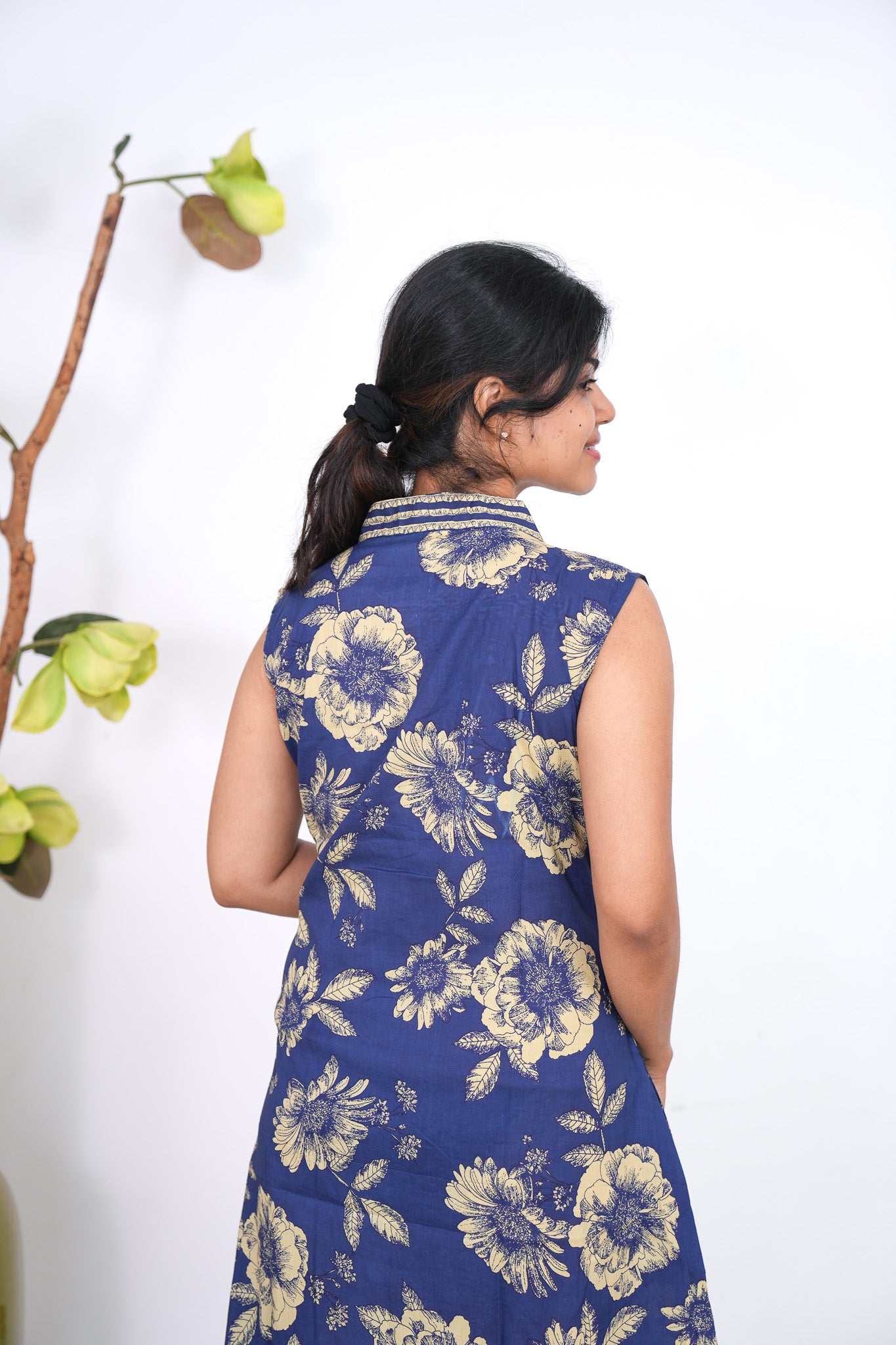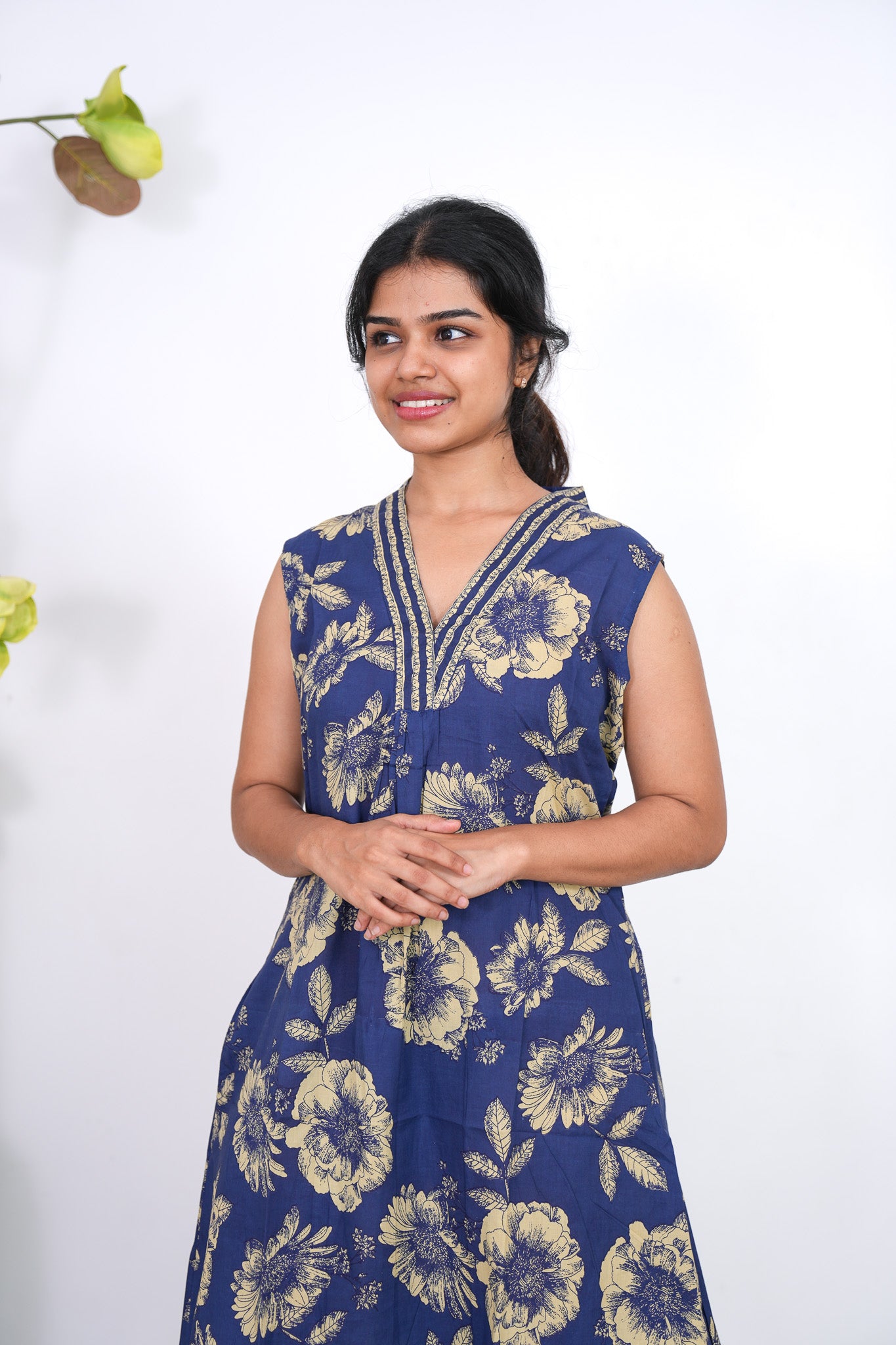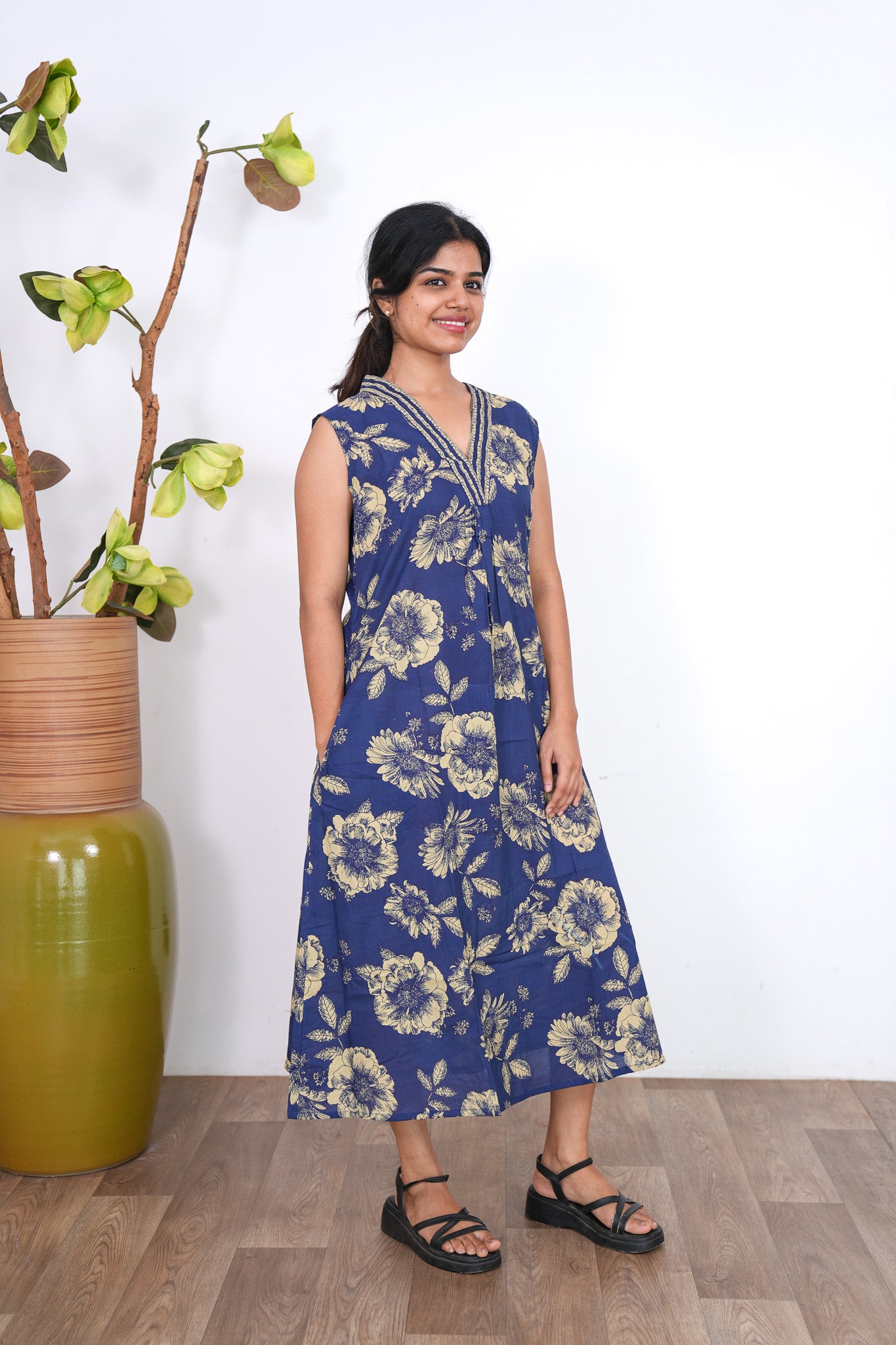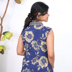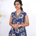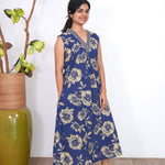Ira cotton v neck gathered dress -Indigo(attached sleeves)