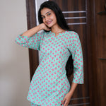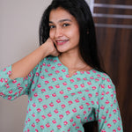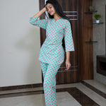 These Co-ords are so cozy, comfortable and chic making it perfect to relax at home or sleep in them. The top has a round neck with elbow length sleeves. Pant comes with elastic and has pockets.