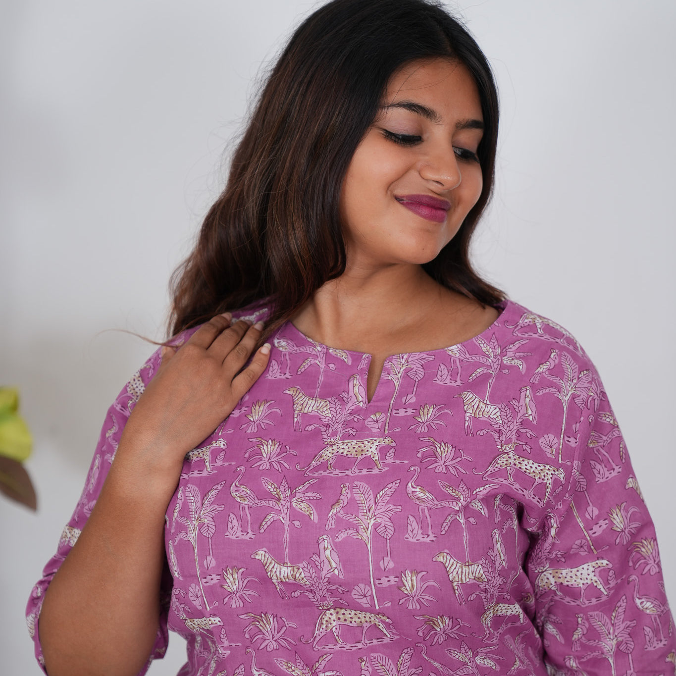 These Co-ords are so cozy, comfortable and chic making it perfect to relax at home or sleep in them. The top has a round neck with elbow length sleeves. Pant comes with elastic and has pockets.