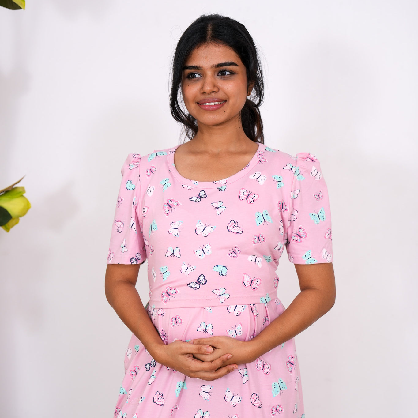 This maternity nursing wear with round neck and short sleeves that accomodates the bump throughout nine months and has lift up pattern for ease of nursing the baby. It is light weight and soft to help you get through pregnancy and breastfeeding journey with ease.