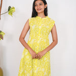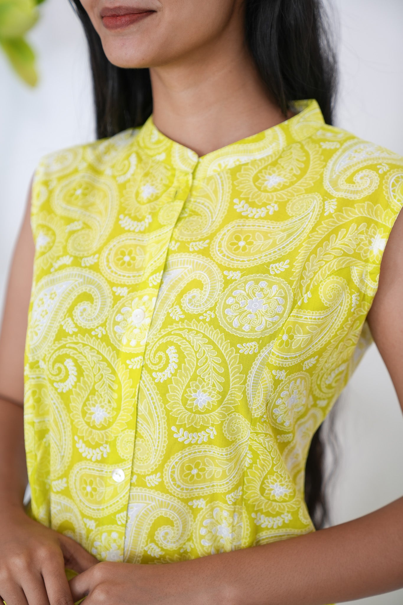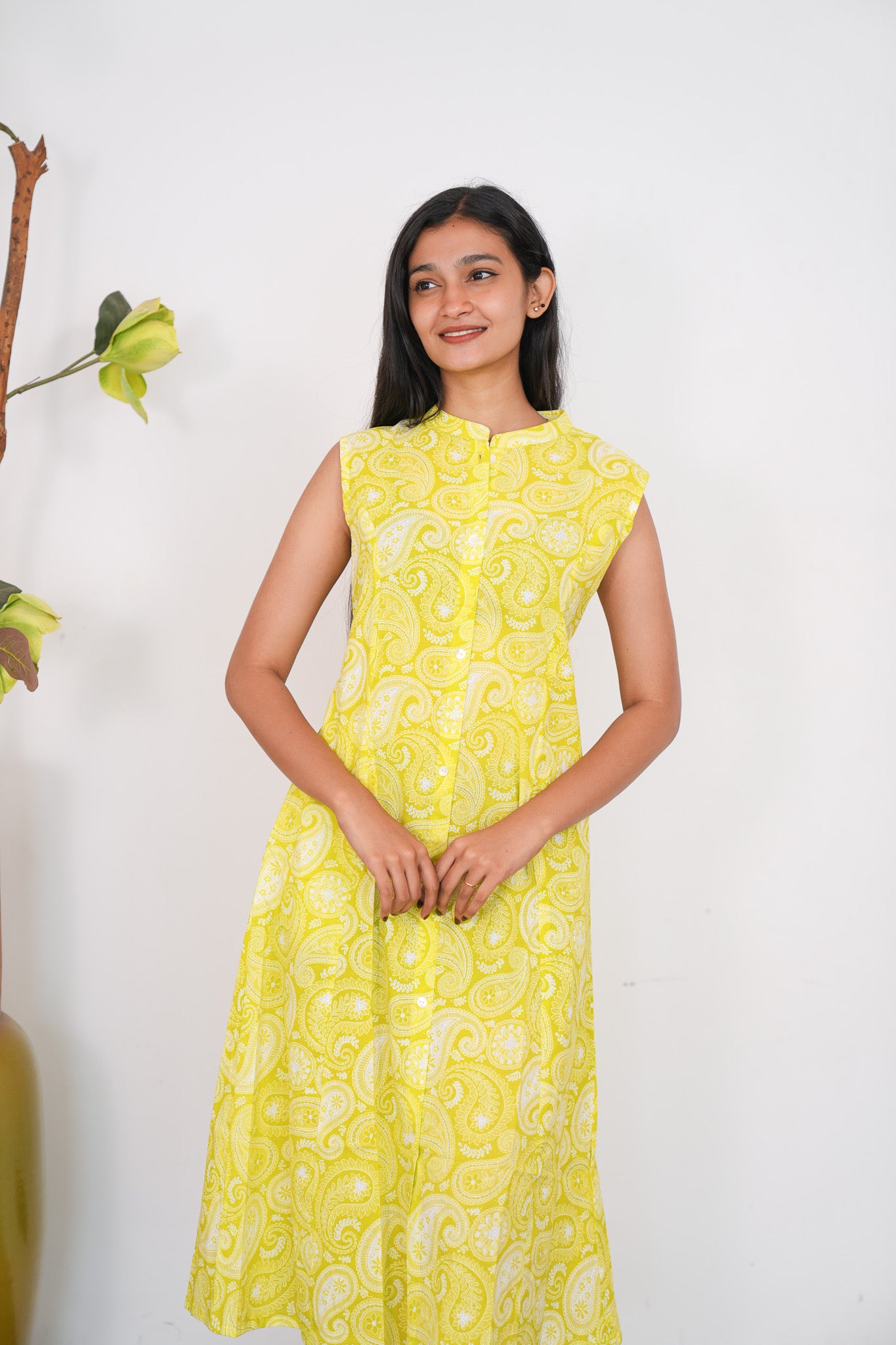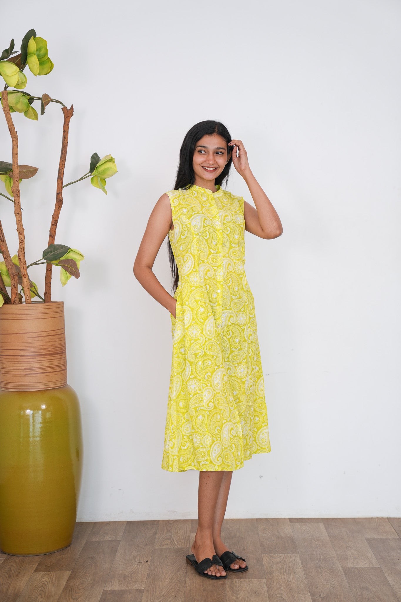 Lemon yellow mandarin cotton shirt dress that exudes elegance and sophistication. It has buttons running down. Buttons cannot be opened.