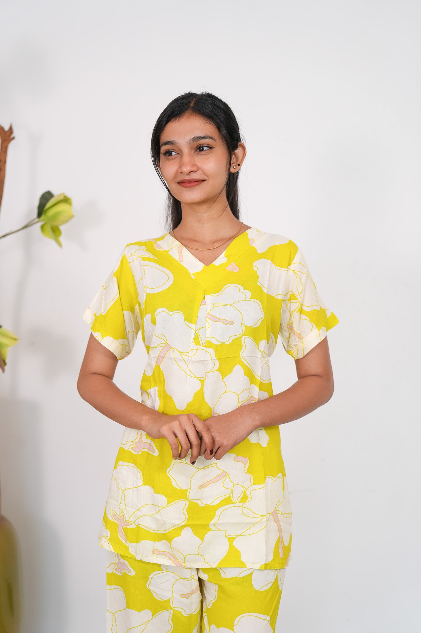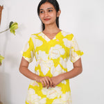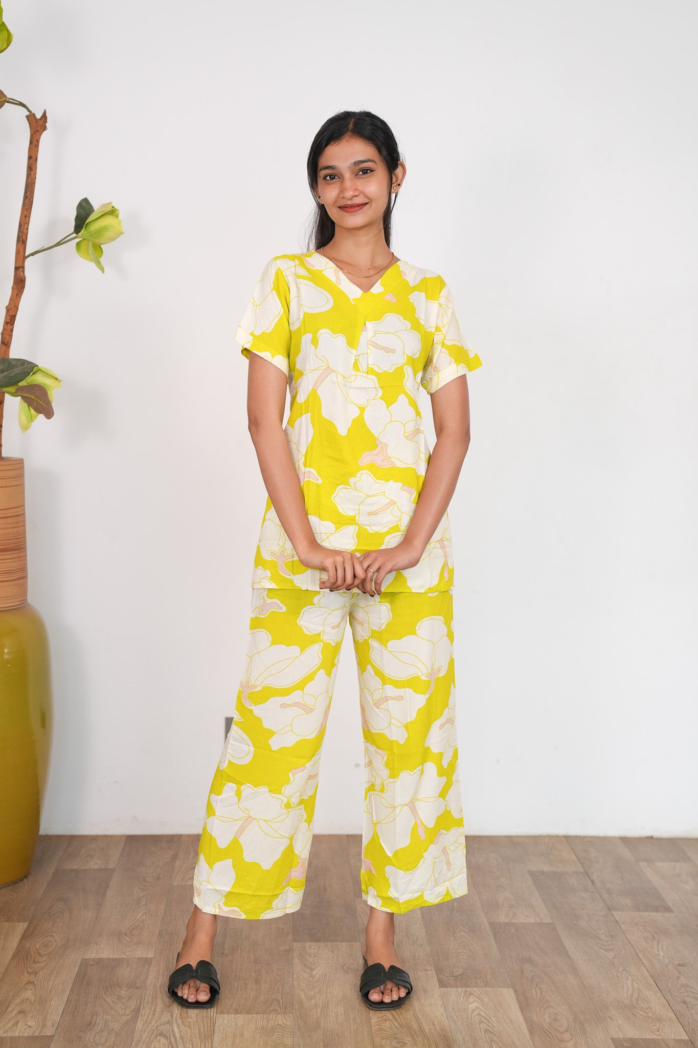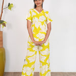 These Co-ords are so cozy, comfortable and chic making it perfect to relax at home or sleep in them. The top has a V neck with short length sleeves. Pant comes with elastic and it has a straight fit.