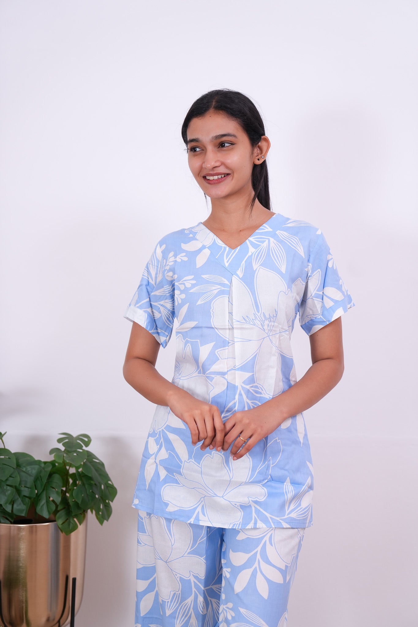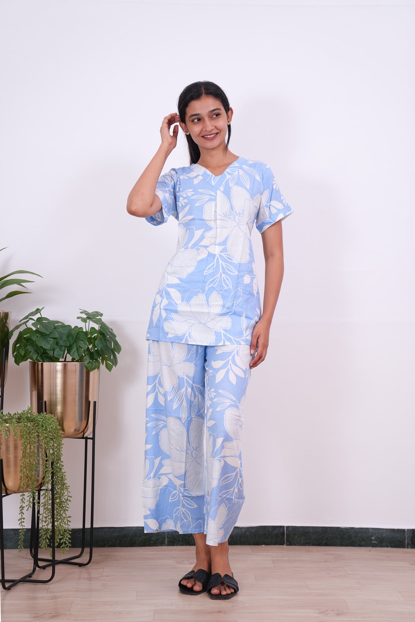 These Co-ords are so cozy, comfortable and chic making it perfect to relax at home or sleep in them. The top has a V neck with short length sleeves. Pant comes with elastic and it has a straight fit.