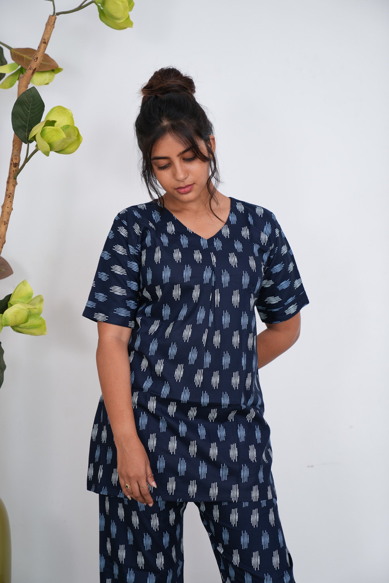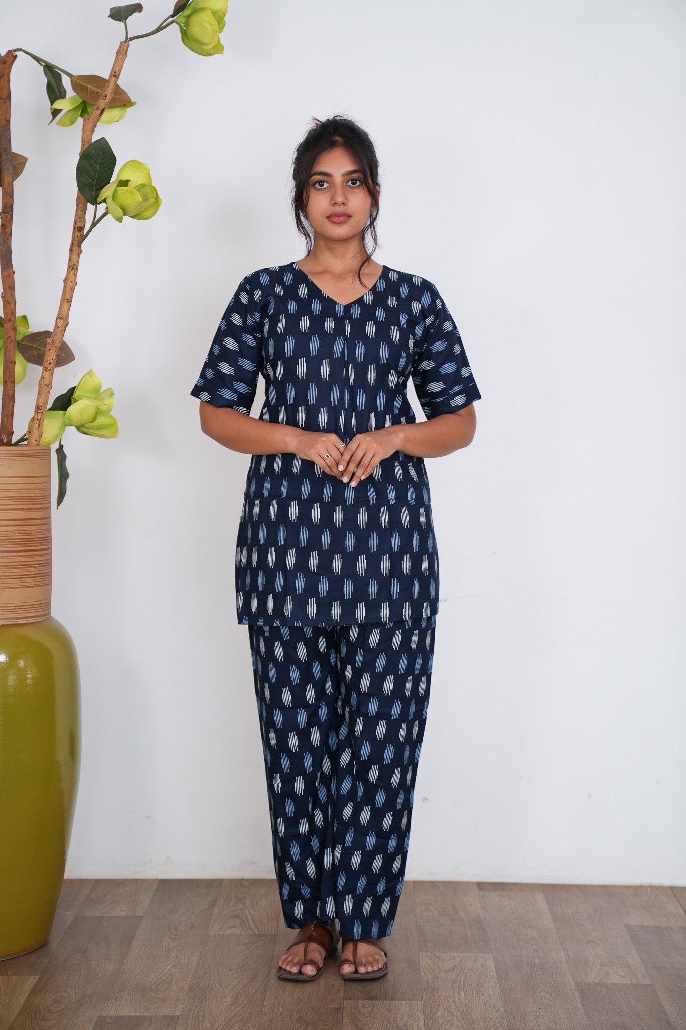These Co-ords are so cozy, comfortable and chic making it perfect to relax at home or sleep in them. The top has a V neck with short length sleeves. Pant comes with elastic and it has a straight fit.