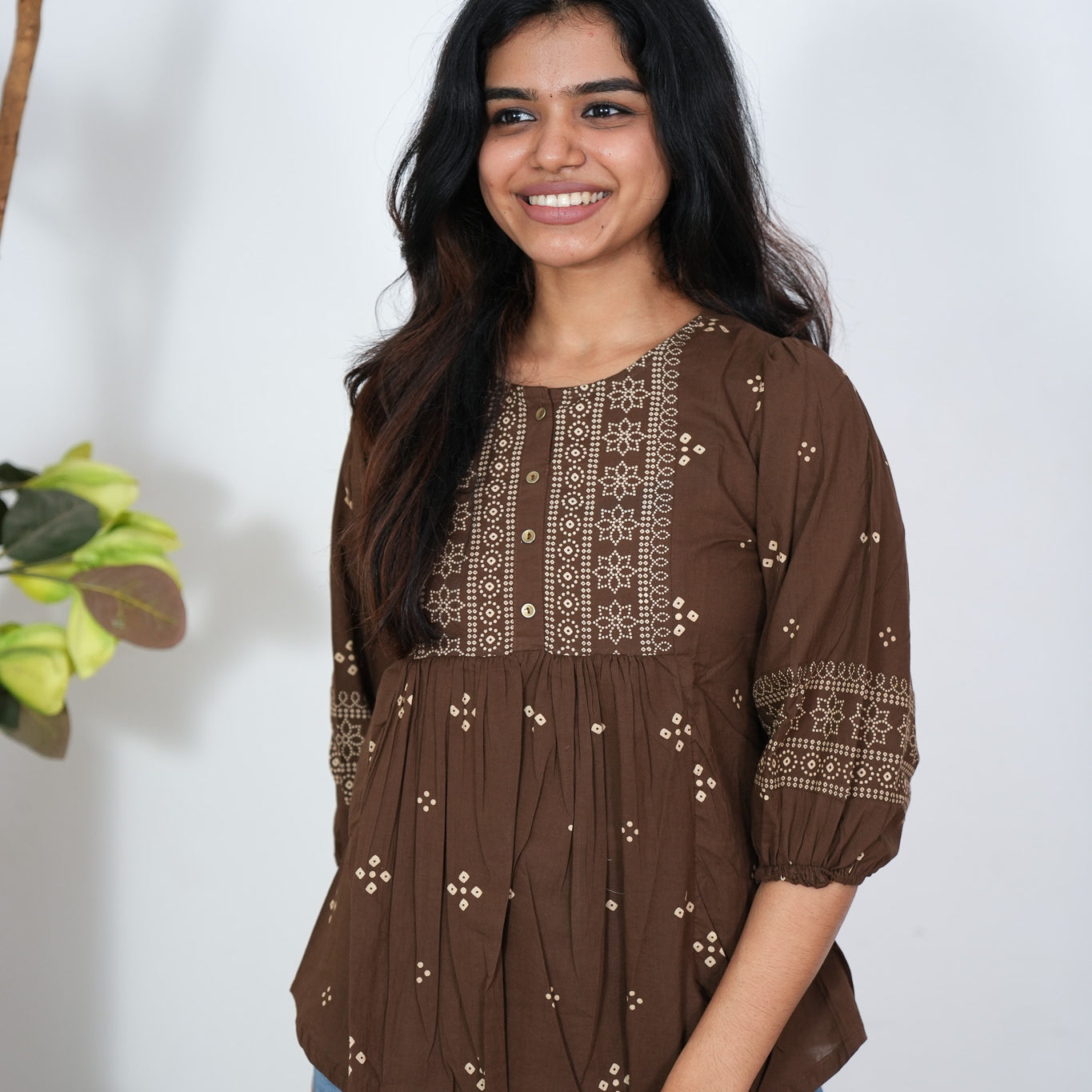 The top has round neck with elbow length sleeves. It has beautiful bandhani pattern all over the top with peplum style. It can be paired with jeans or skirt to complete the look.